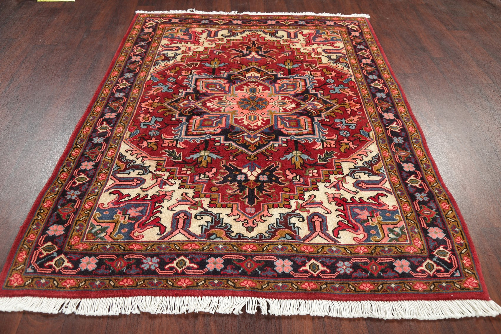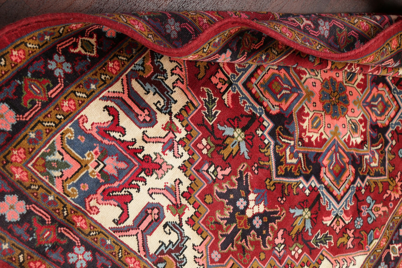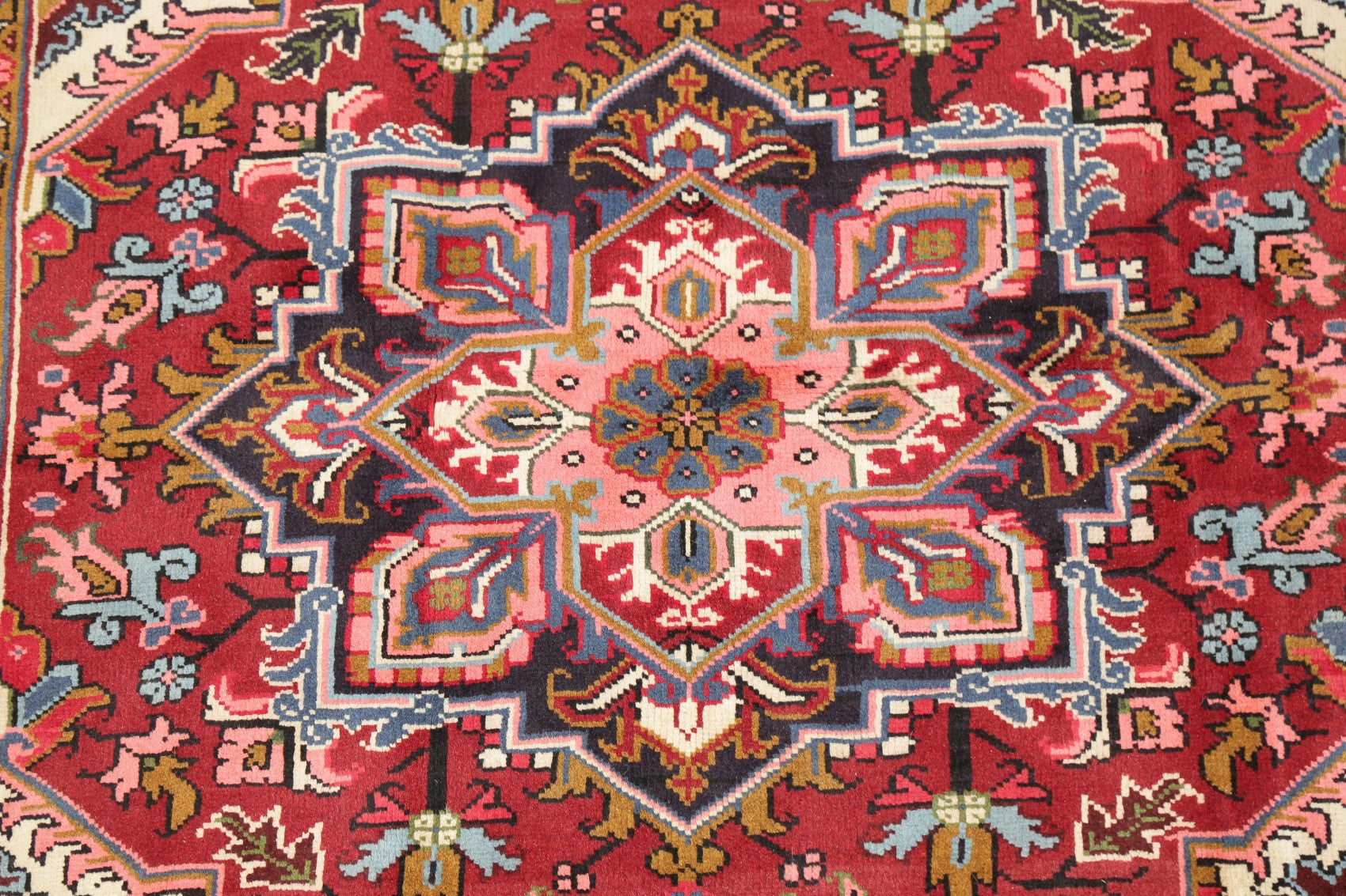 A Beautiful Genuine Persia ( Persia ) Heriz rug is Hand Knotted by skillful weavers in Persia ( Persia ) with 100% Wool Material. This rug is in New, First Quality condition. dimensions are 6' 3'' X 5' 0'' in foot and 191 X 152 in centimeter. the primary color is Red.