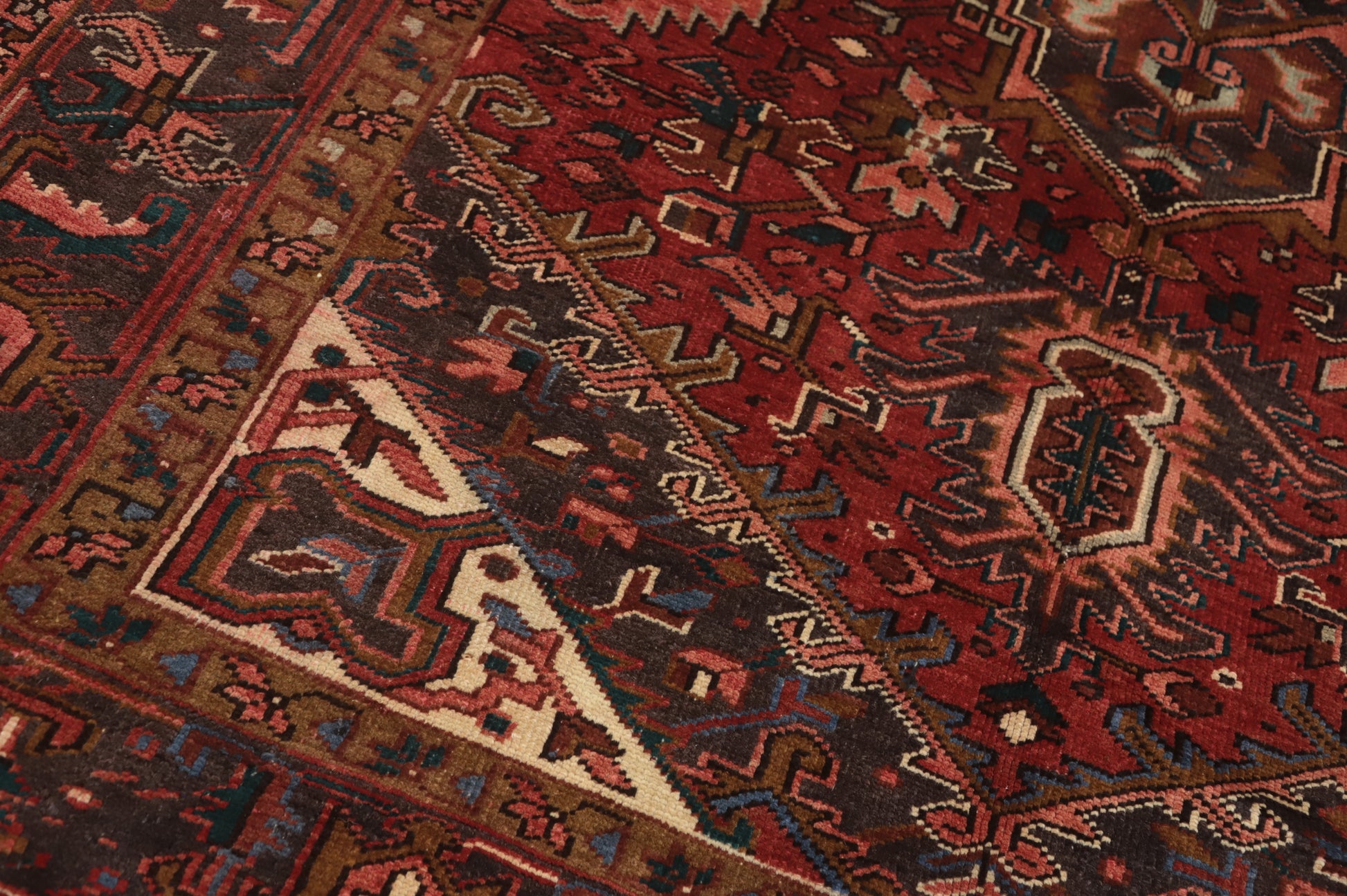 A Beautiful Genuine Persia ( Persia ) Heriz rug is Hand Knotted by skillful weavers in Persia ( Persia ) with 100% Wool Material. This rug is in Very Good condition. dimensions are 11' 4'' X 6' 5'' in foot and 345 X 196 in centimeter. the primary color is Red.