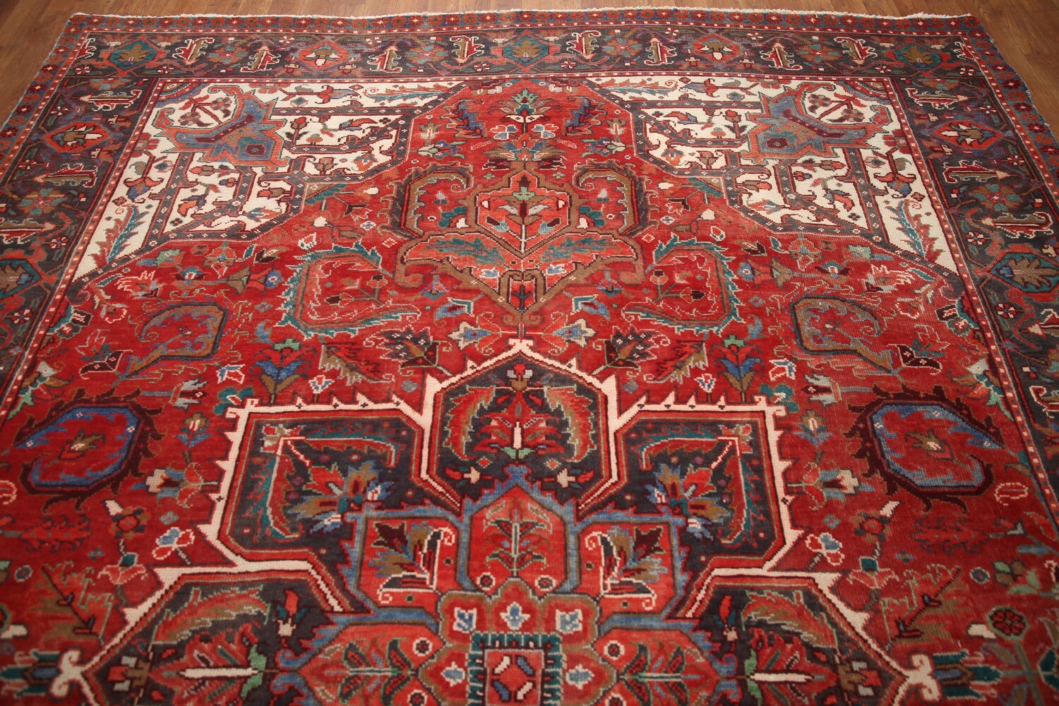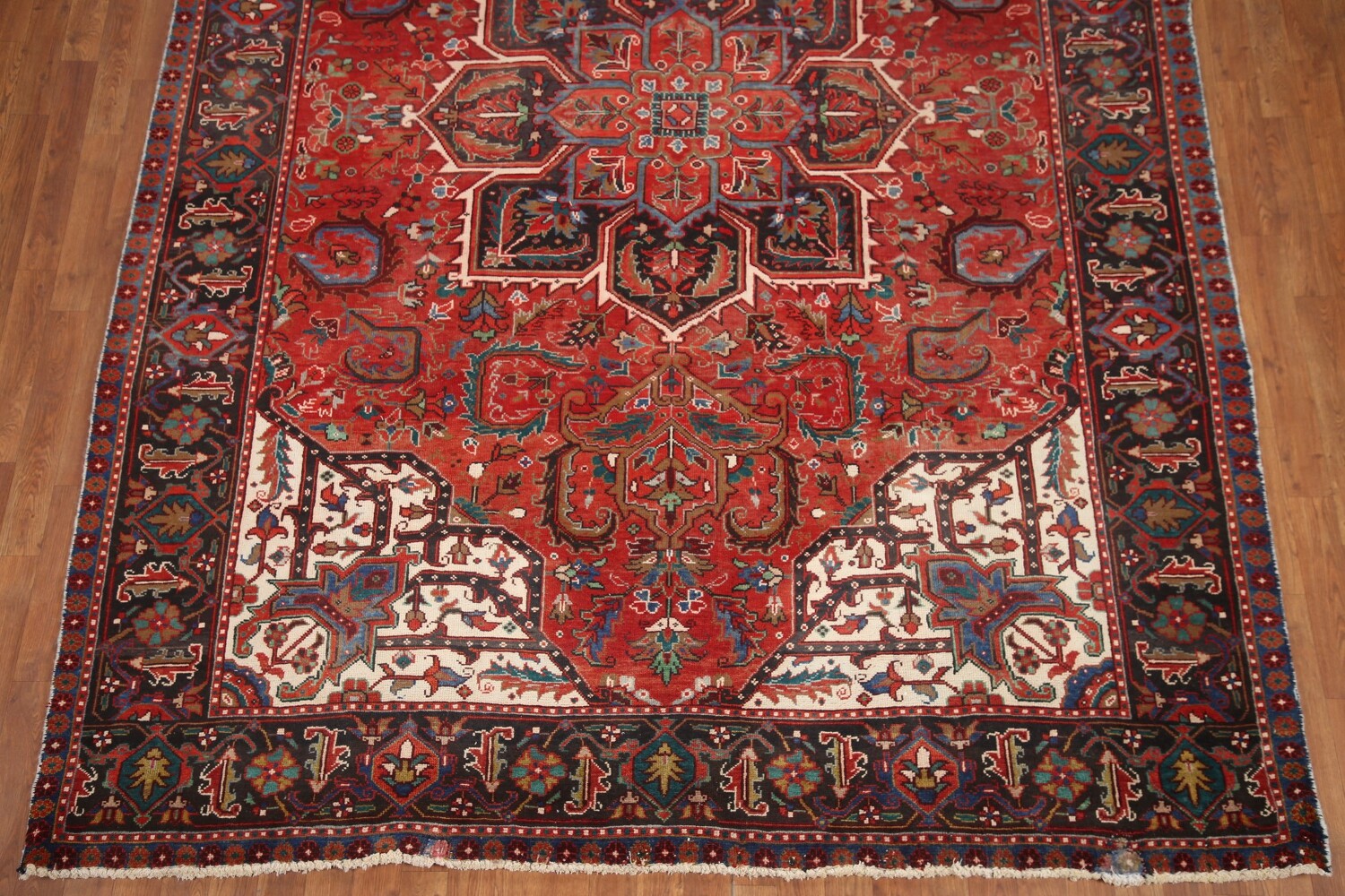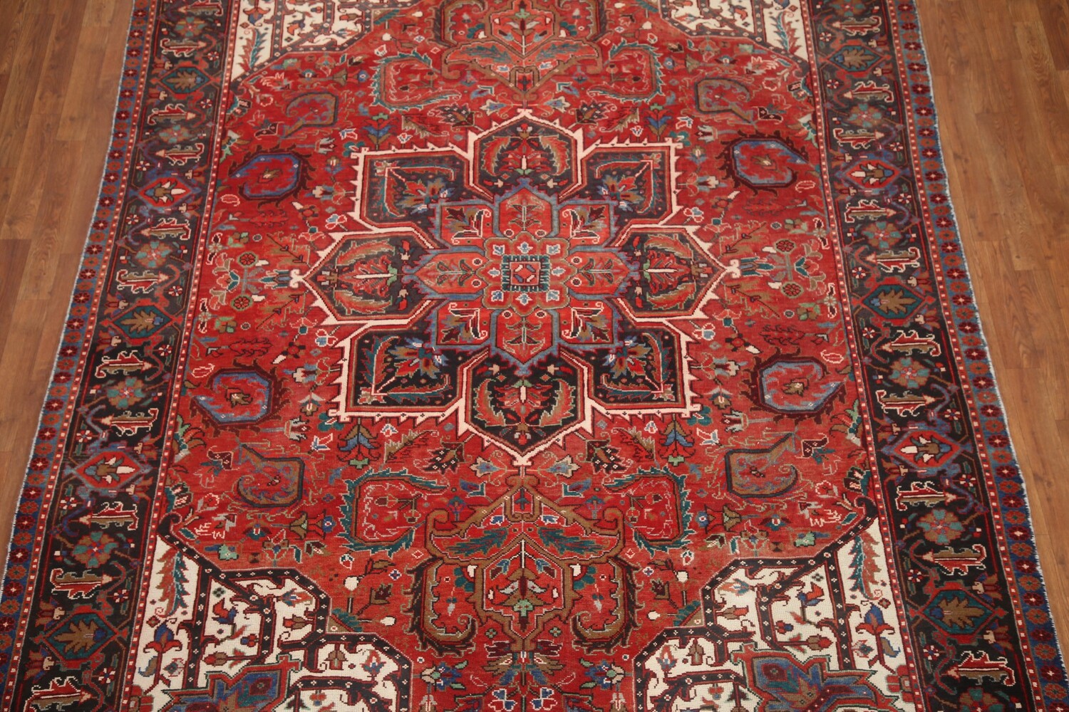 A Beautiful Genuine Persia ( Persia ) Heriz rug is Hand Knotted by skillful weavers in Persia ( Persia ) with 100% Wool Material. This rug is in Very Good ( Evenly Low Pile-Repair) condition. dimensions are 11' 0'' X 7' 8'' in foot and 335 X 234 in centimeter. the primary color is Red.