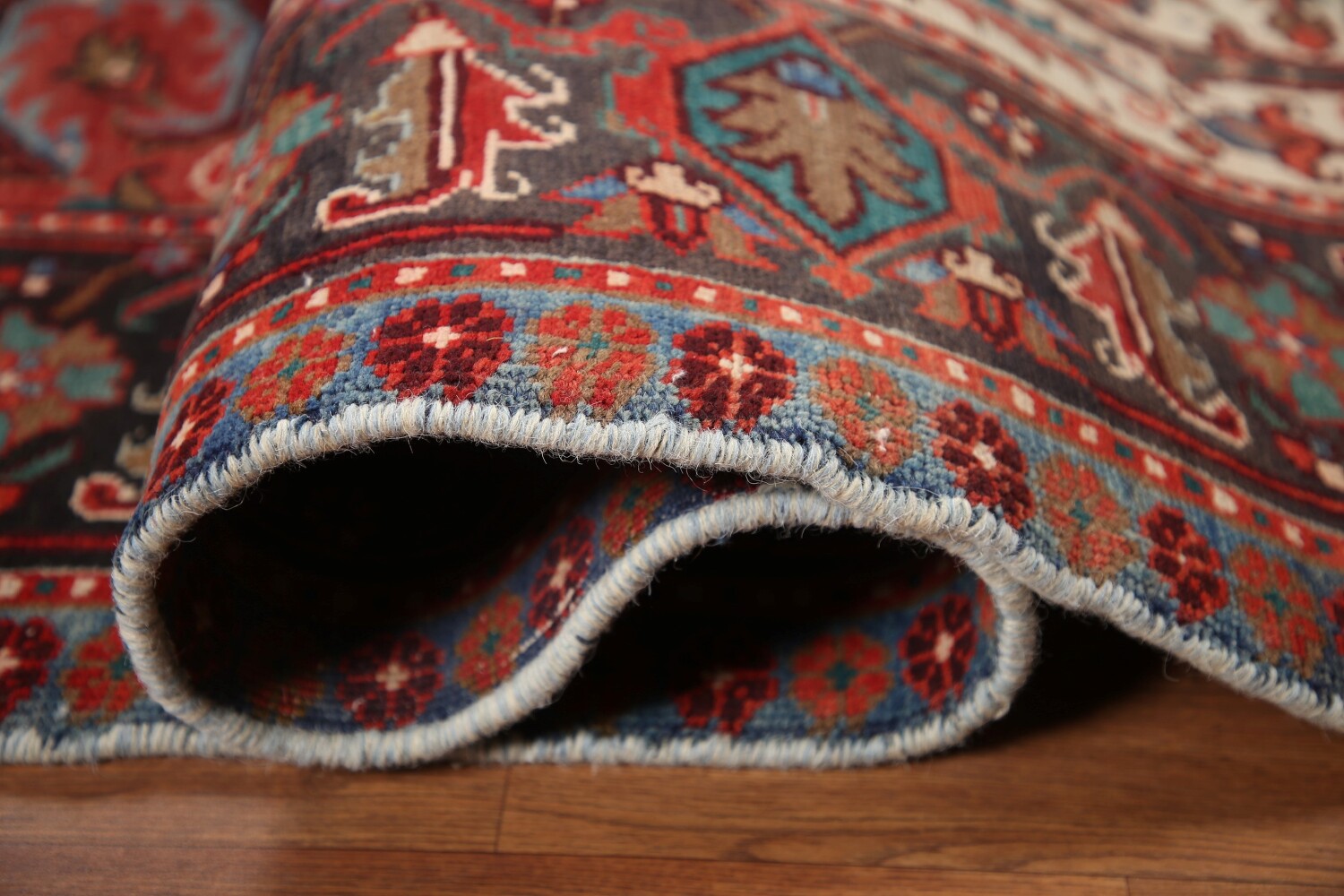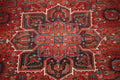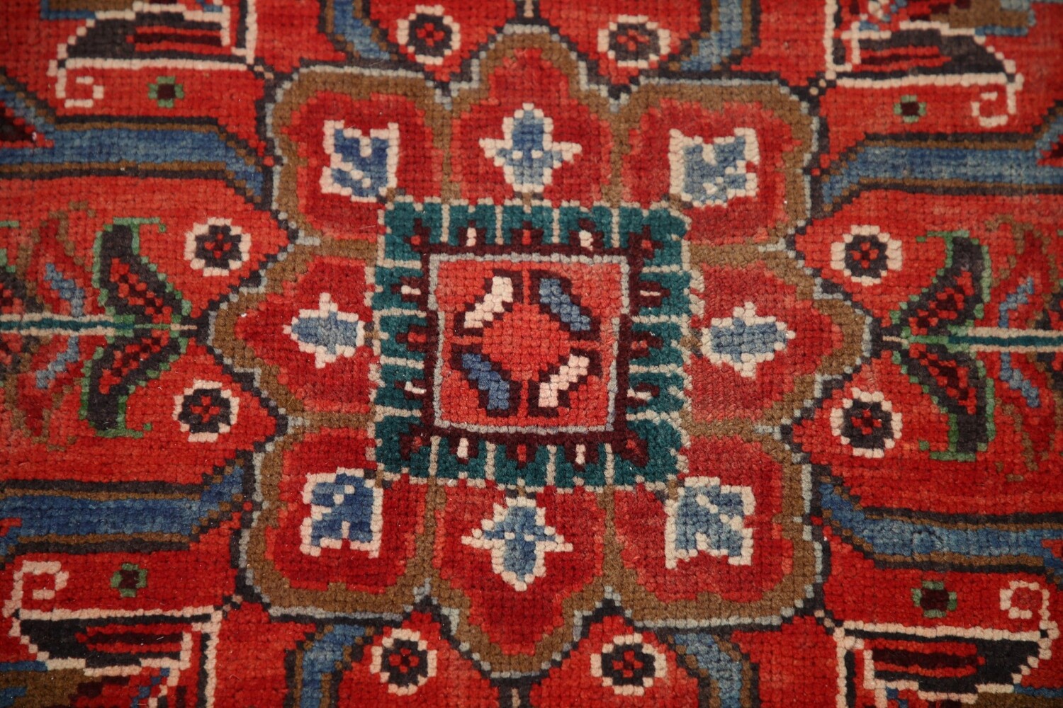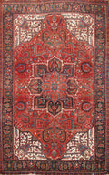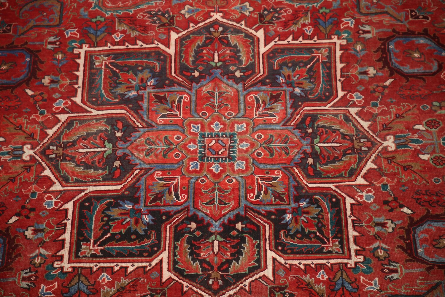 A Beautiful Genuine Persia ( Persia ) Heriz rug is Hand Knotted by skillful weavers in Persia ( Persia ) with 100% Wool Material. This rug is in Very Good ( Evenly Low Pile-Repair) condition. dimensions are 11' 0'' X 7' 8'' in foot and 335 X 234 in centimeter. the primary color is Red.