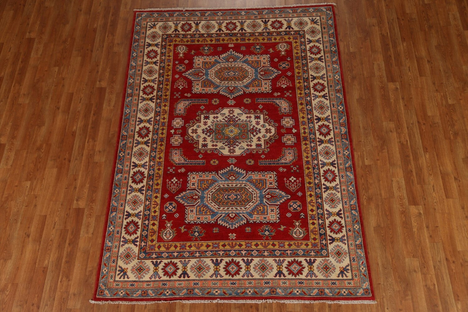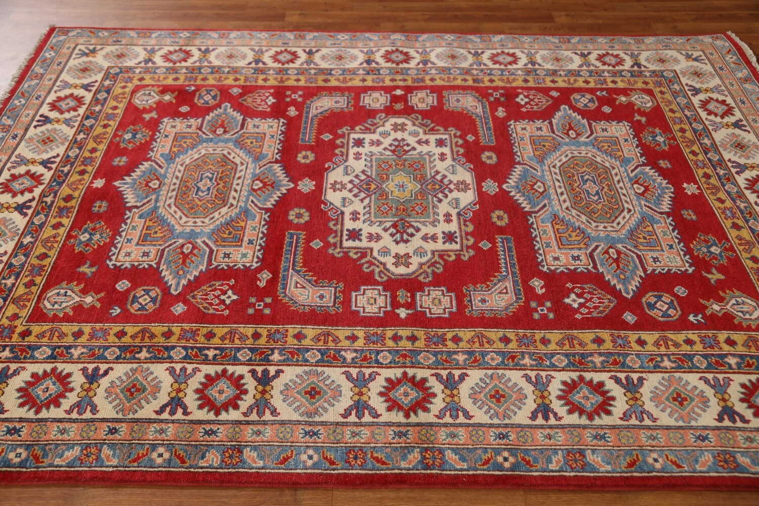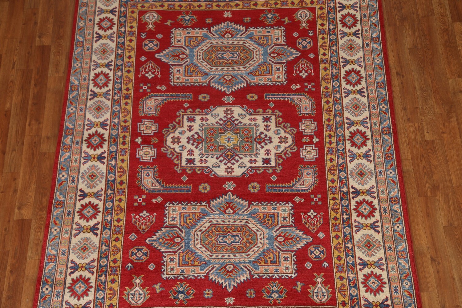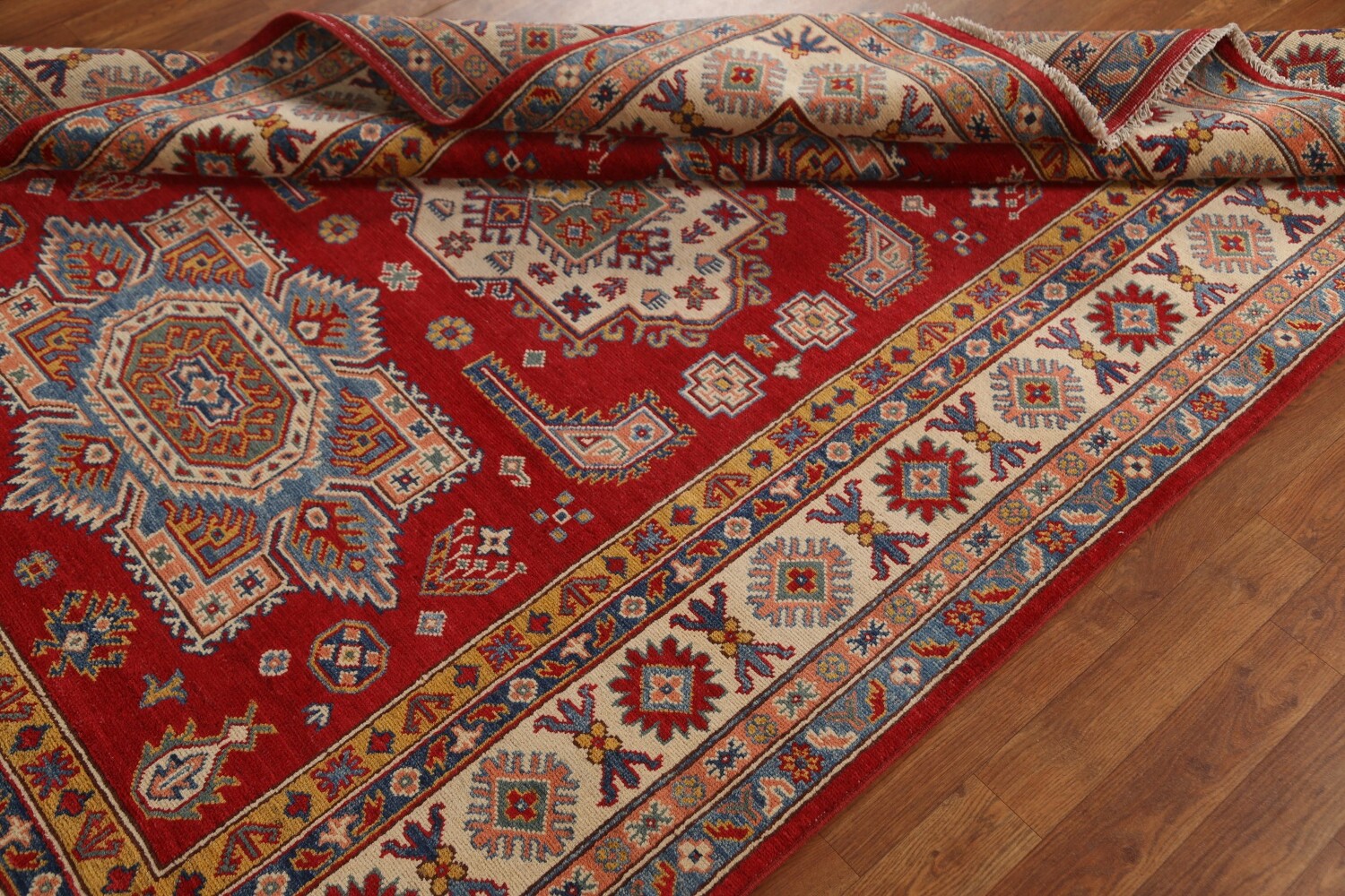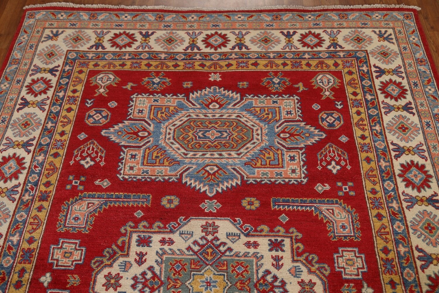 A Beautiful Genuine Pakistan Kazak rug is Hand Knotted by skillful weavers in Pakistan with 100% Wool Material. This rug is in New, First Quality condition. dimensions are 7' 10'' X 5' 7'' in foot and 239 X 170 in centimeter. the primary color is Red.