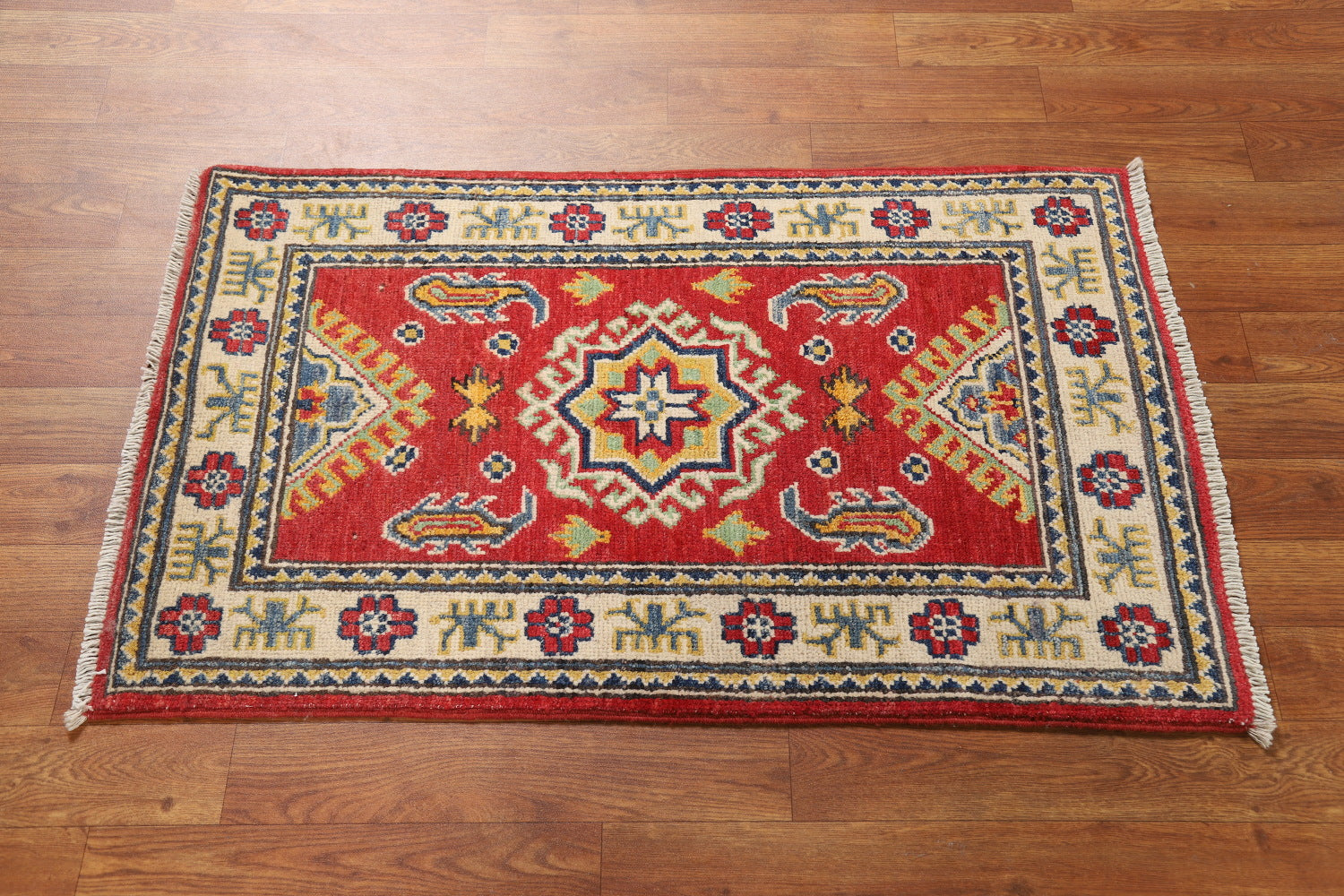 A Beautiful Genuine Pakistan Kazak rug is Hand Knotted by skillful weavers in Pakistan with 100% Wool Material. This rug is in New, First Quality condition. dimensions are 3' 0'' X 2' 0'' in foot and 91 X 61 in centimeter. the primary color is Red.