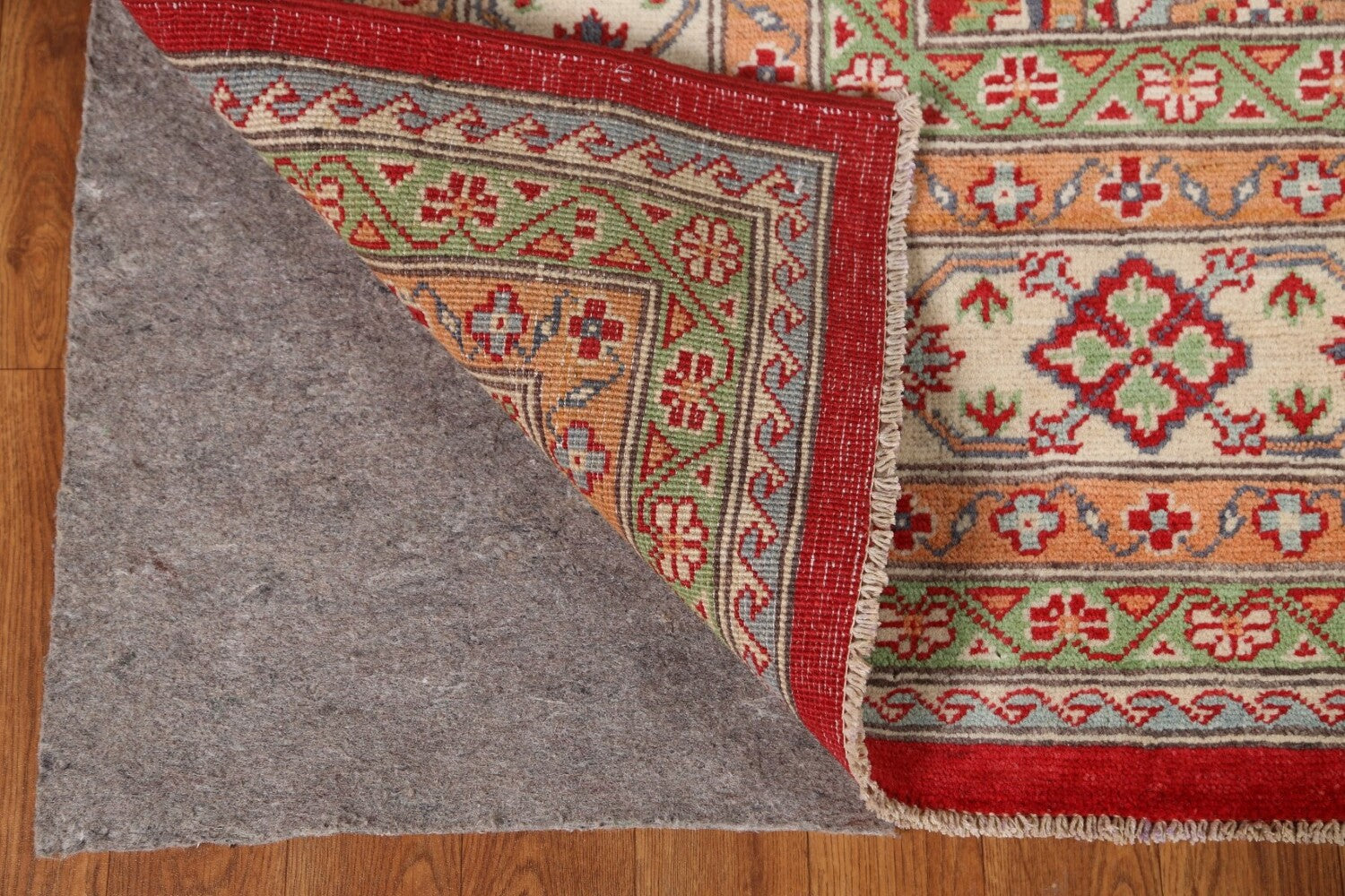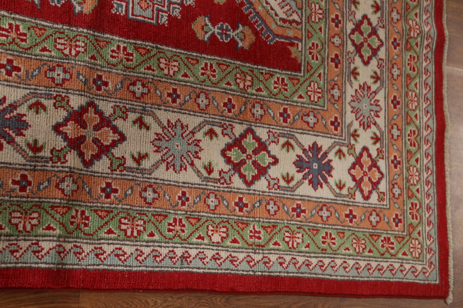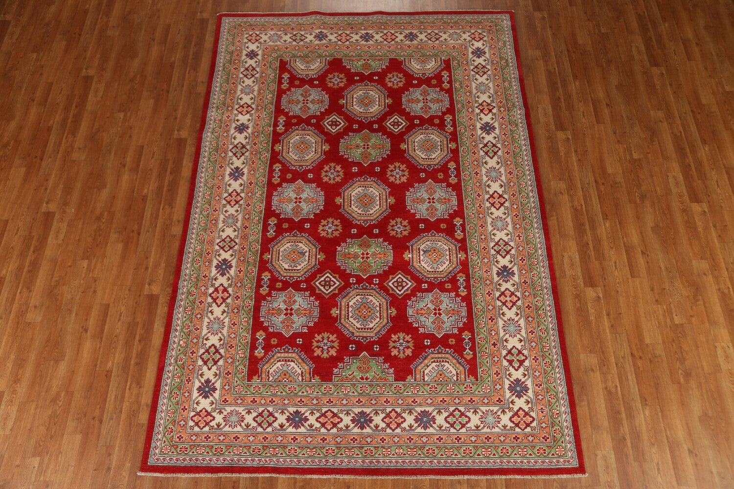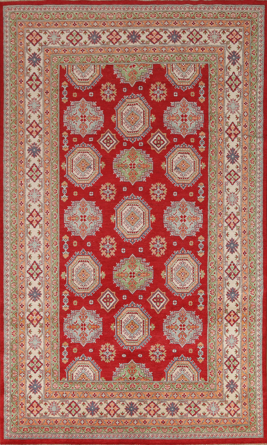 A Beautiful Genuine Pakistan Kazak rug is Hand Knotted by skillful weavers in Pakistan with 100% Wool Material. This rug is in New, First Quality condition. dimensions are 9' 6'' X 6' 5'' in foot and 290 X 196 in centimeter. the primary color is Red.