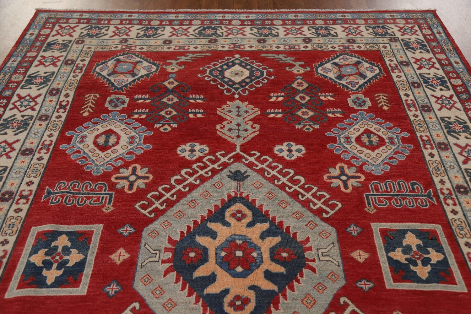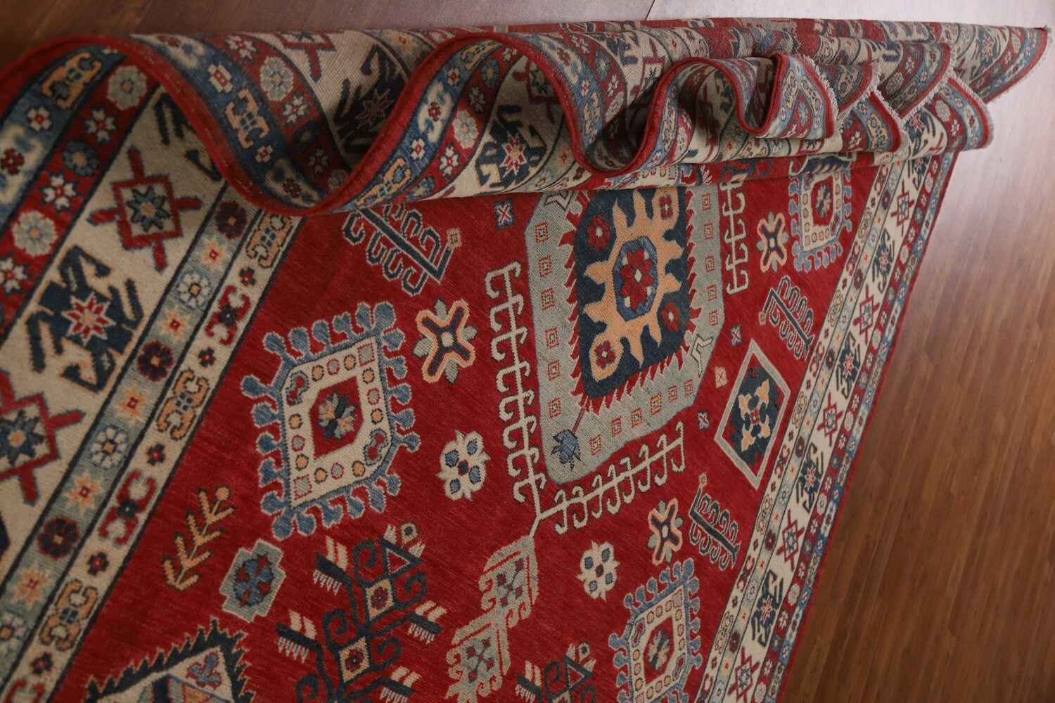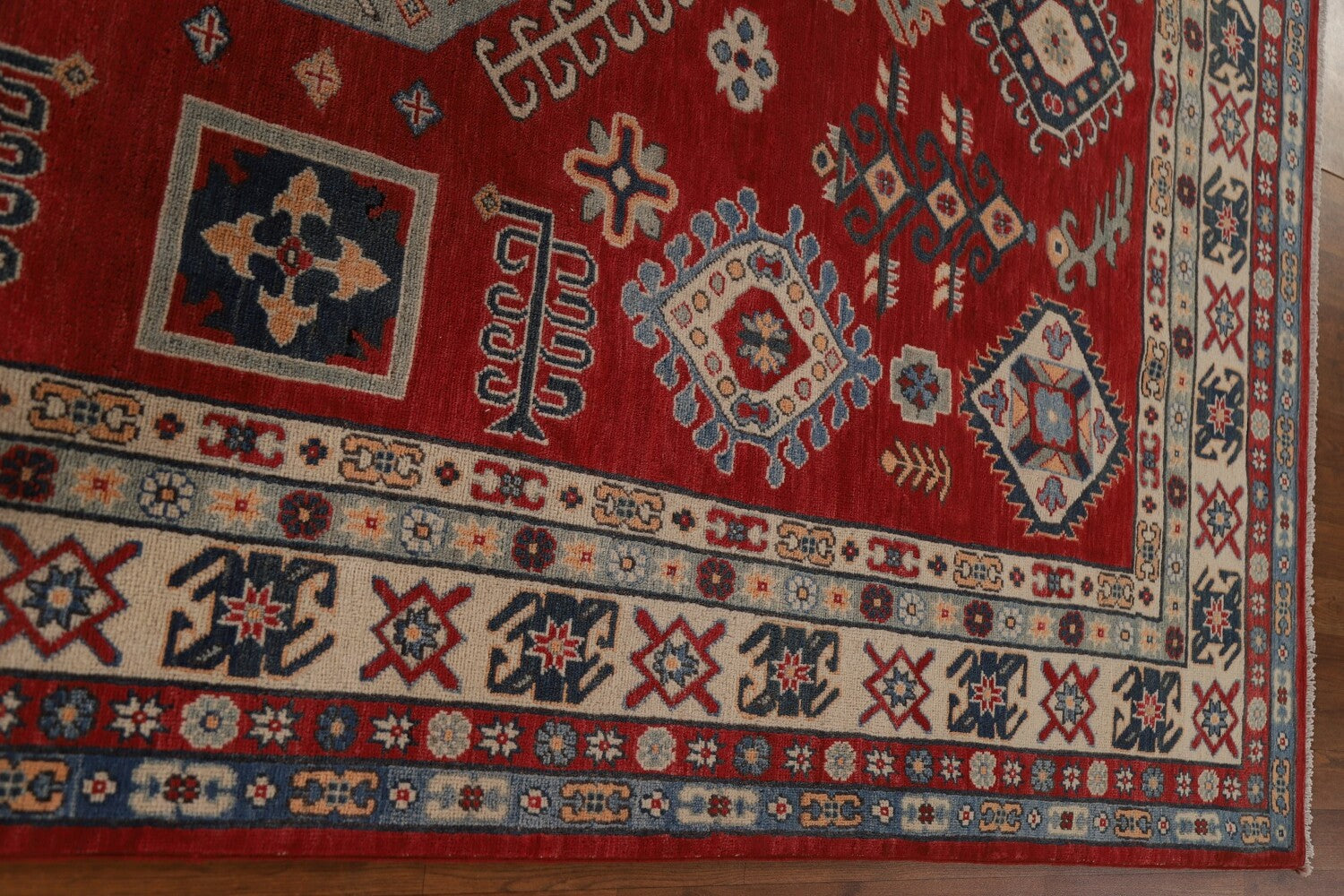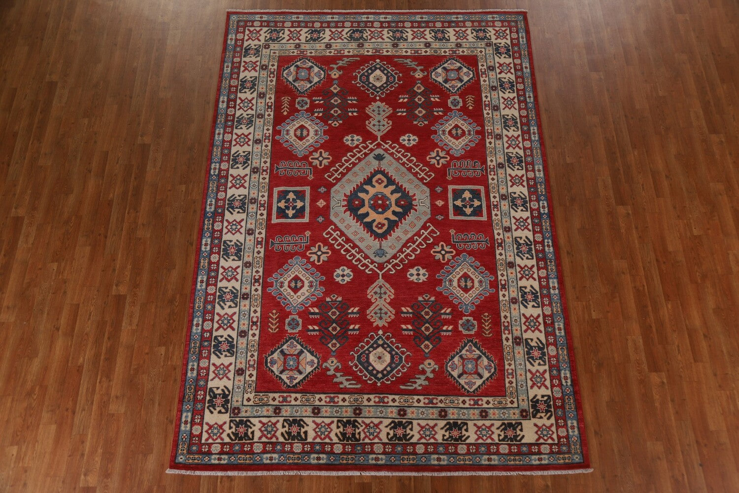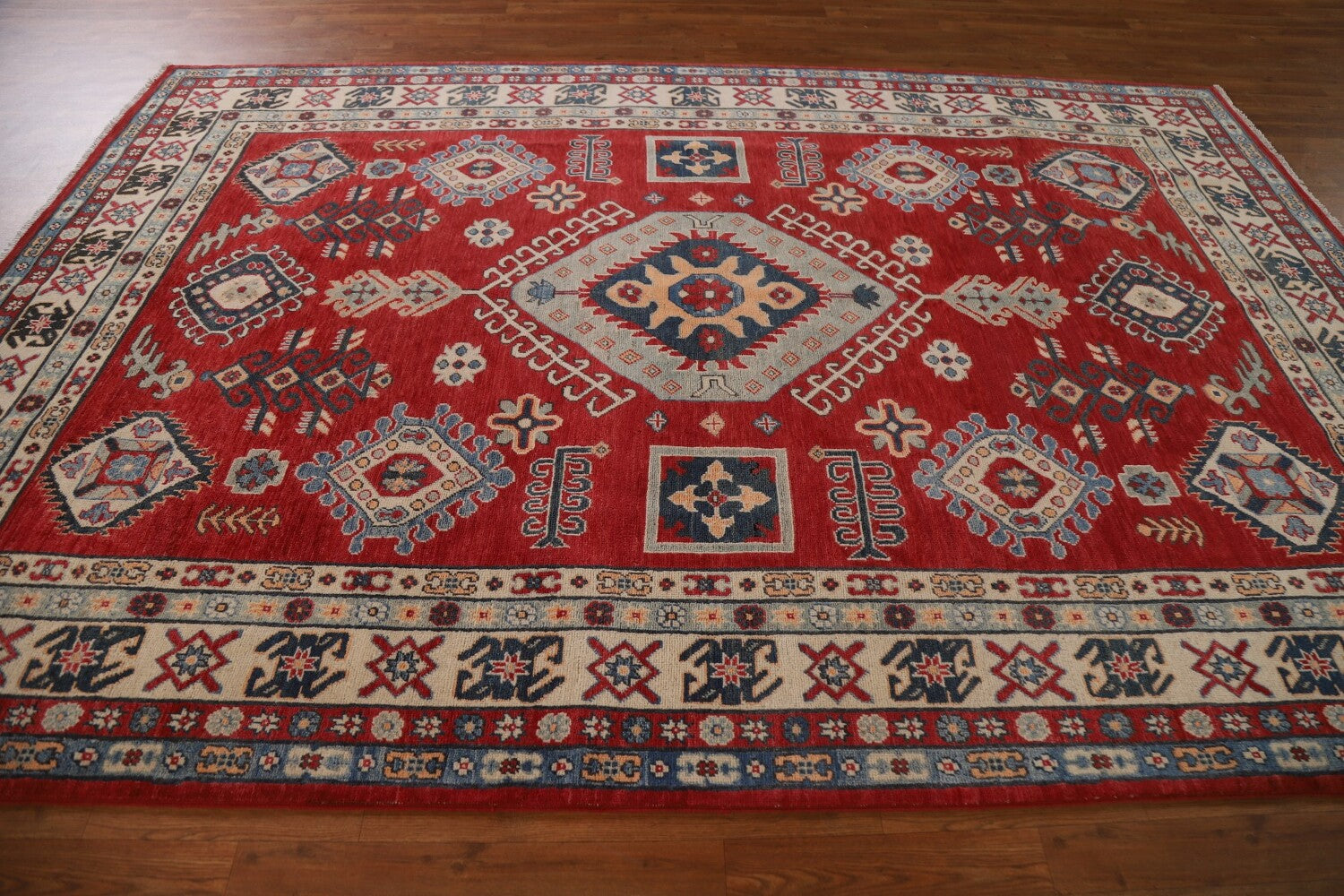 A Beautiful Genuine Pakistan Kazak rug is Hand Knotted by skillful weavers in Pakistan with 100% Wool Material. This rug is in New, First Quality condition. dimensions are 9' 11'' X 6' 10'' in foot and 302 X 208 in centimeter. the primary color is Red.
