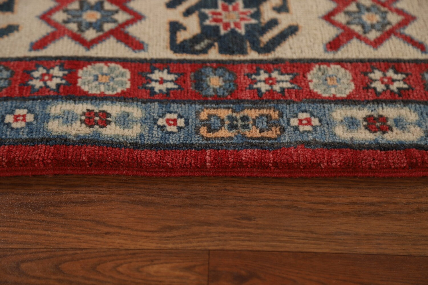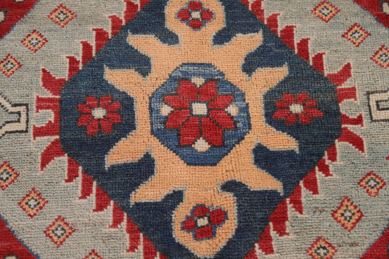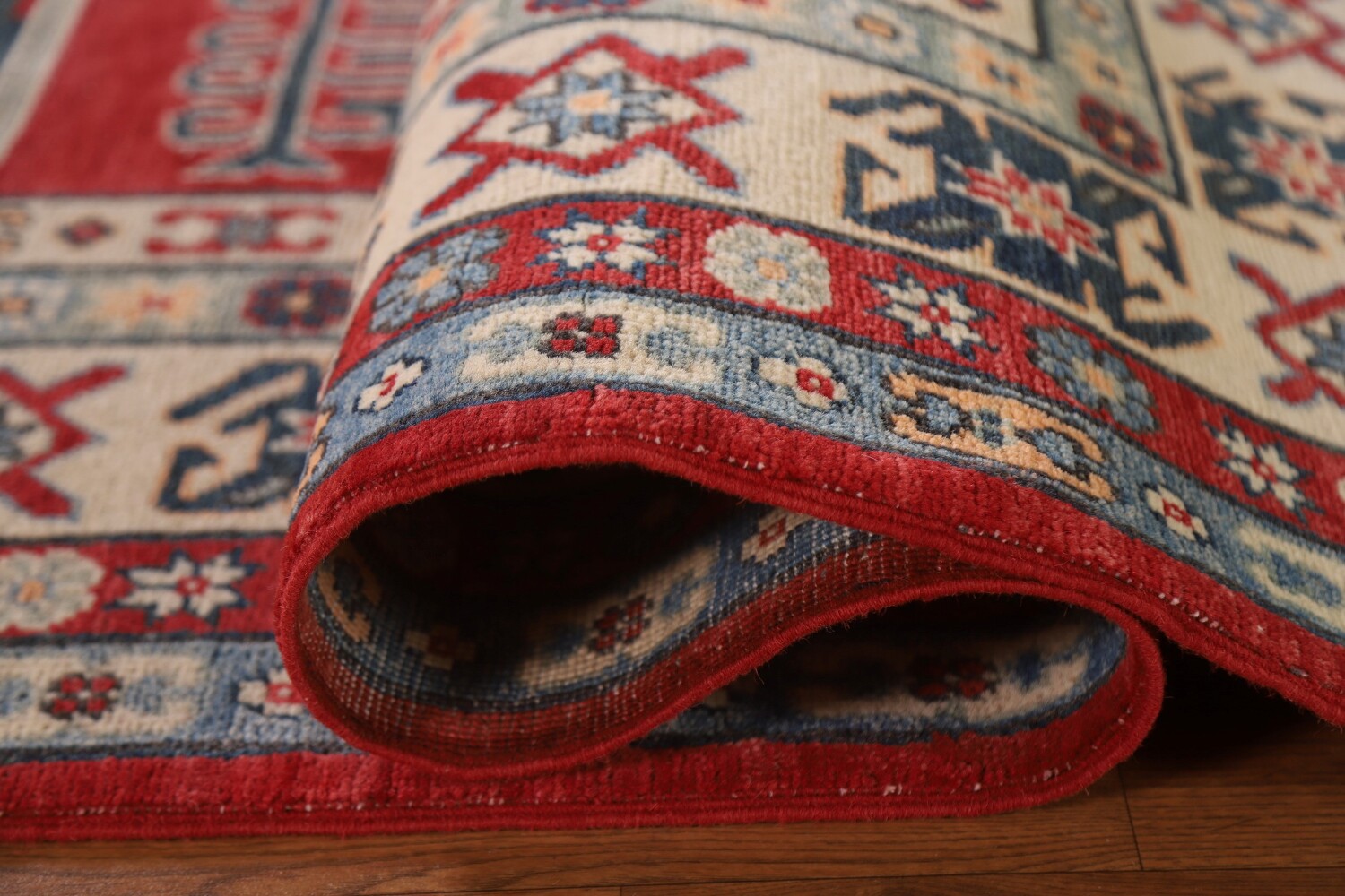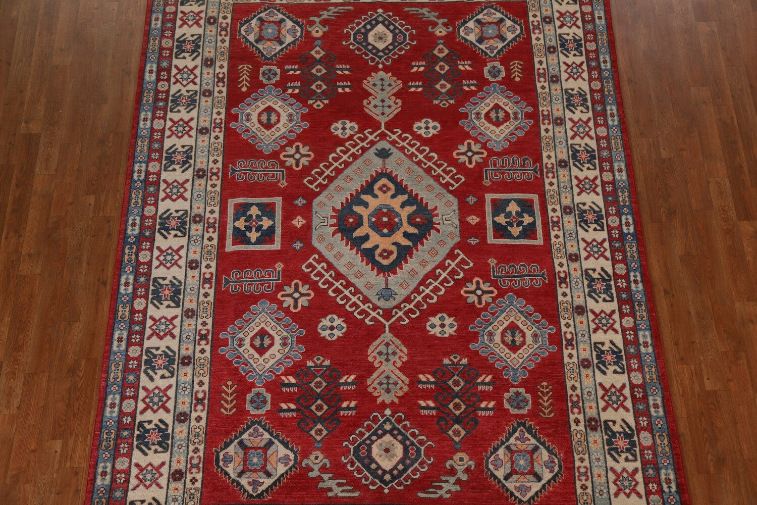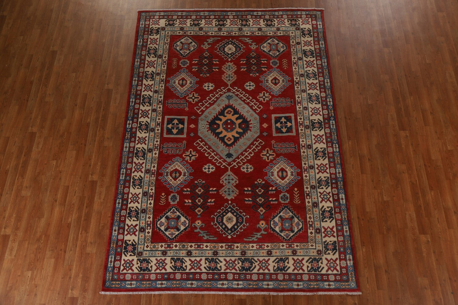 A Beautiful Genuine Pakistan Kazak rug is Hand Knotted by skillful weavers in Pakistan with 100% Wool Material. This rug is in New, First Quality condition. dimensions are 9' 11'' X 6' 10'' in foot and 302 X 208 in centimeter. the primary color is Red.