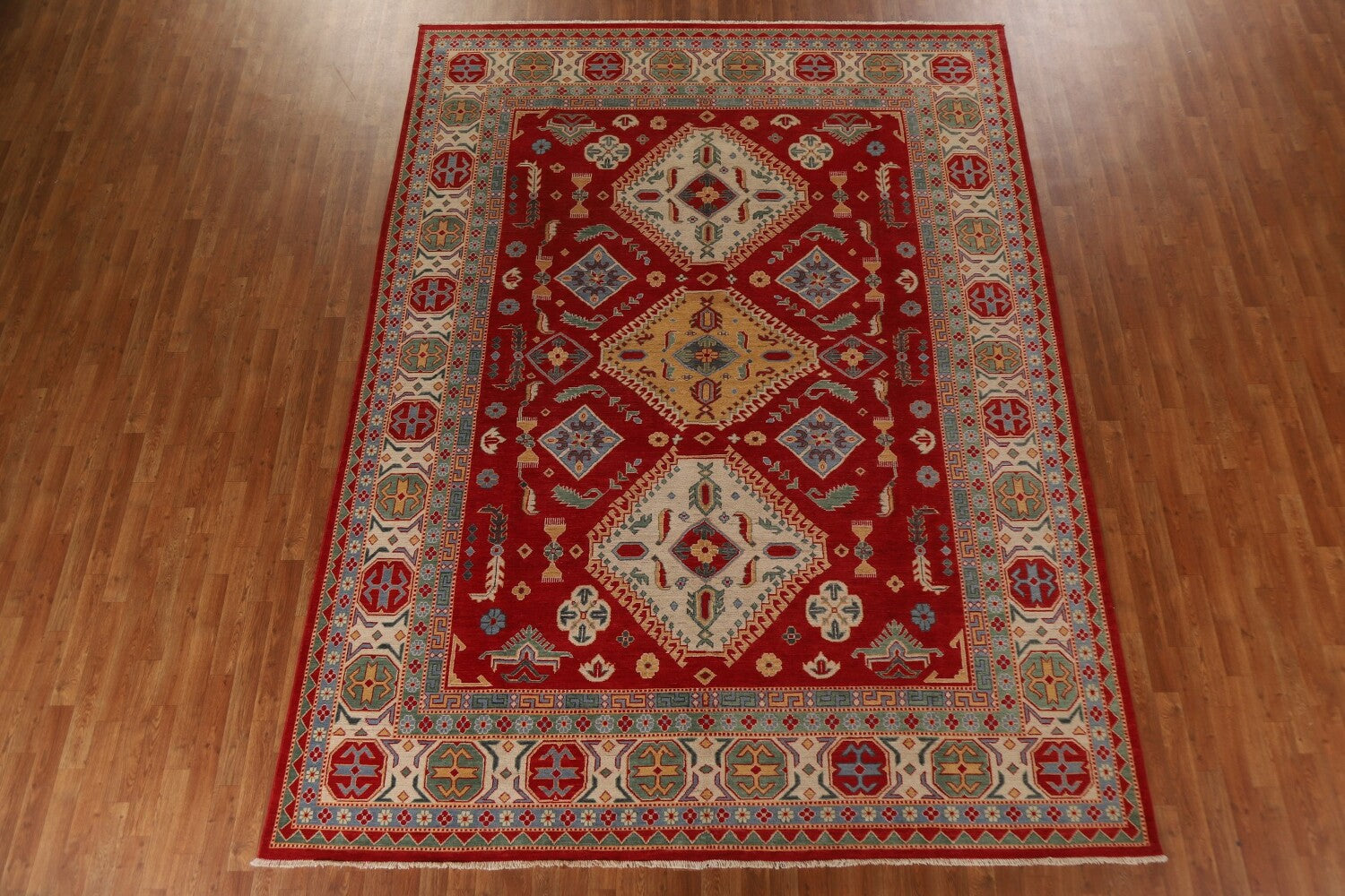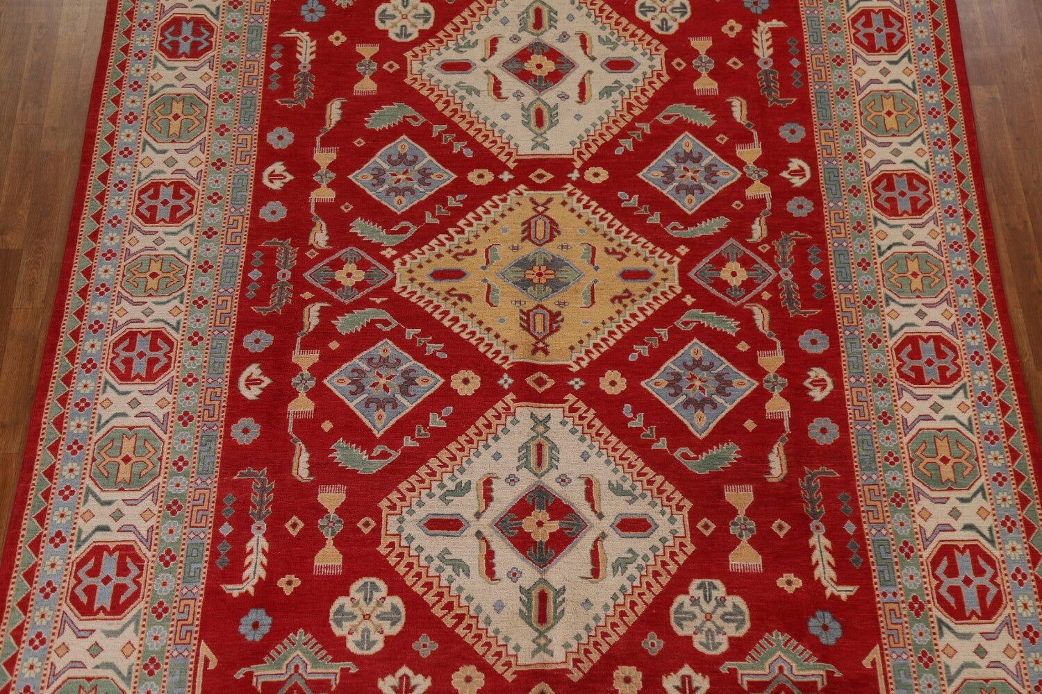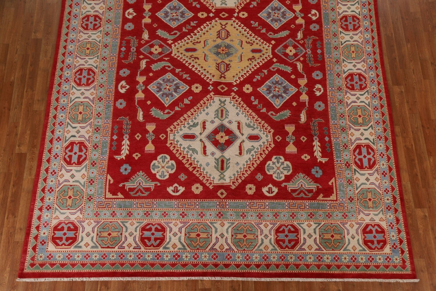 A Beautiful Genuine Pakistan Kazak rug is Hand Knotted by skillful weavers in Pakistan with 100% Wool Material. This rug is in condition. dimensions are 11' 9'' X 8' 8'' in foot and 358 X 264 in centimeter. the primary color is Red.