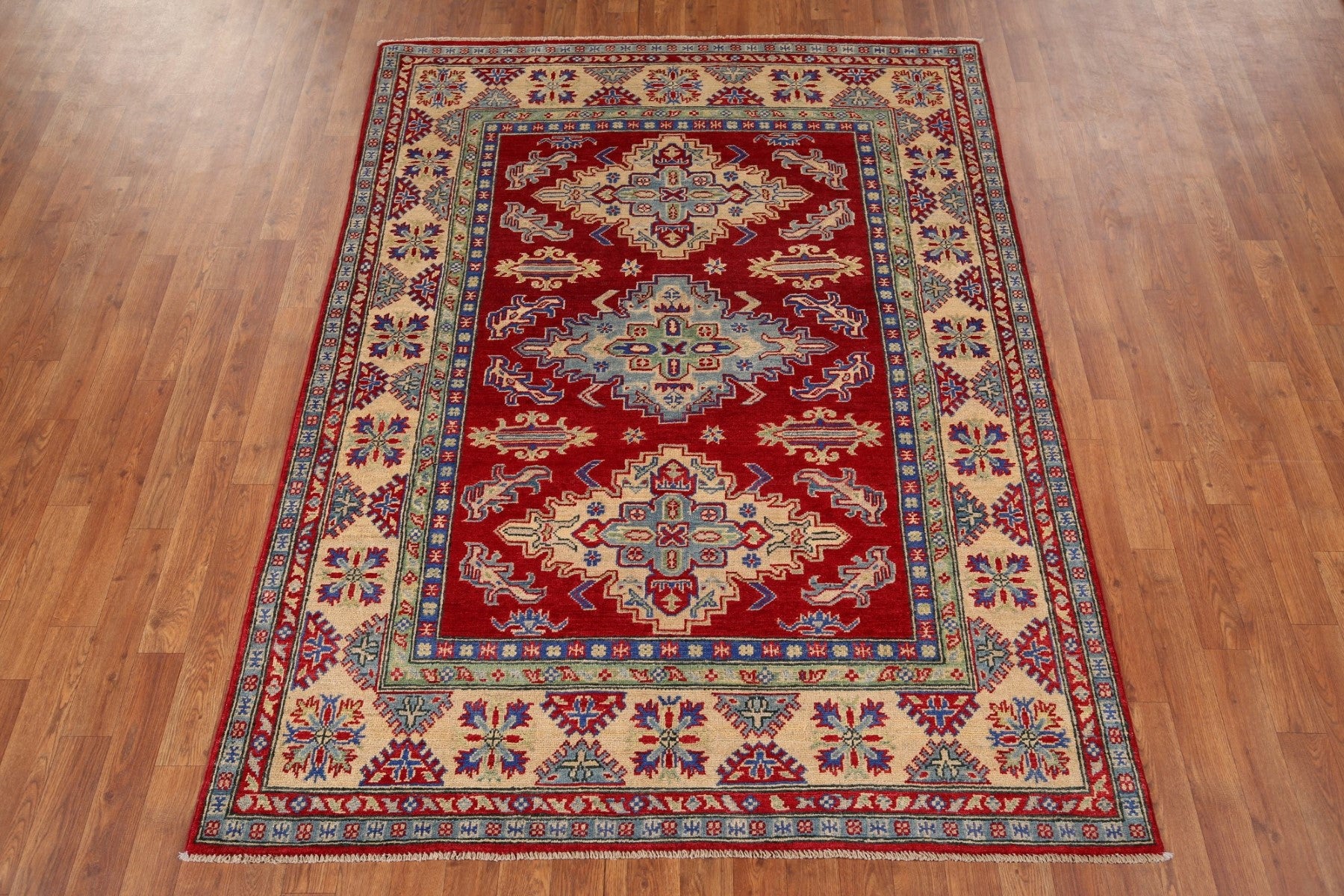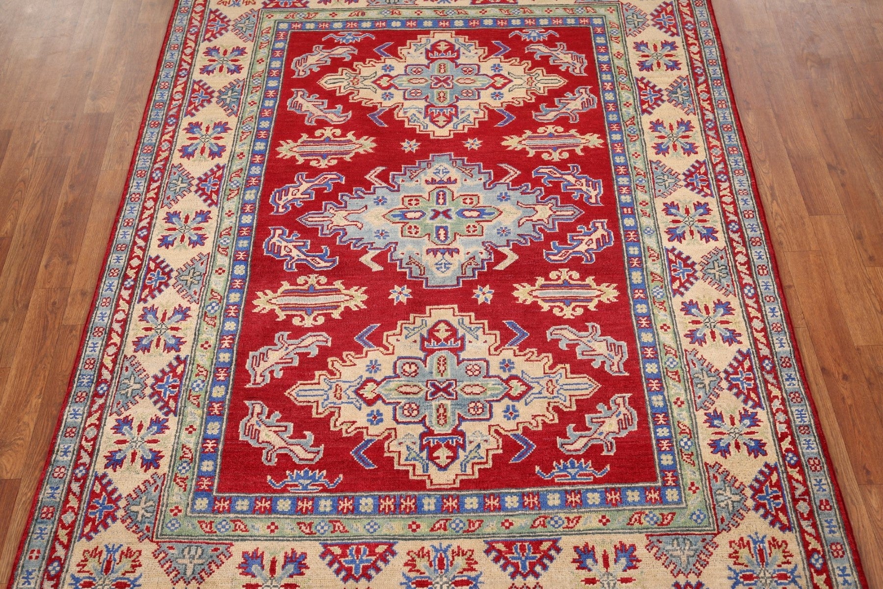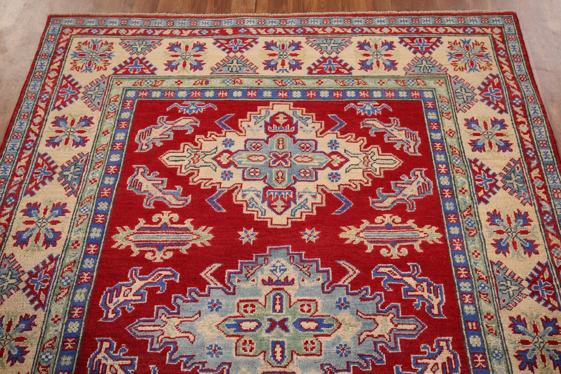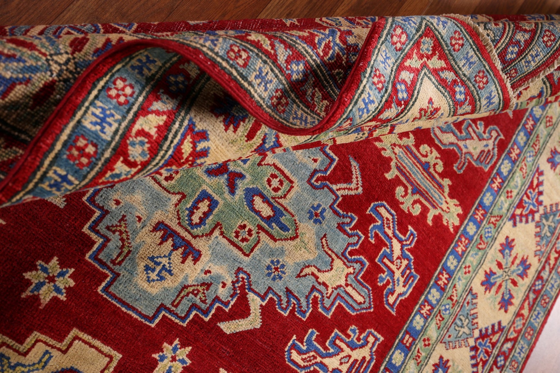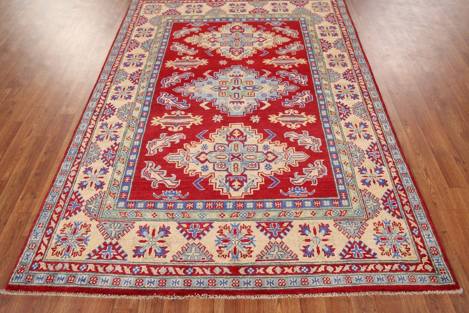 A Beautiful Genuine Pakistan Kazak rug is Hand Knotted by skillful weavers in Pakistan with 100% Wool Material. This rug is in New, First Quality condition. dimensions are 6' 9'' X 5' 1'' in foot and  206 X 155 in centimeter. the primary color is Red.