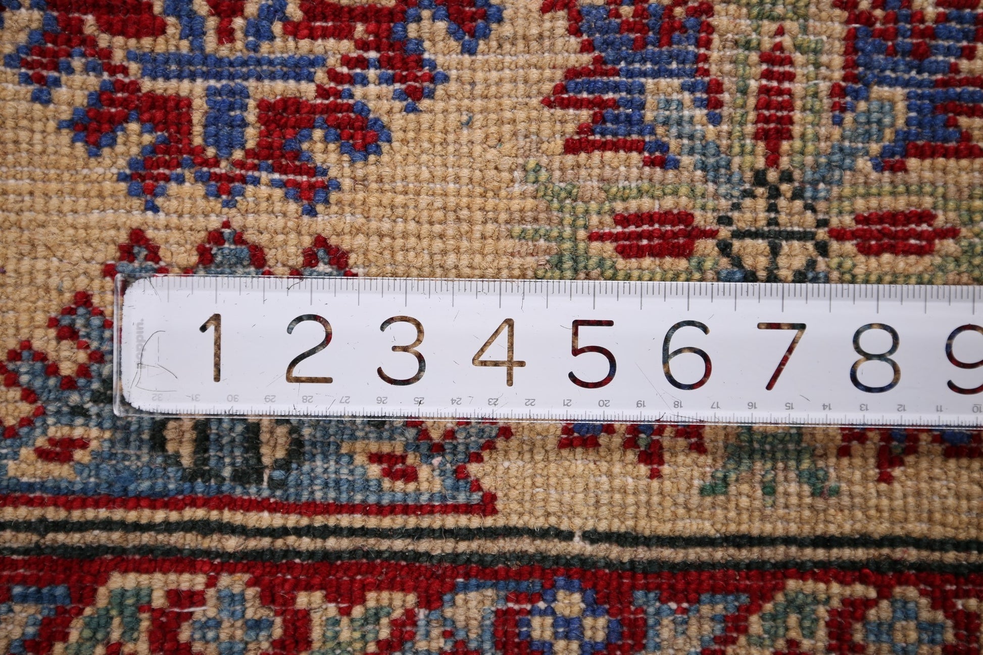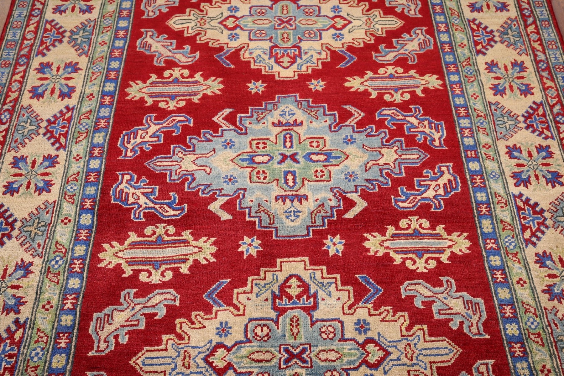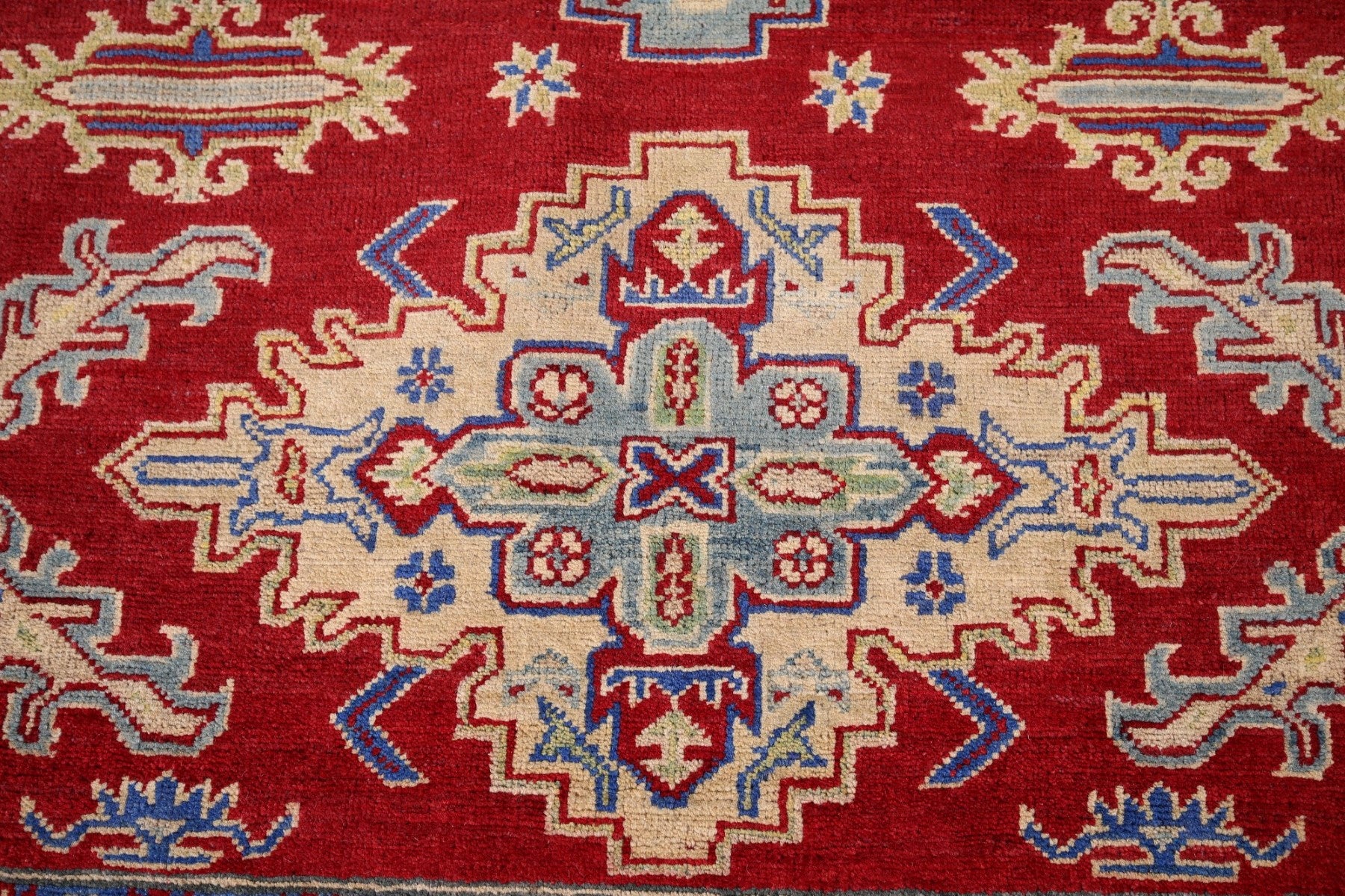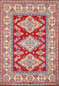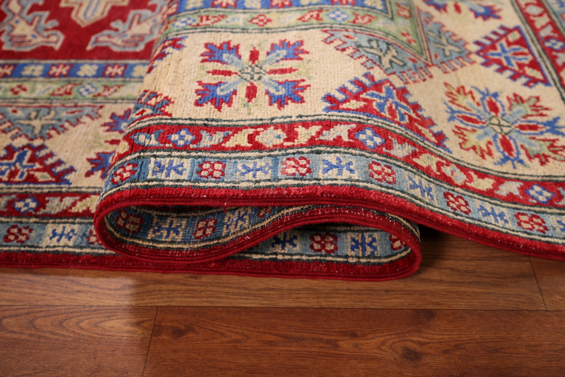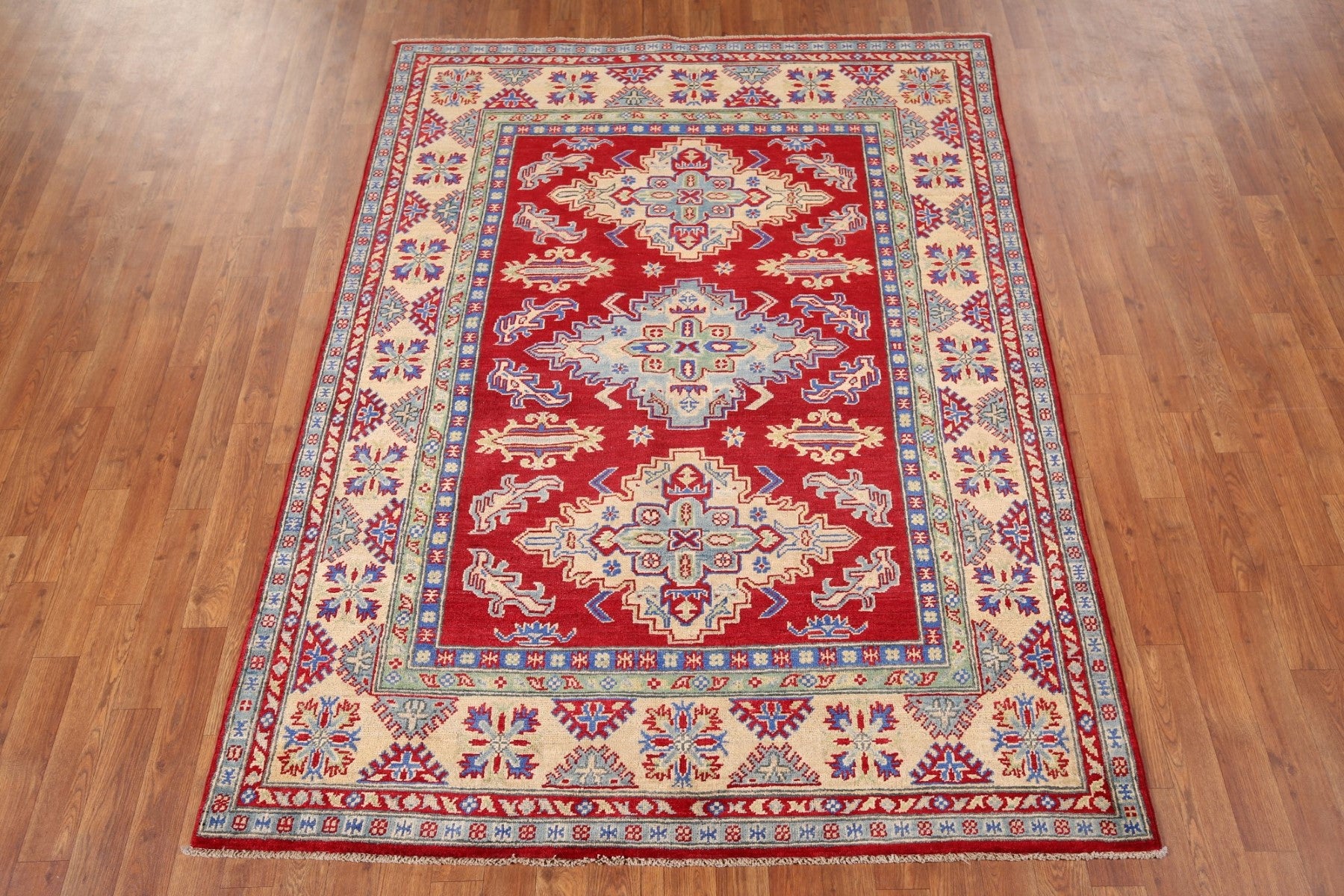 A Beautiful Genuine Pakistan Kazak rug is Hand Knotted by skillful weavers in Pakistan with 100% Wool Material. This rug is in New, First Quality condition. dimensions are 6' 9'' X 5' 1'' in foot and  206 X 155 in centimeter. the primary color is Red.
