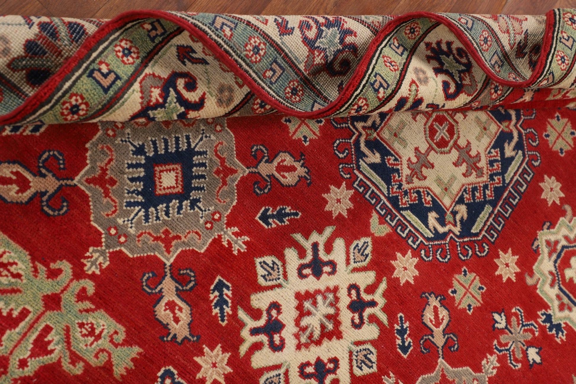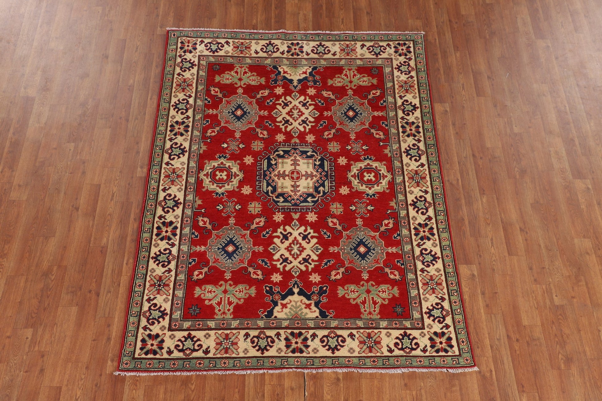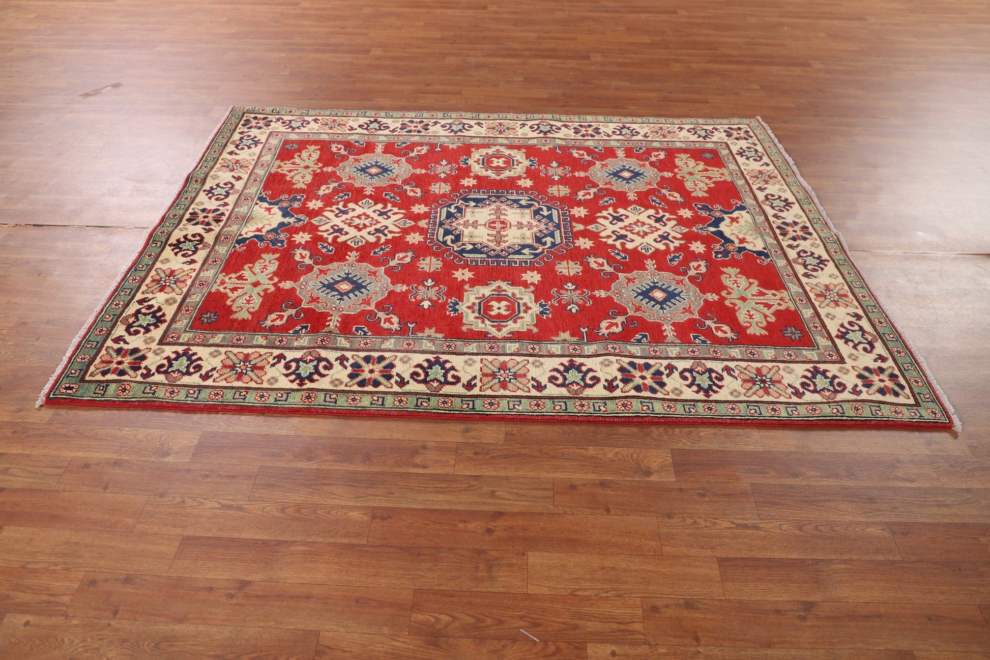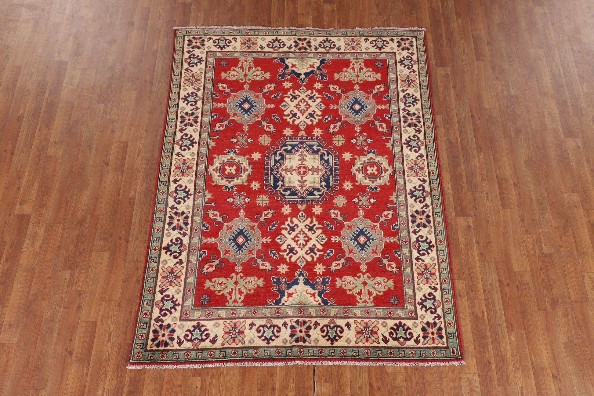 A Beautiful Genuine Pakistan Kazak rug is Hand Knotted by skillful weavers in Pakistan with 100% Wool Material. This rug is in New, First Quality condition. dimensions are 6' 8'' X 5' 0'' in foot and 203 X 152 in centimeter. the primary color is Red.