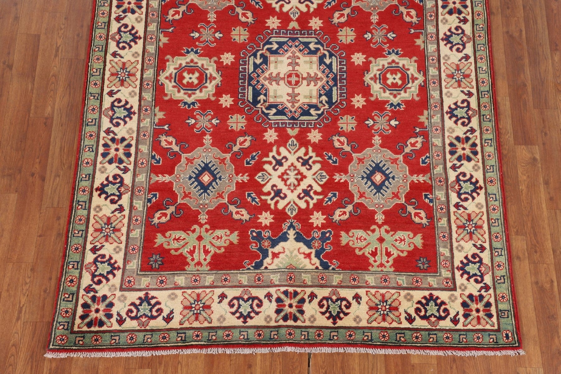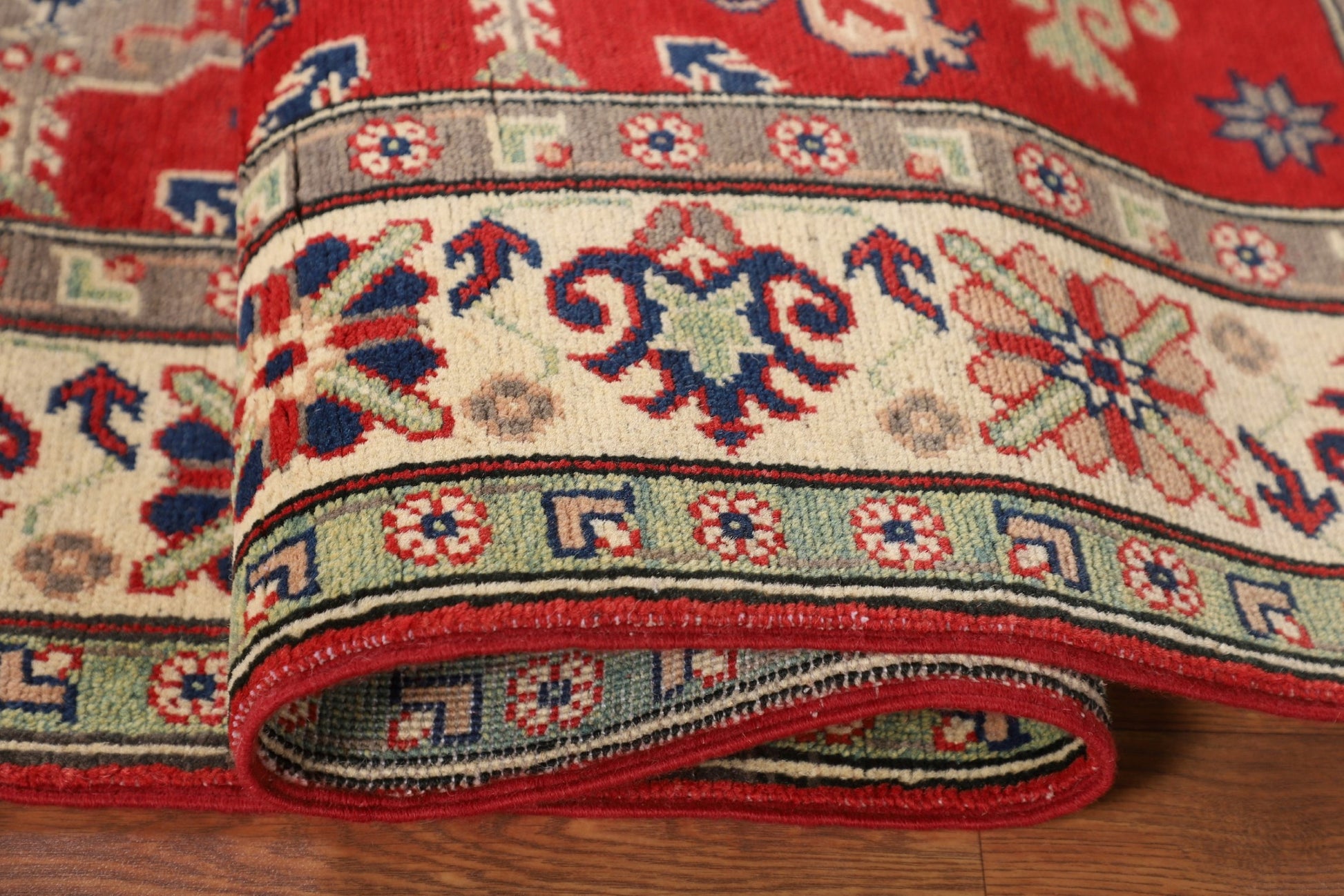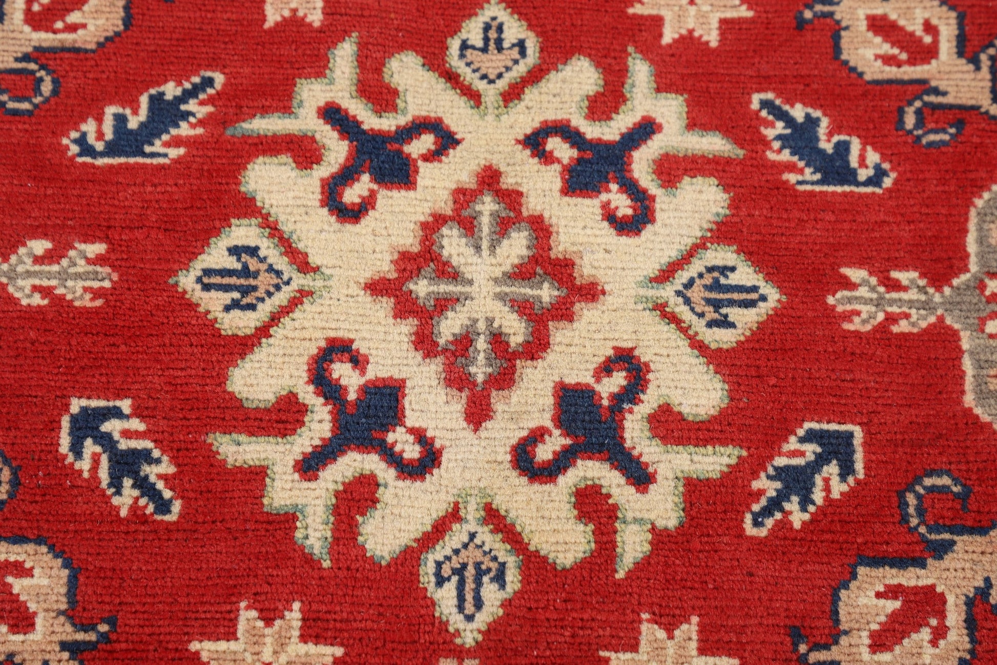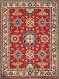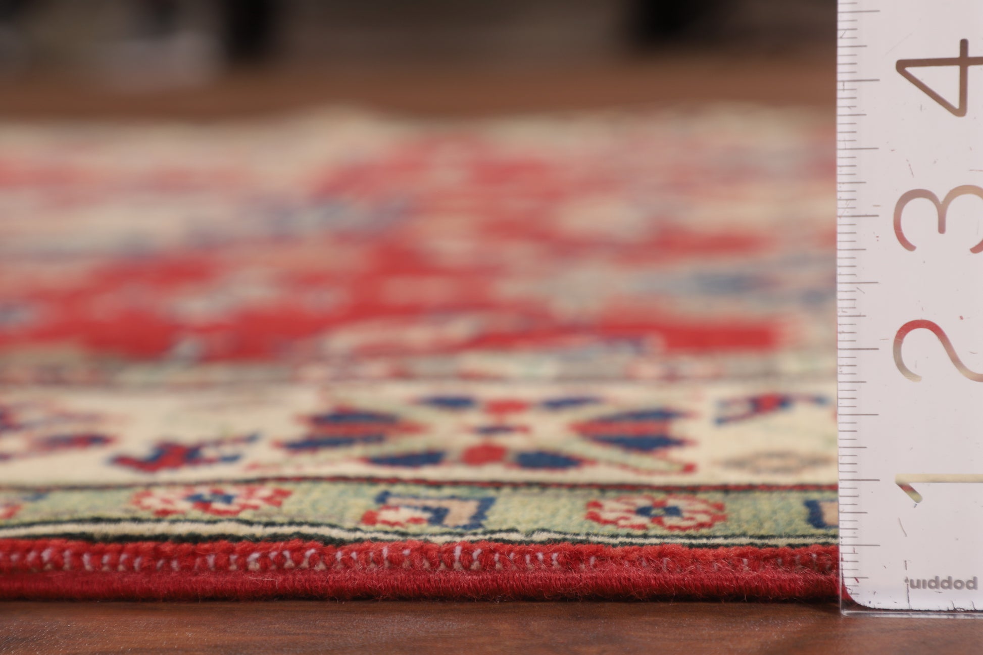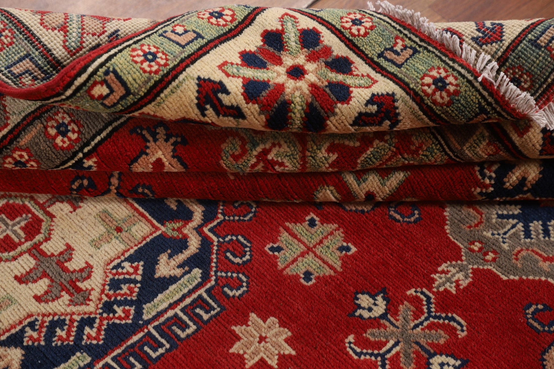 A Beautiful Genuine Pakistan Kazak rug is Hand Knotted by skillful weavers in Pakistan with 100% Wool Material. This rug is in New, First Quality condition. dimensions are 6' 8'' X 5' 0'' in foot and 203 X 152 in centimeter. the primary color is Red.