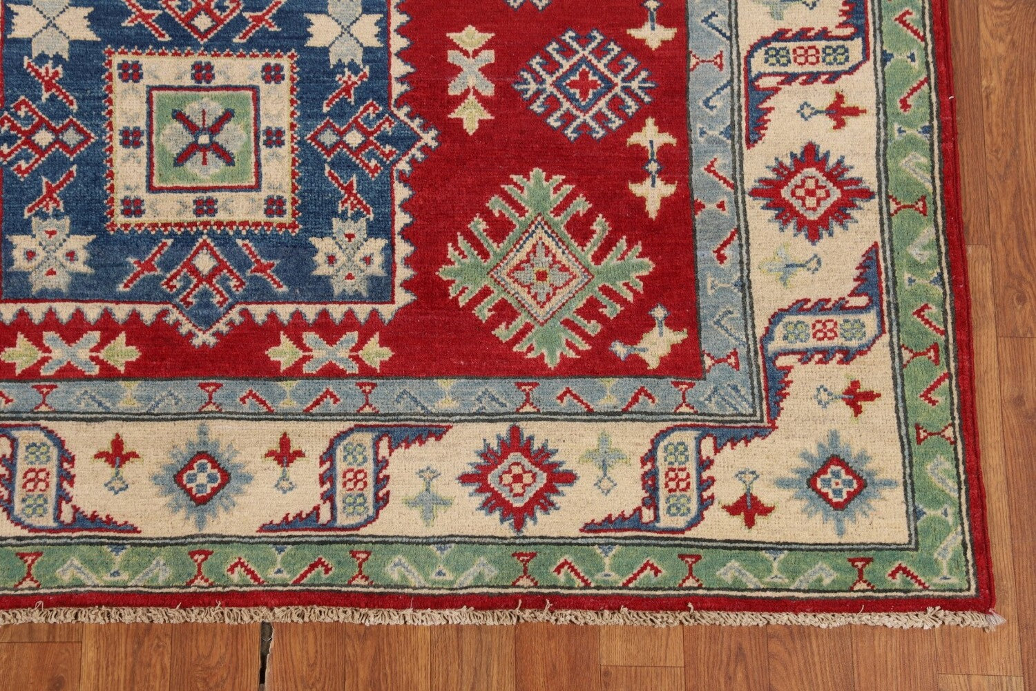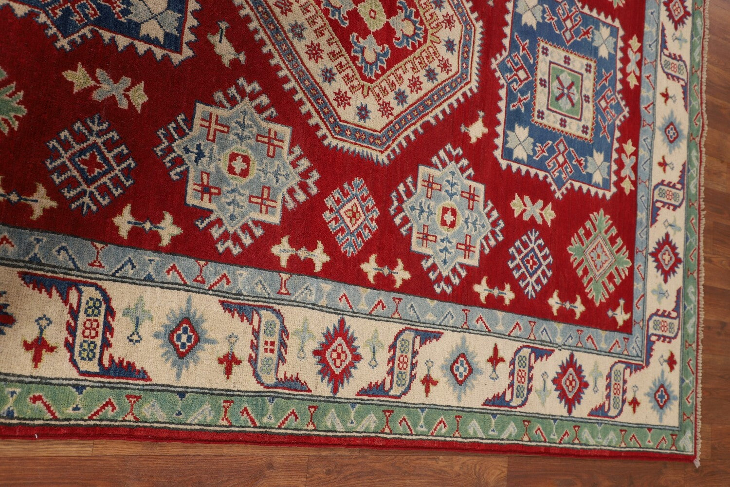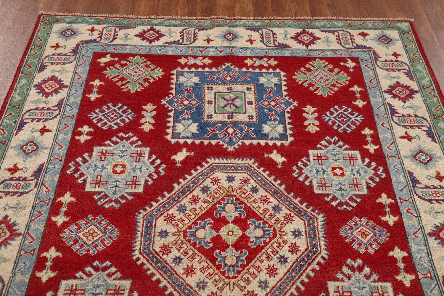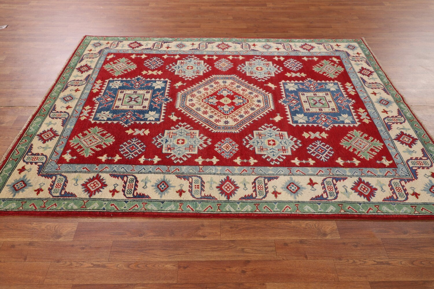 A Beautiful Genuine Pakistan Kazak rug is Hand Knotted by skillful weavers in Pakistan with 100% Wool Material. This rug is in New, First Quality condition. dimensions are 6' 7'' X 5' 2'' in foot and 201 X 157 in centimeter. the primary color is Red.