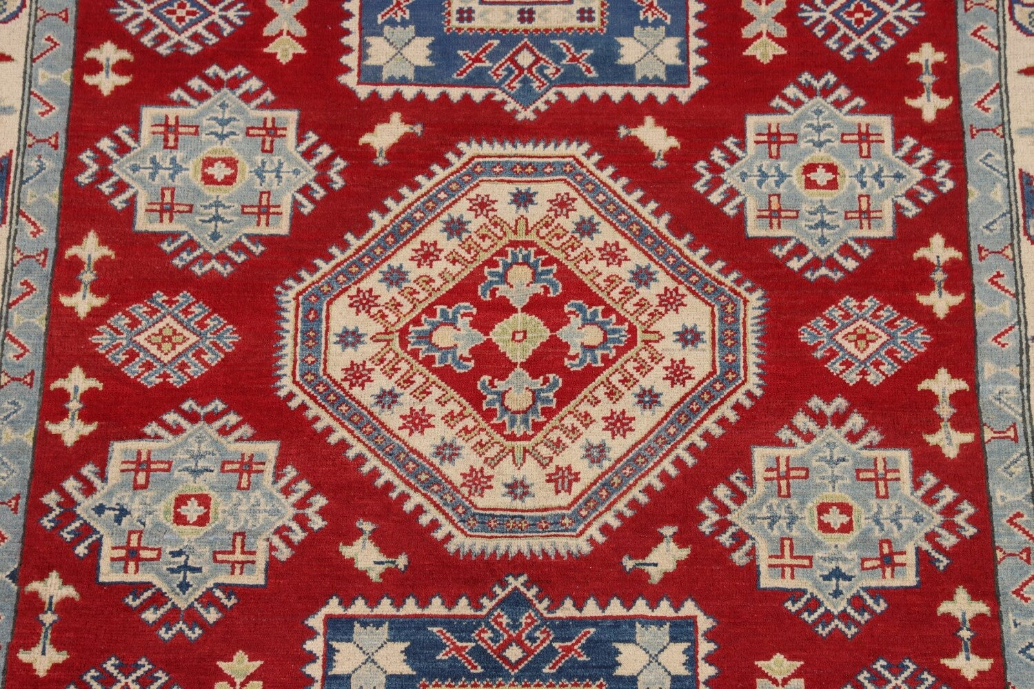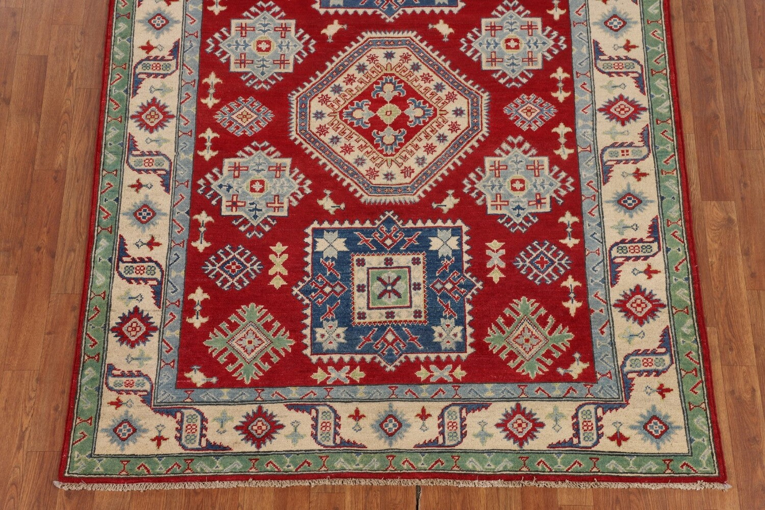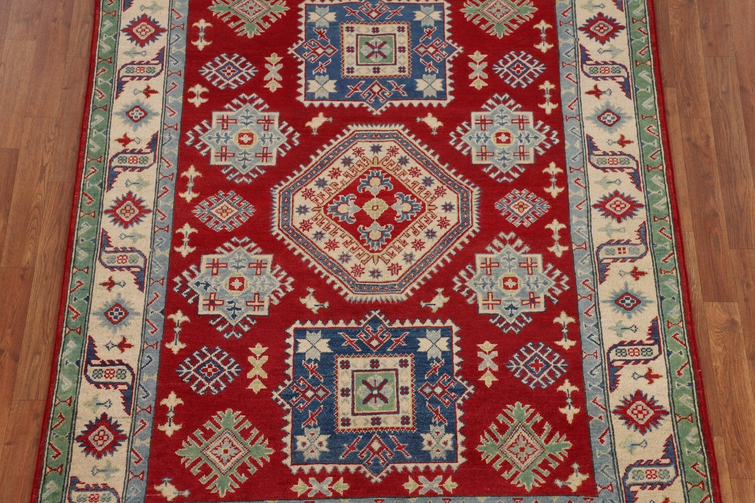 A Beautiful Genuine Pakistan Kazak rug is Hand Knotted by skillful weavers in Pakistan with 100% Wool Material. This rug is in New, First Quality condition. dimensions are 6' 7'' X 5' 2'' in foot and 201 X 157 in centimeter. the primary color is Red.