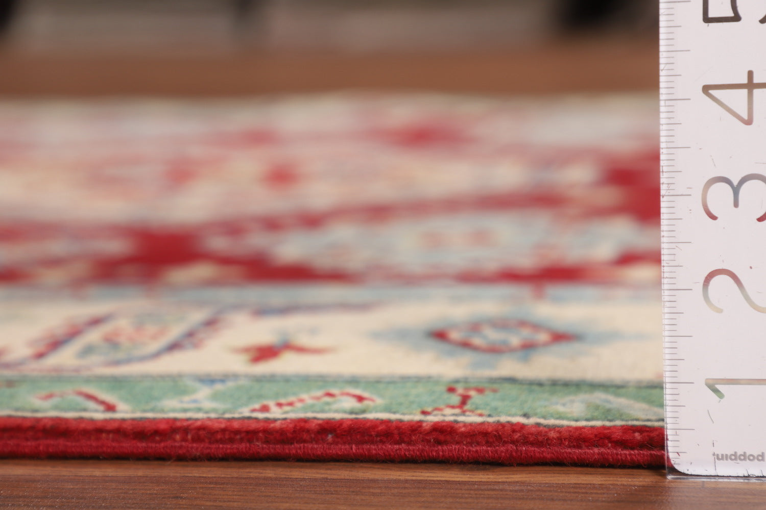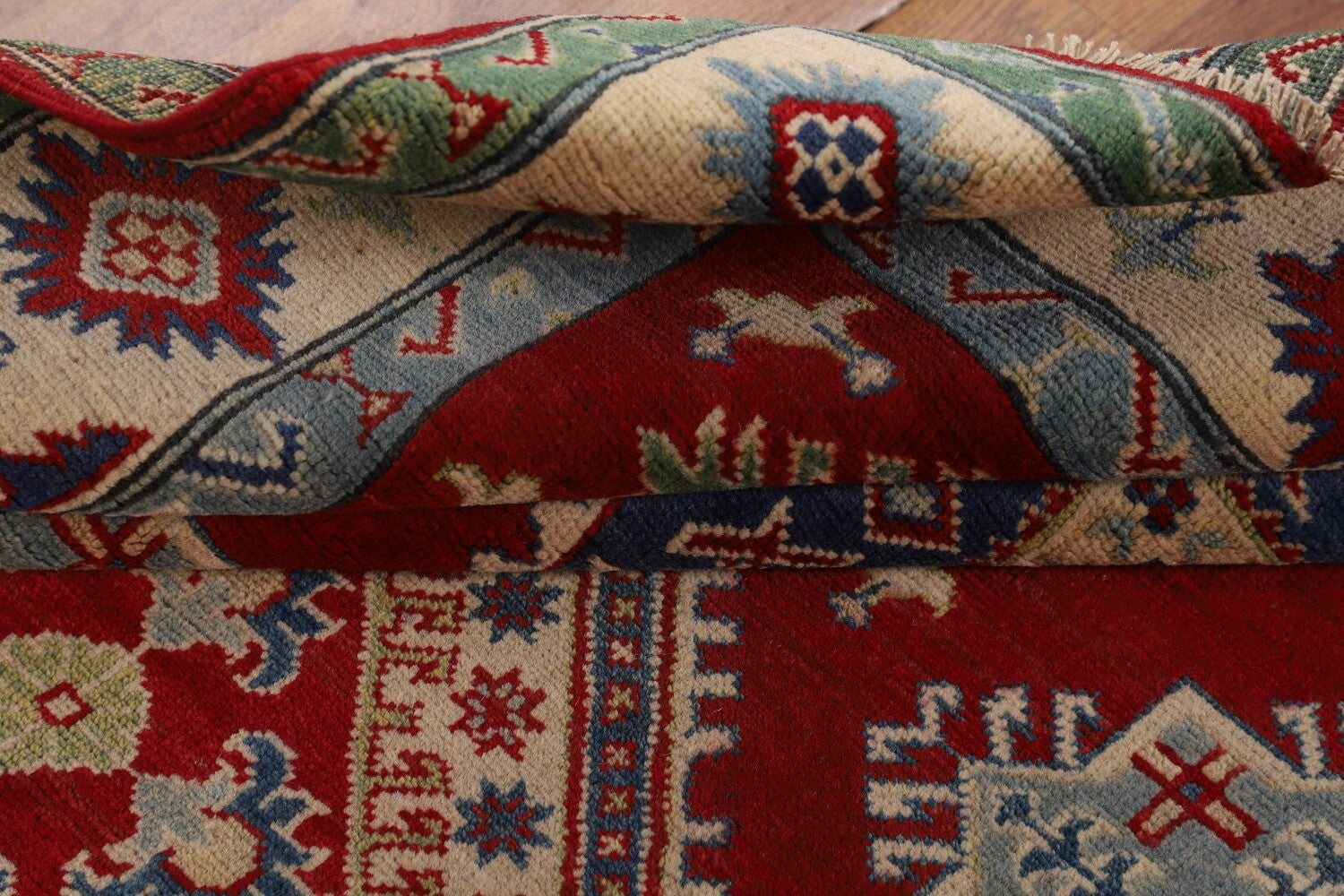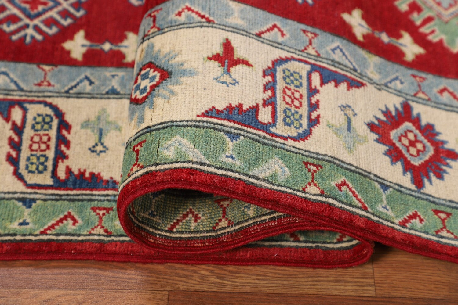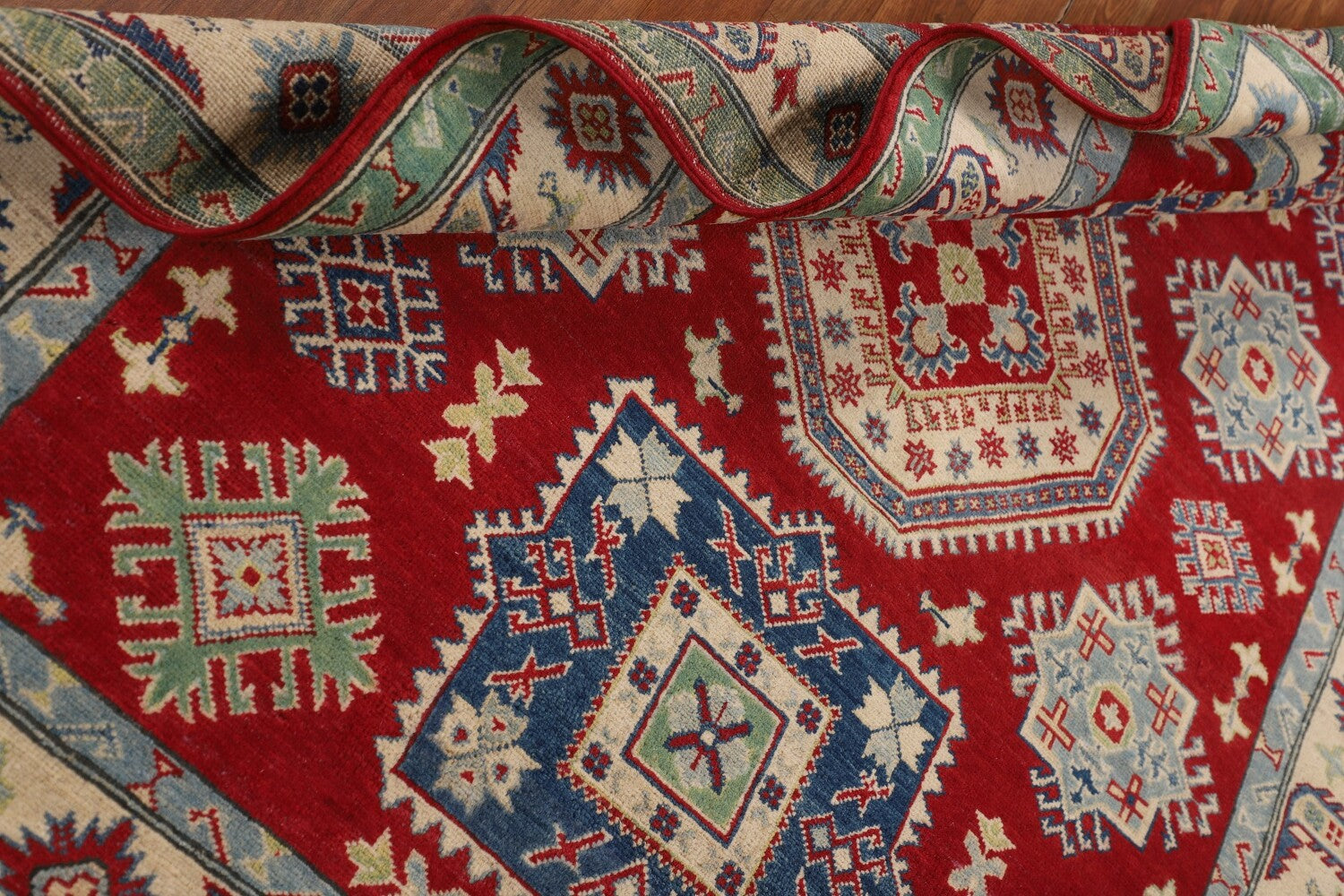 A Beautiful Genuine Pakistan Kazak rug is Hand Knotted by skillful weavers in Pakistan with 100% Wool Material. This rug is in New, First Quality condition. dimensions are 6' 7'' X 5' 2'' in foot and 201 X 157 in centimeter. the primary color is Red.