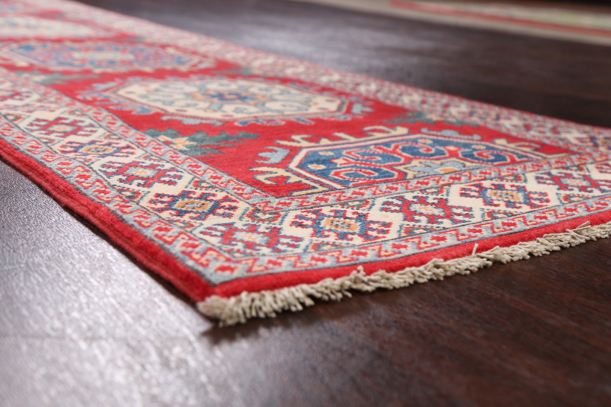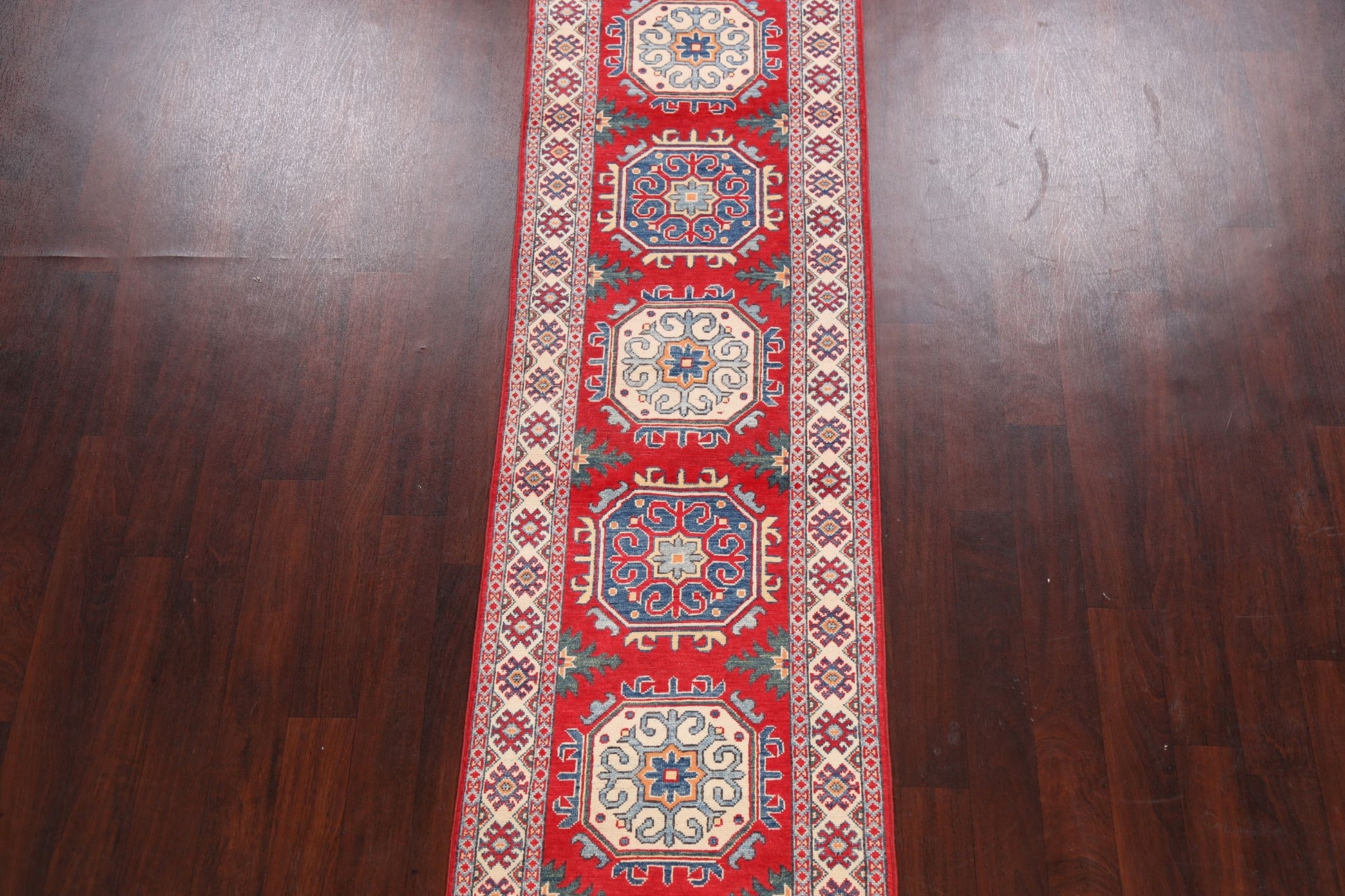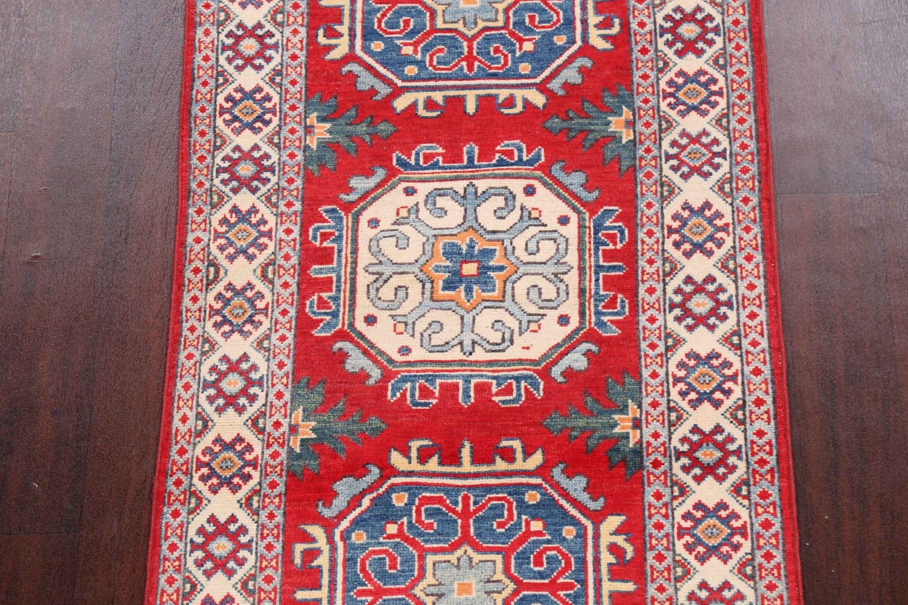 A Beautiful Genuine Pakistan Kazak rug is Hand Knotted by skillful weavers in Pakistan with 100% Wool Material. This rug is in New, First Quality condition. dimensions are 9' 8'' X 2' 6'' in foot and 295 X 76 in centimeter. the primary color is Red.