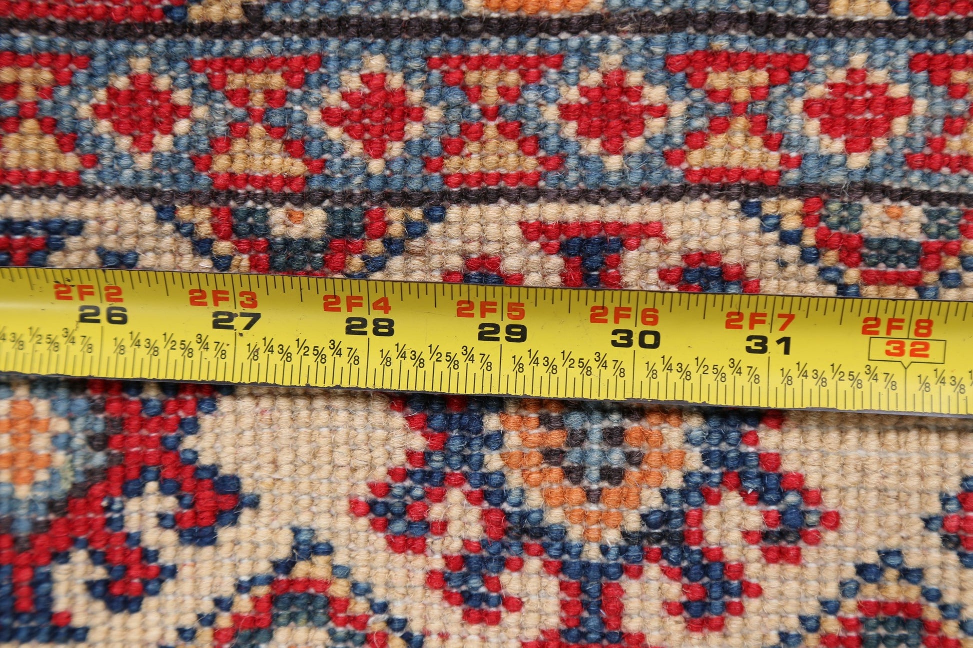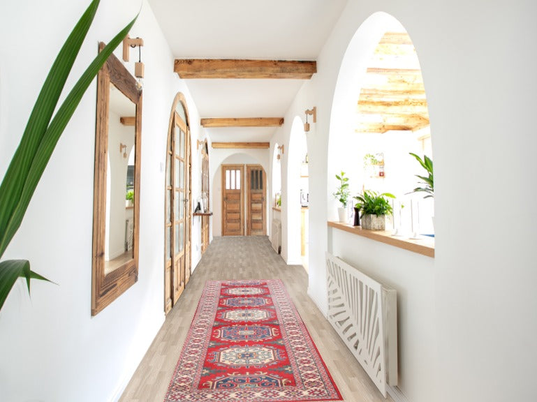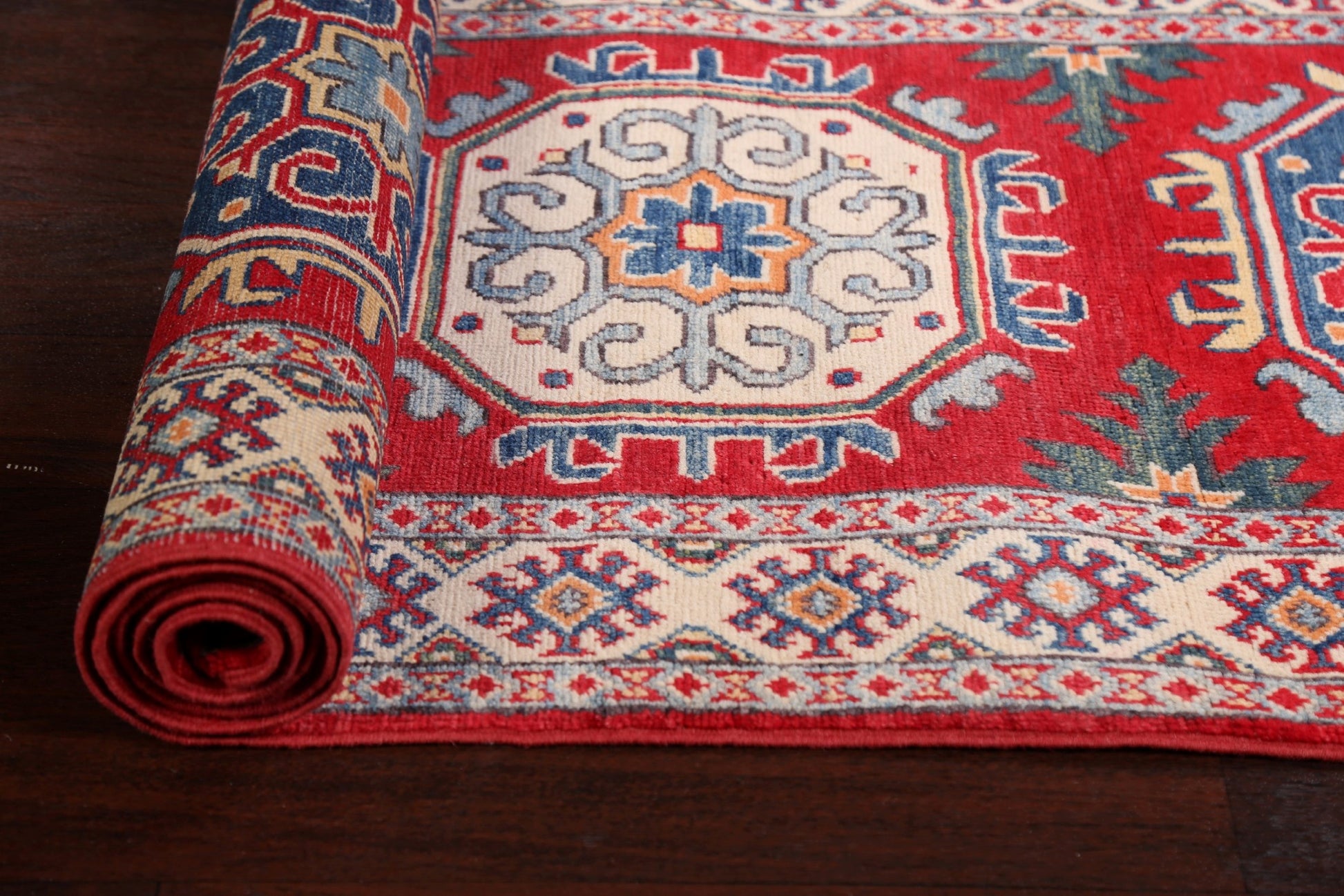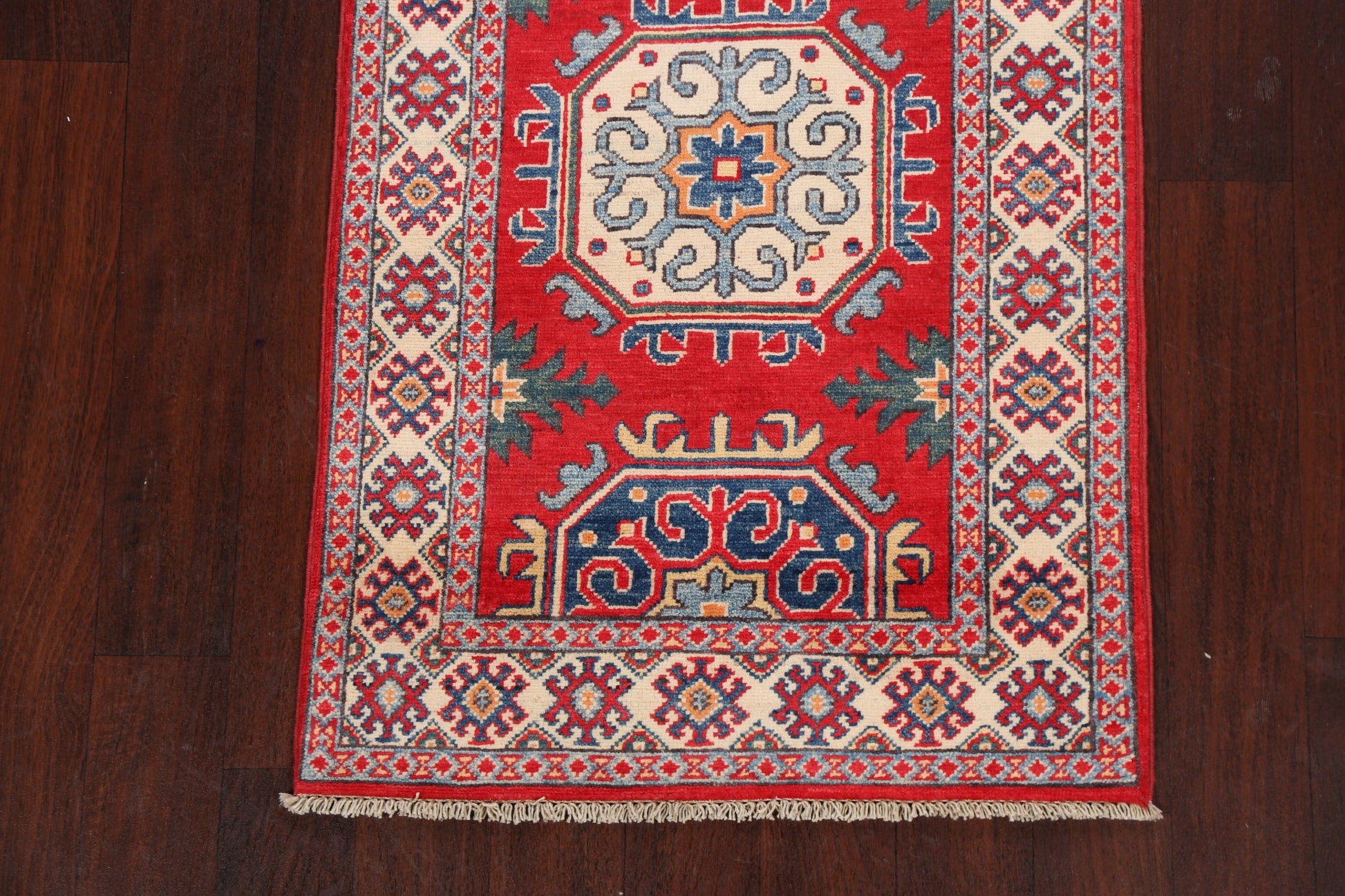 A Beautiful Genuine Pakistan Kazak rug is Hand Knotted by skillful weavers in Pakistan with 100% Wool Material. This rug is in New, First Quality condition. dimensions are 9' 8'' X 2' 6'' in foot and 295 X 76 in centimeter. the primary color is Red.