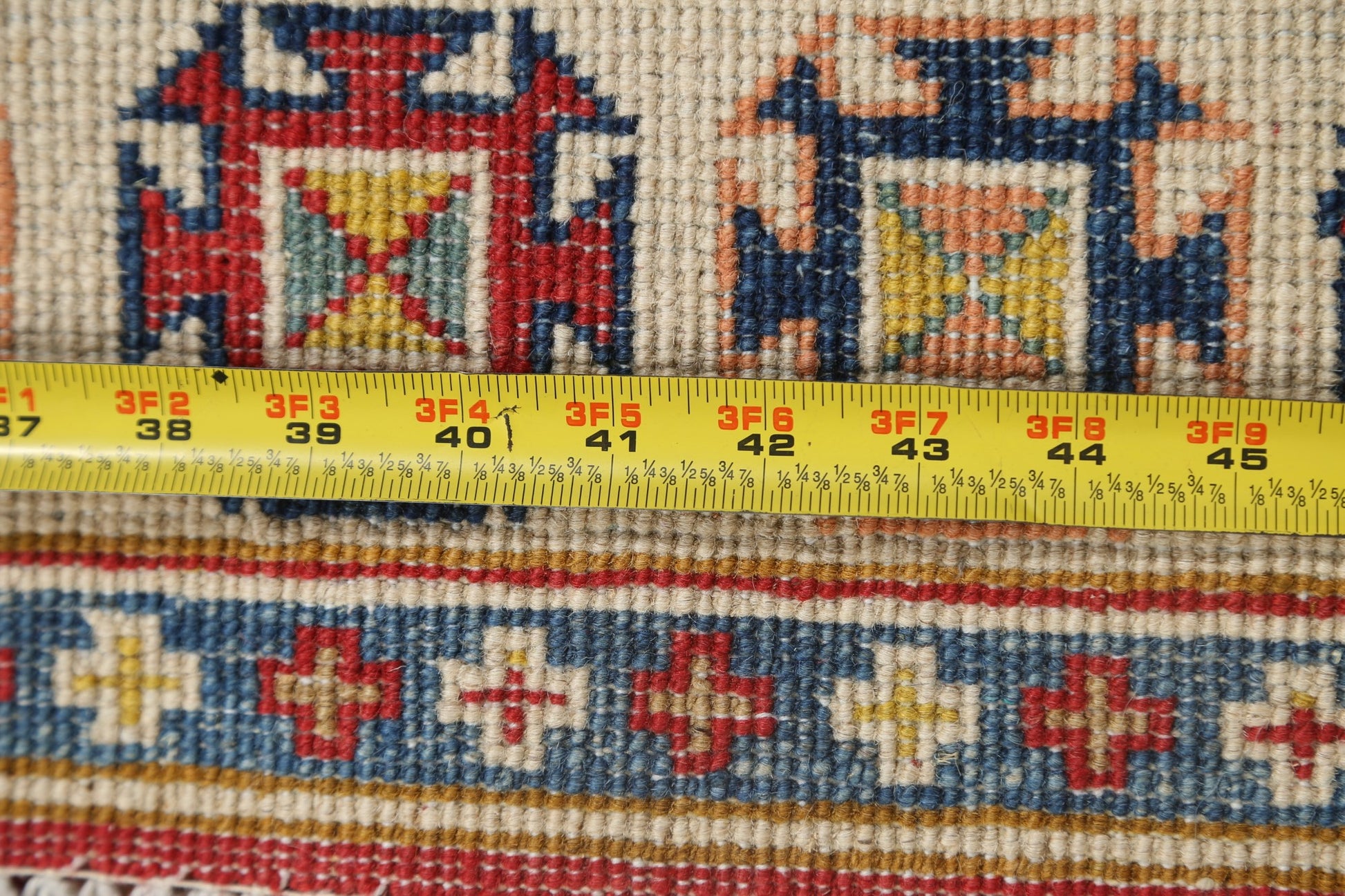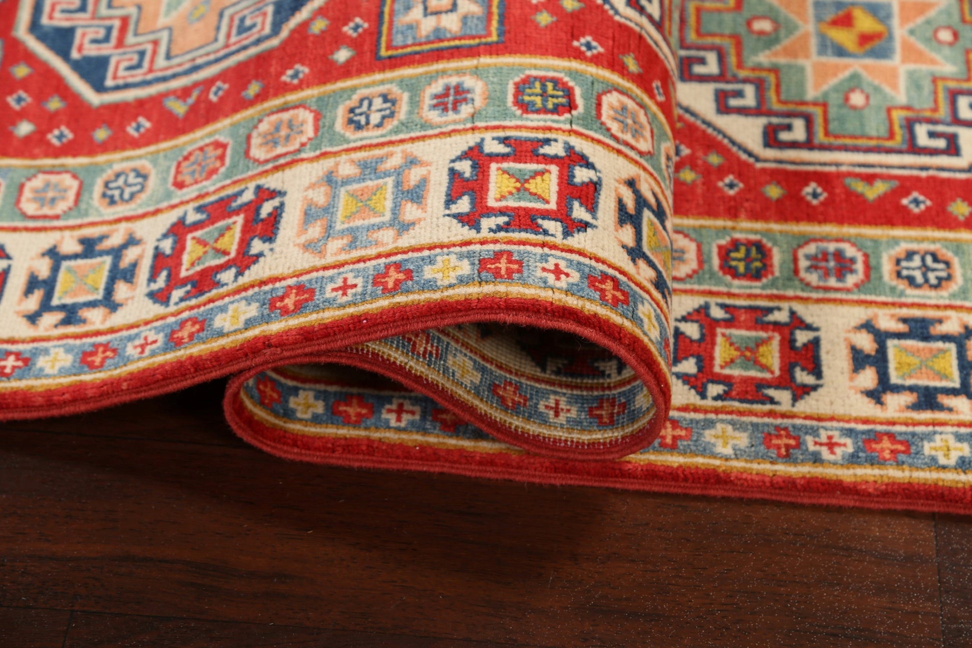 A Beautiful Genuine Pakistan Kazak rug is Hand Knotted by skillful weavers in Pakistan with 100% Wool Material. This rug is in New, First Quality condition. dimensions are 9' 9'' X 2' 9'' in foot and 297 X 84 in centimeter. the primary color is Red.