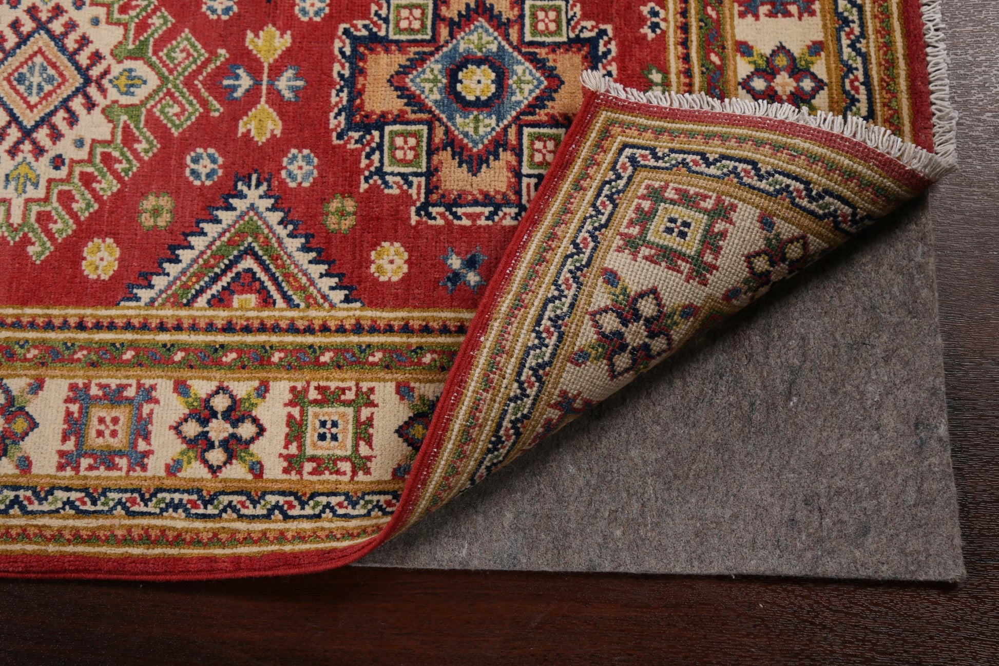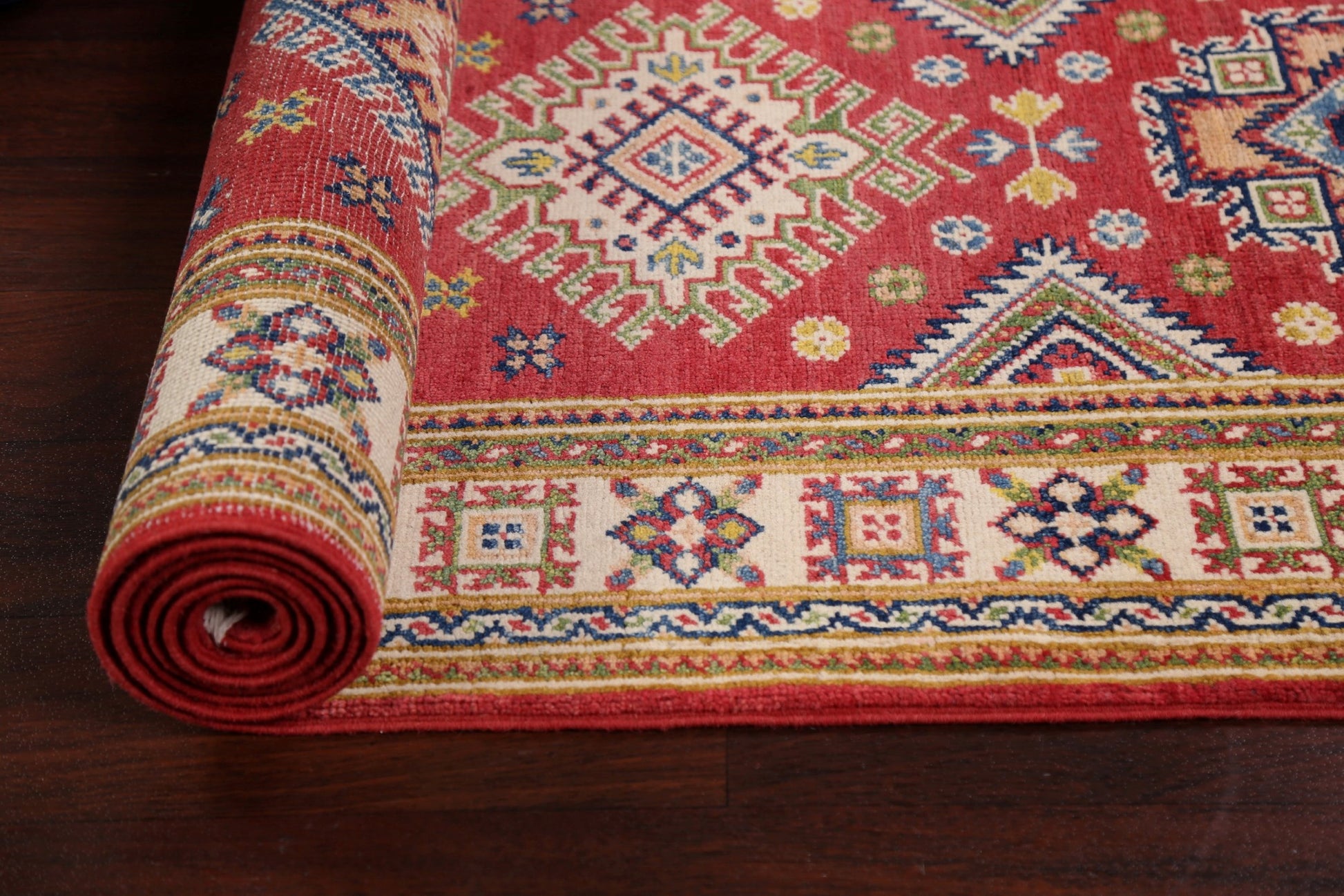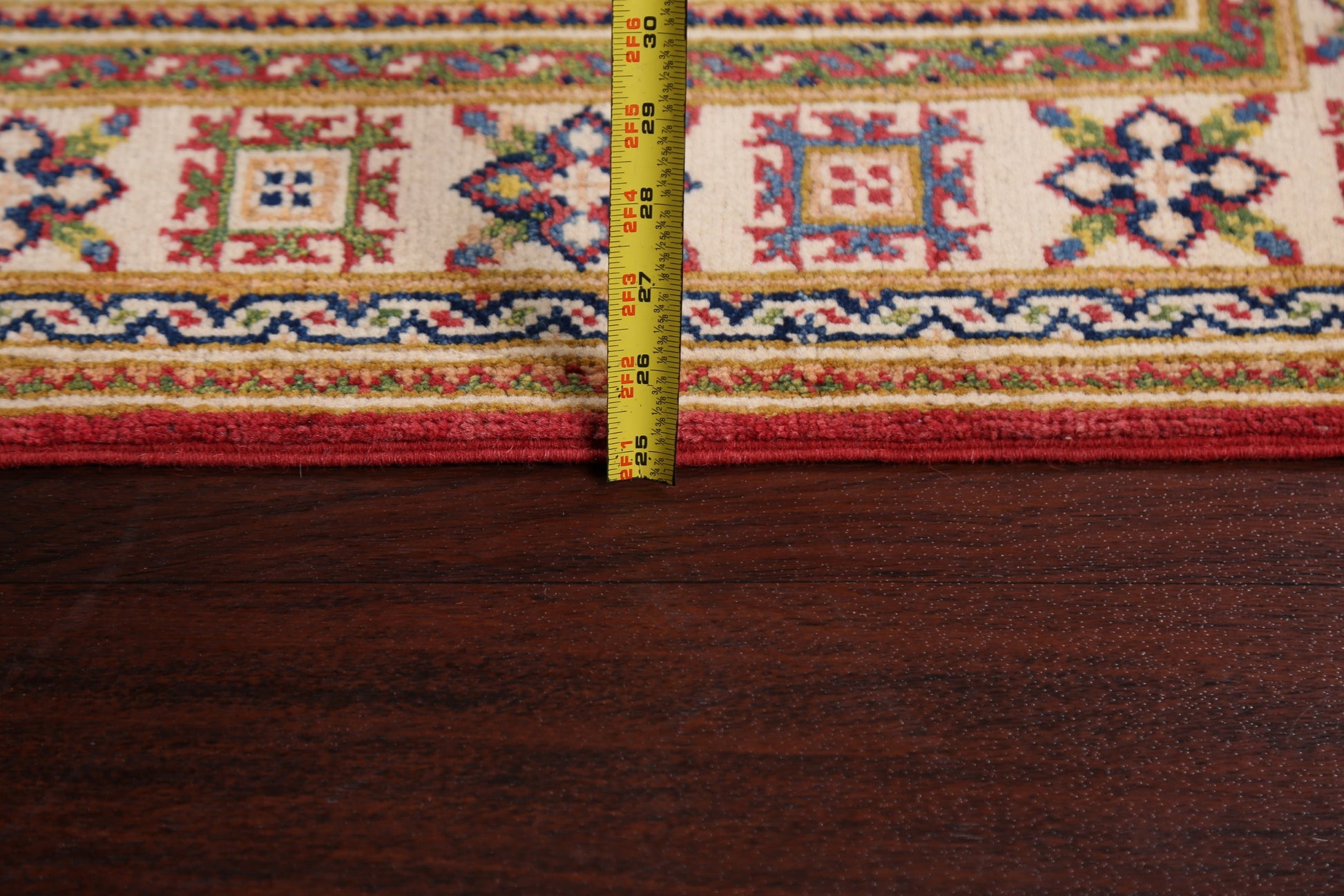 A Beautiful Genuine Pakistan Kazak rug is Hand Knotted by skillful weavers in Pakistan with 100% Wool Material. This rug is in New, First Quality condition. dimensions are 8' 2'' X 2' 9'' in foot and 249 X 84 in centimeter. the primary color is Red.