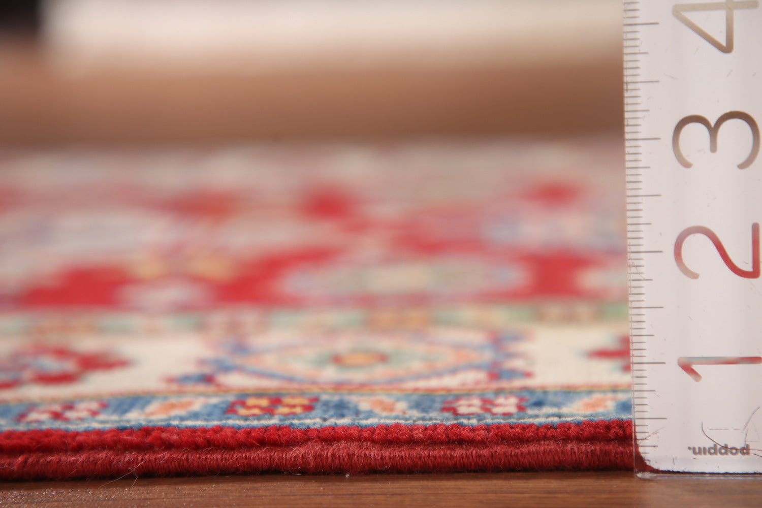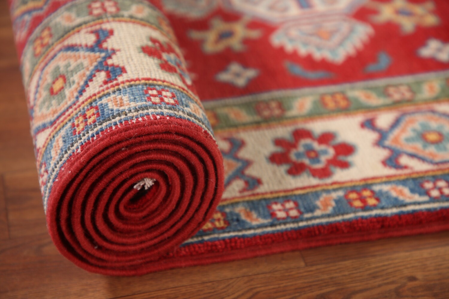 A Beautiful Genuine Pakistan Kazak rug is Hand Knotted by skillful weavers in Pakistan with 100% Wool Material. This rug is in New, First Quality condition. dimensions are 7' 9'' X 2' 8'' in foot and 236 X 81 in centimeter. the primary color is Red.
