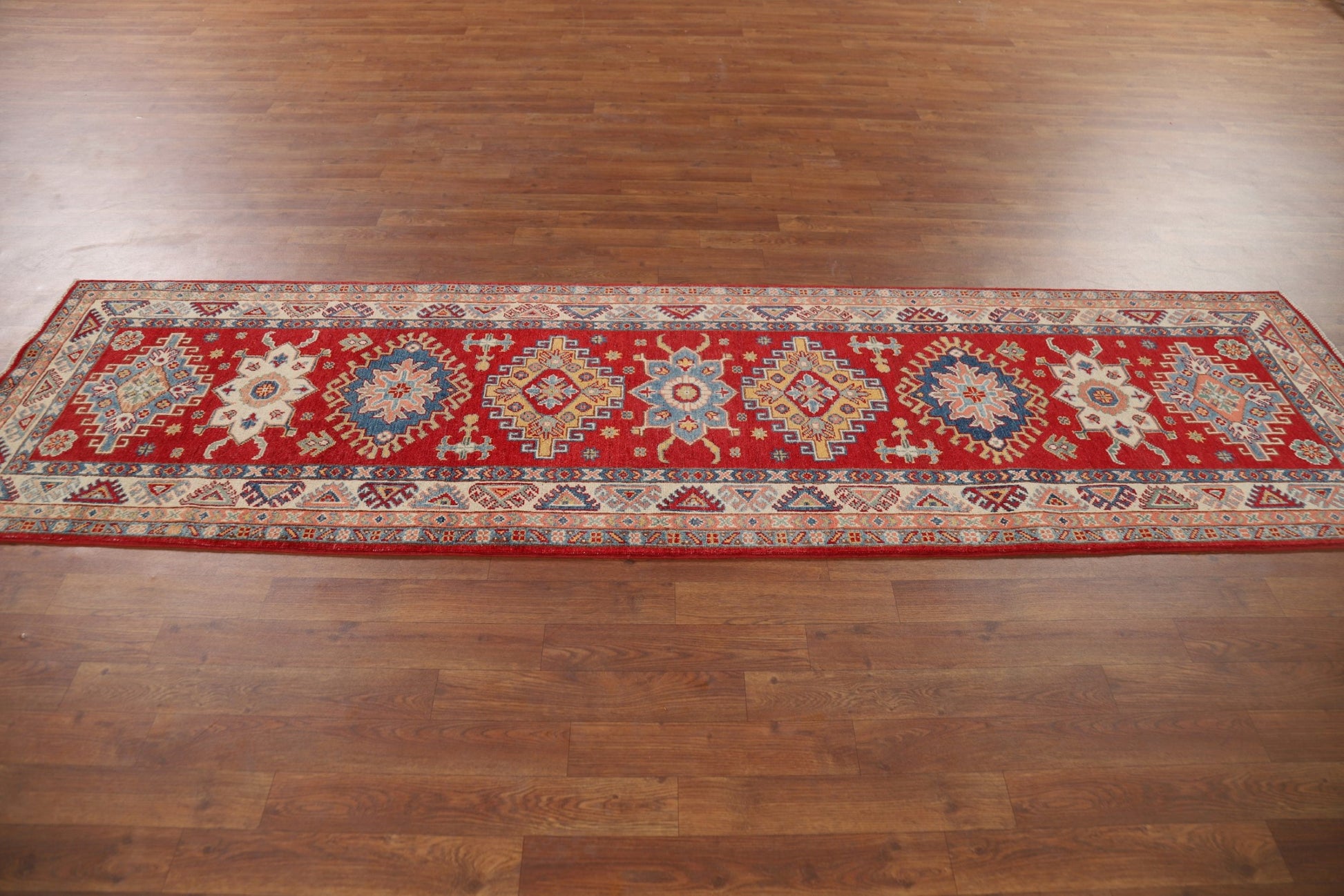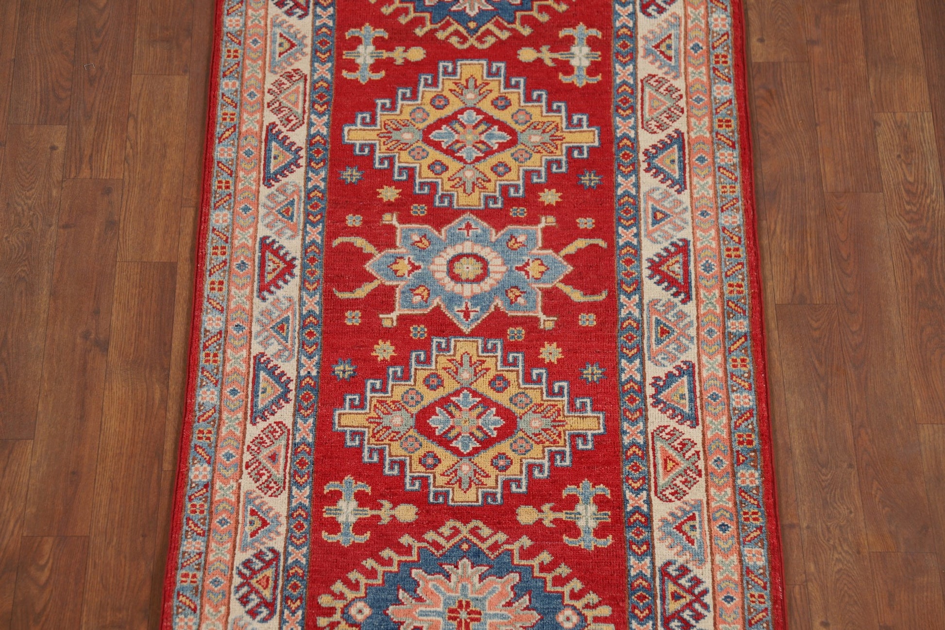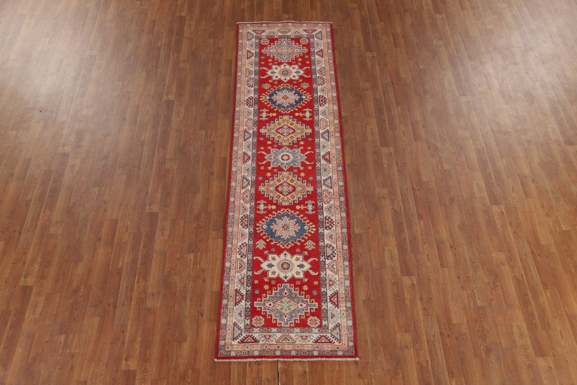 A Beautiful Genuine Pakistan Kazak rug is Hand Knotted by skillful weavers in Pakistan with 100% Wool Material. This rug is in New, First Quality condition. dimensions are 9' 4'' X 2' 7'' in foot and 284 X 79 in centimeter. the primary color is Red.