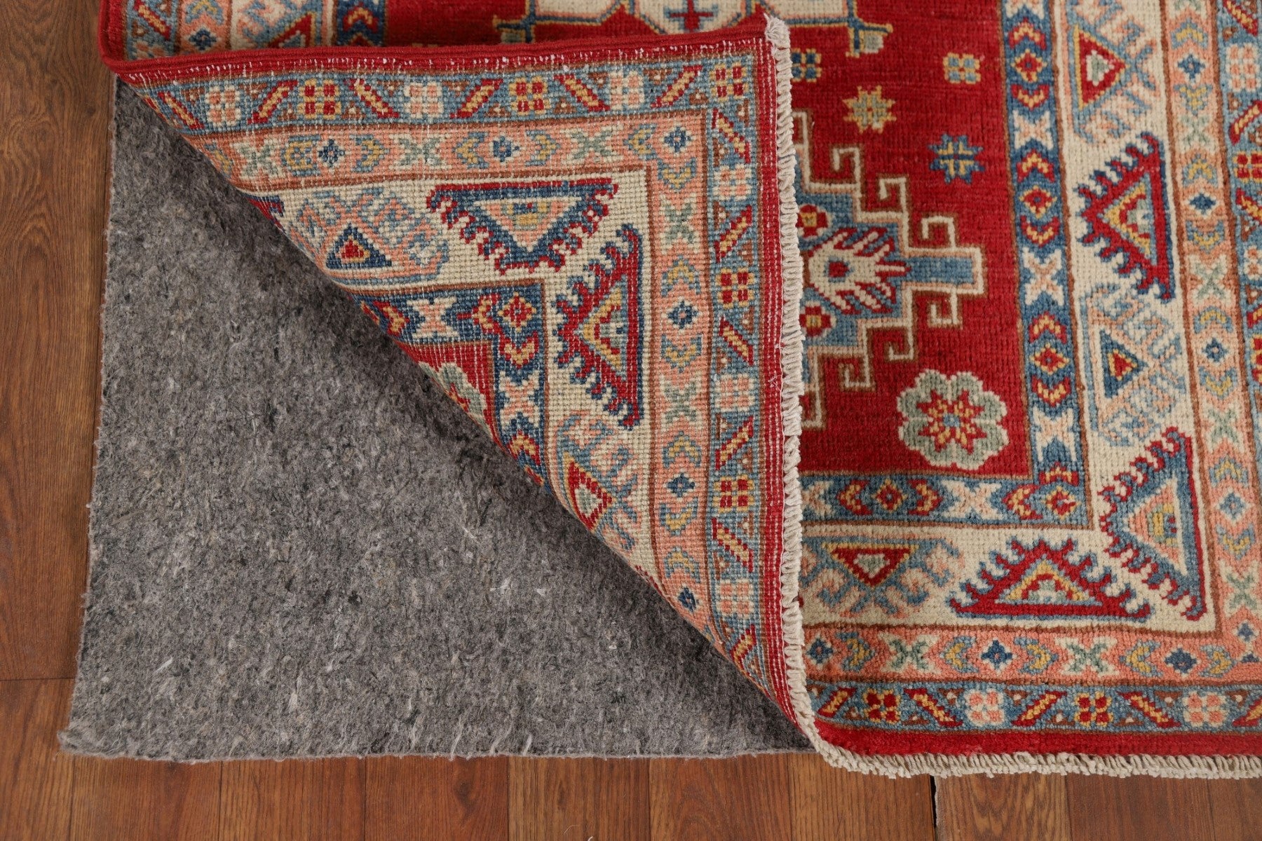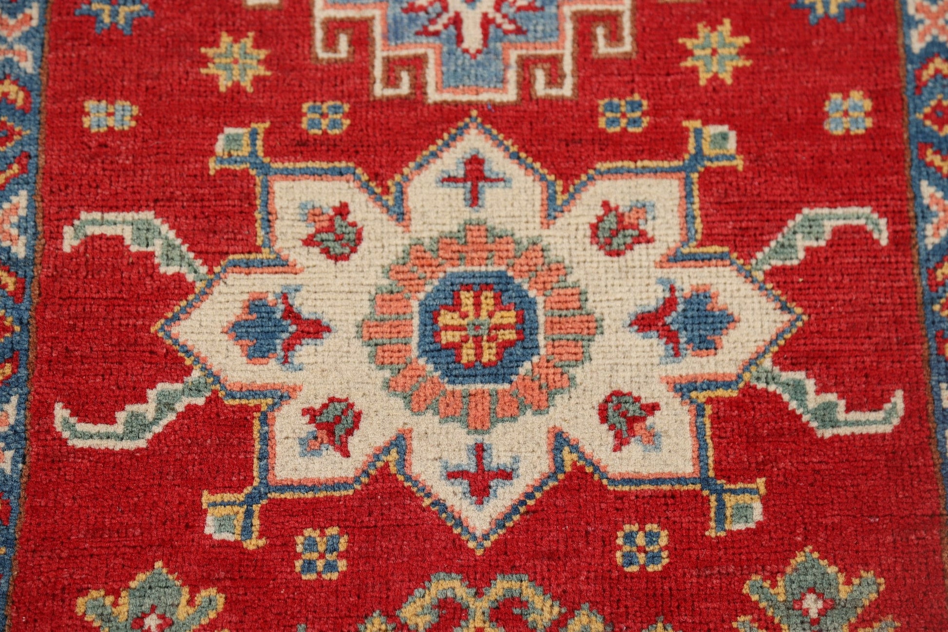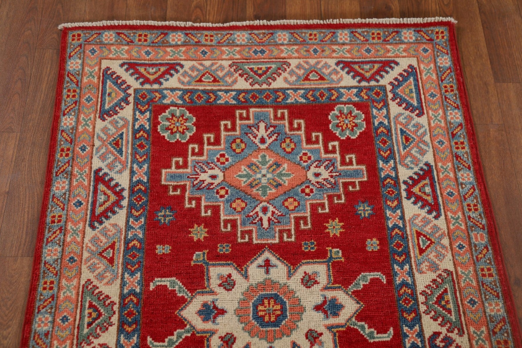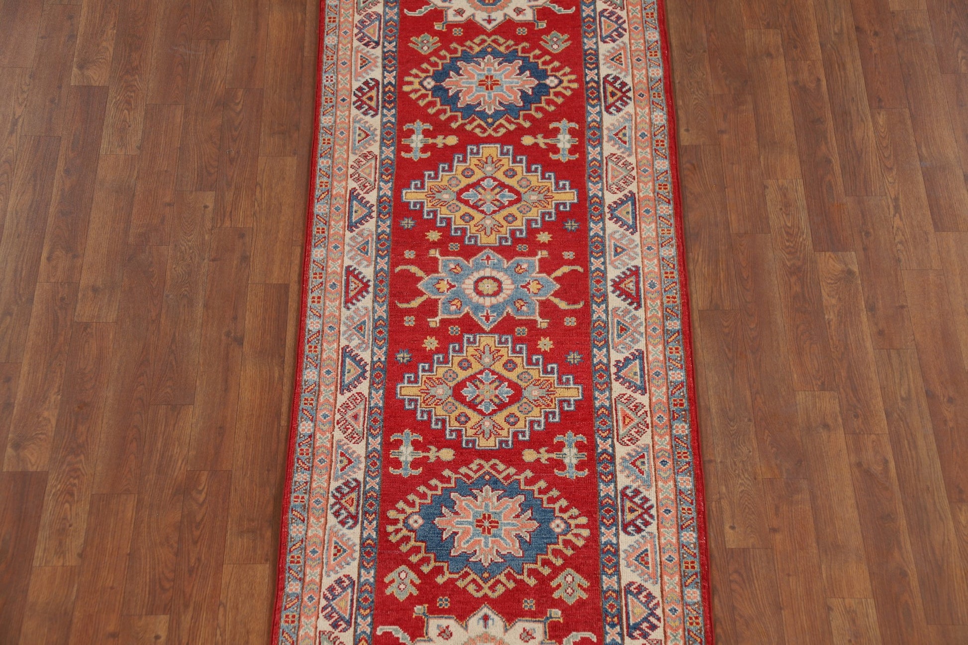 A Beautiful Genuine Pakistan Kazak rug is Hand Knotted by skillful weavers in Pakistan with 100% Wool Material. This rug is in New, First Quality condition. dimensions are 9' 4'' X 2' 7'' in foot and 284 X 79 in centimeter. the primary color is Red.