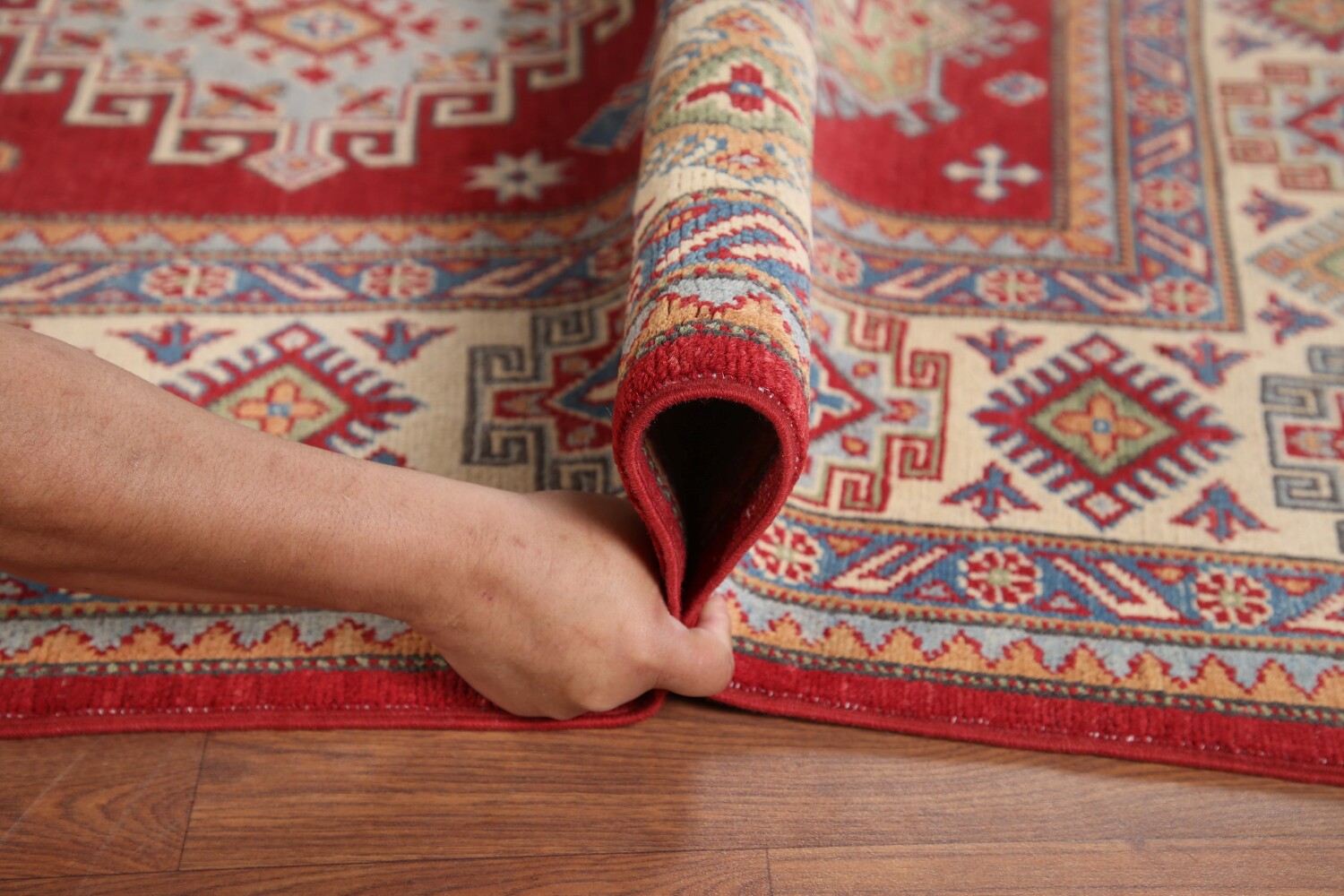 A Beautiful Genuine Pakistan Kazak rug is Hand Knotted by skillful weavers in Pakistan with 100% Wool Material. This rug is in New, First Quality condition. dimensions are 10' 5'' X 6' 3'' in foot and 318 X 191 in centimeter. the primary color is Red.
