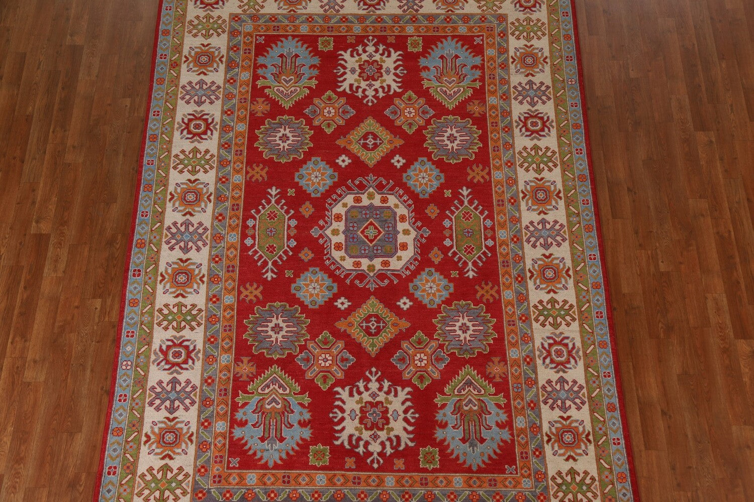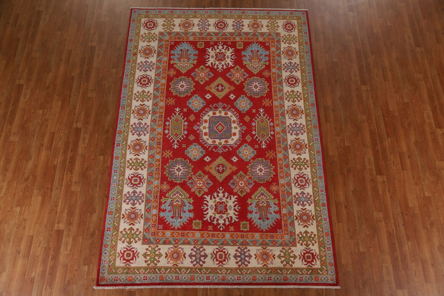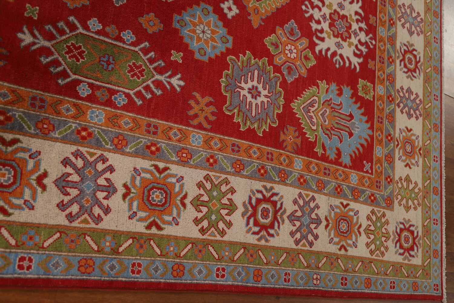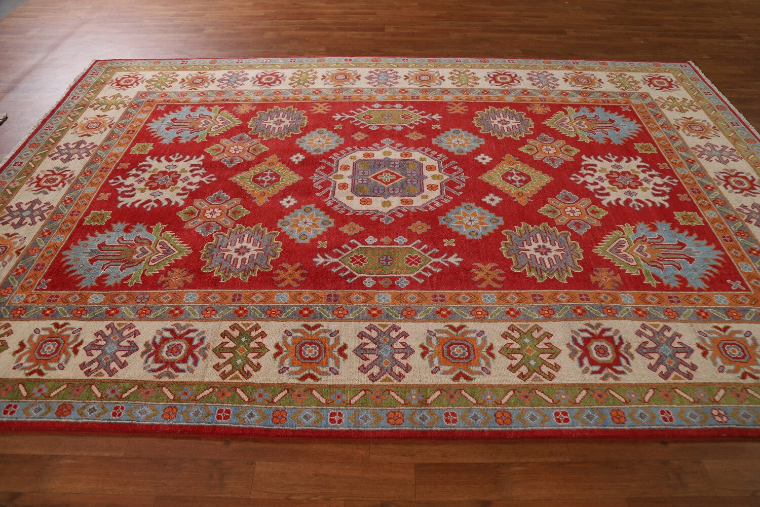 A Beautiful Genuine Pakistan Kazak rug is Hand Knotted by skillful weavers in Pakistan with 100% Wool Material. This rug is in New, First Quality condition. dimensions are 9' 10'' X 6' 7'' in foot and 300 X 201 in centimeter. the primary color is Red.