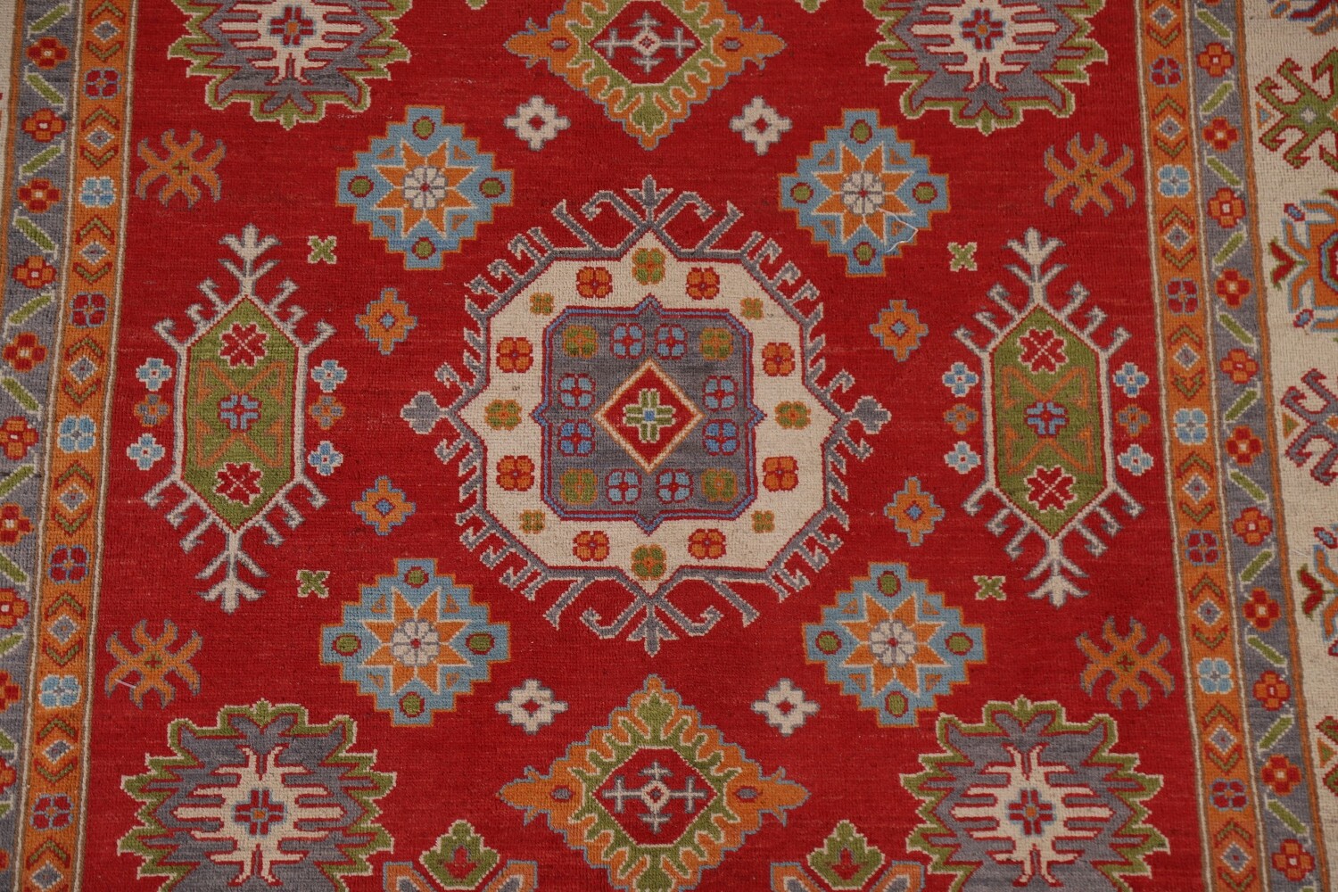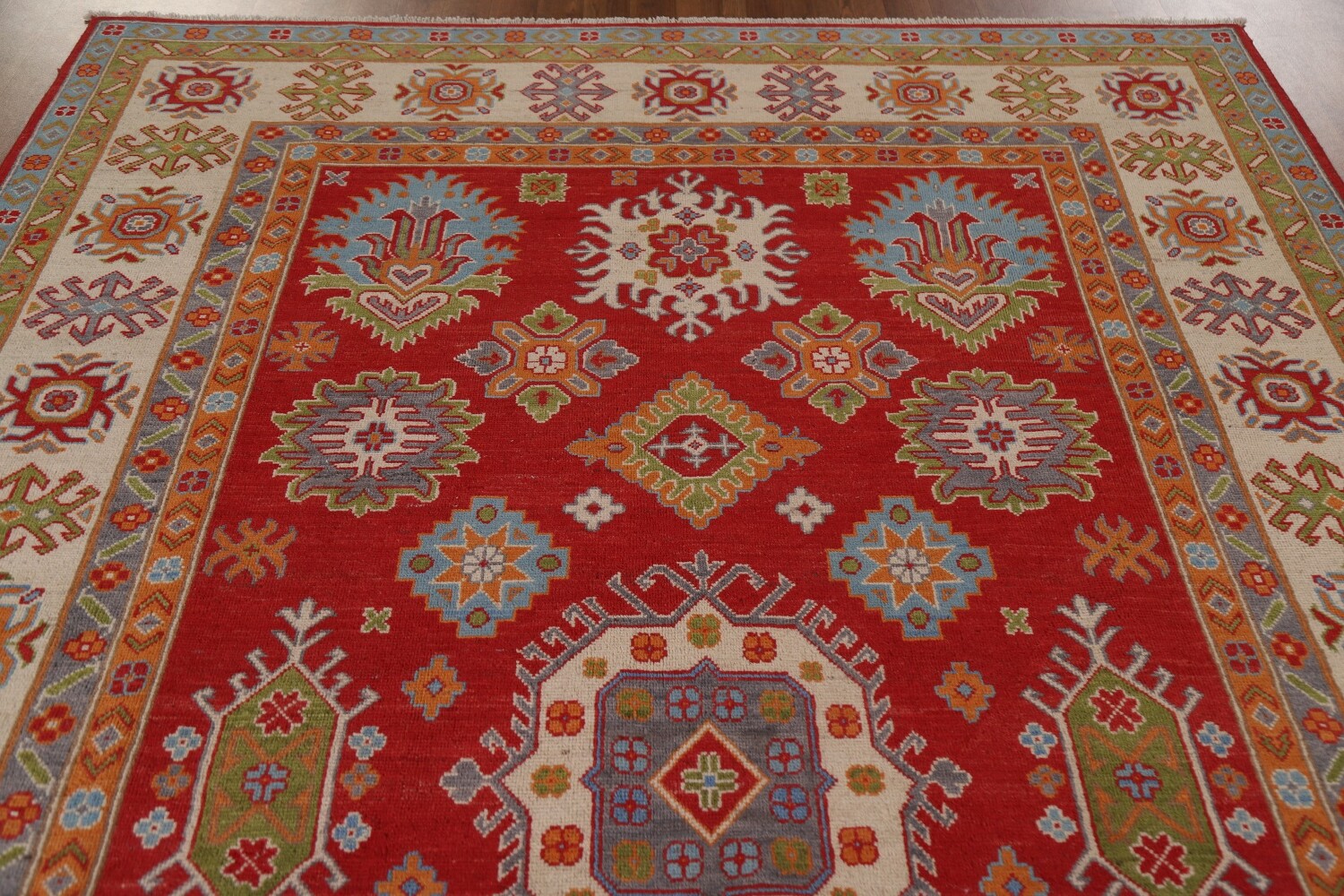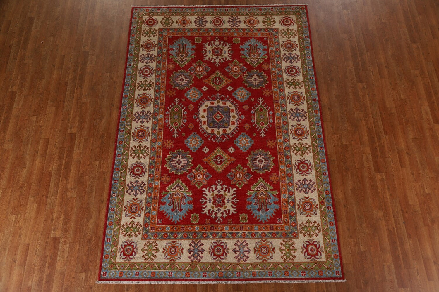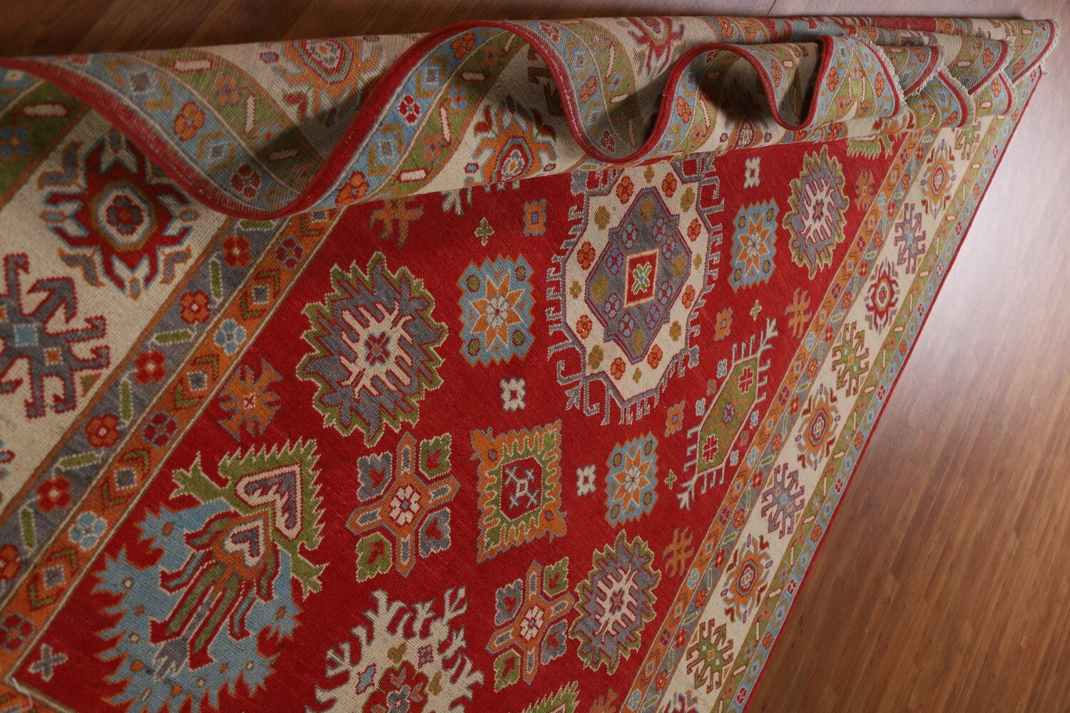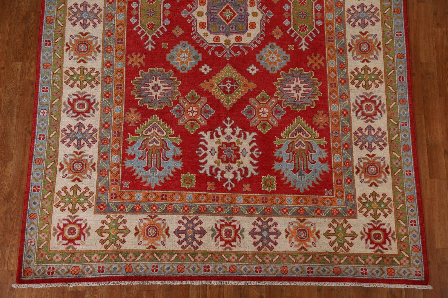 A Beautiful Genuine Pakistan Kazak rug is Hand Knotted by skillful weavers in Pakistan with 100% Wool Material. This rug is in New, First Quality condition. dimensions are 9' 10'' X 6' 7'' in foot and 300 X 201 in centimeter. the primary color is Red.