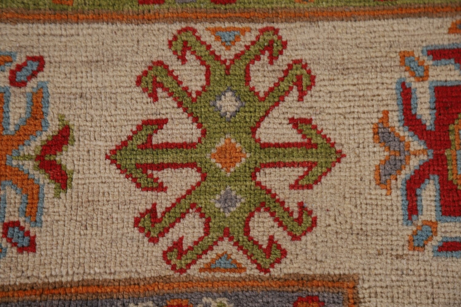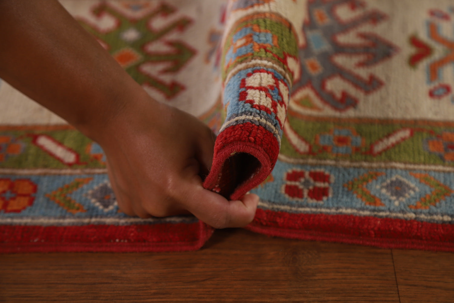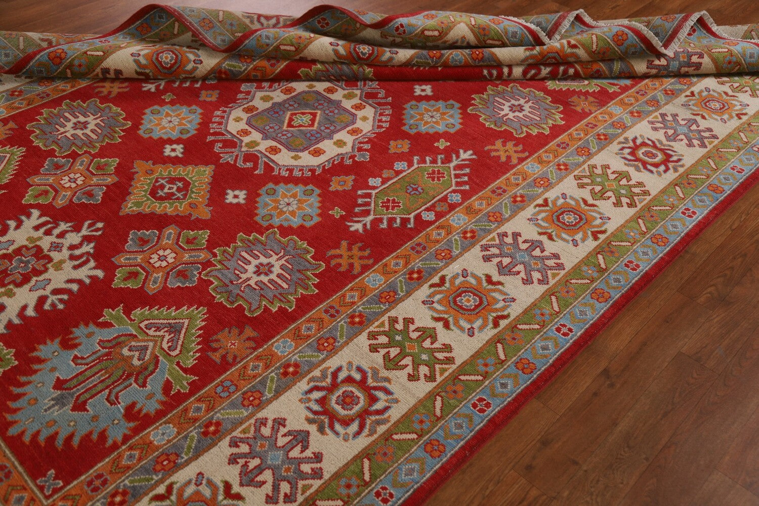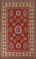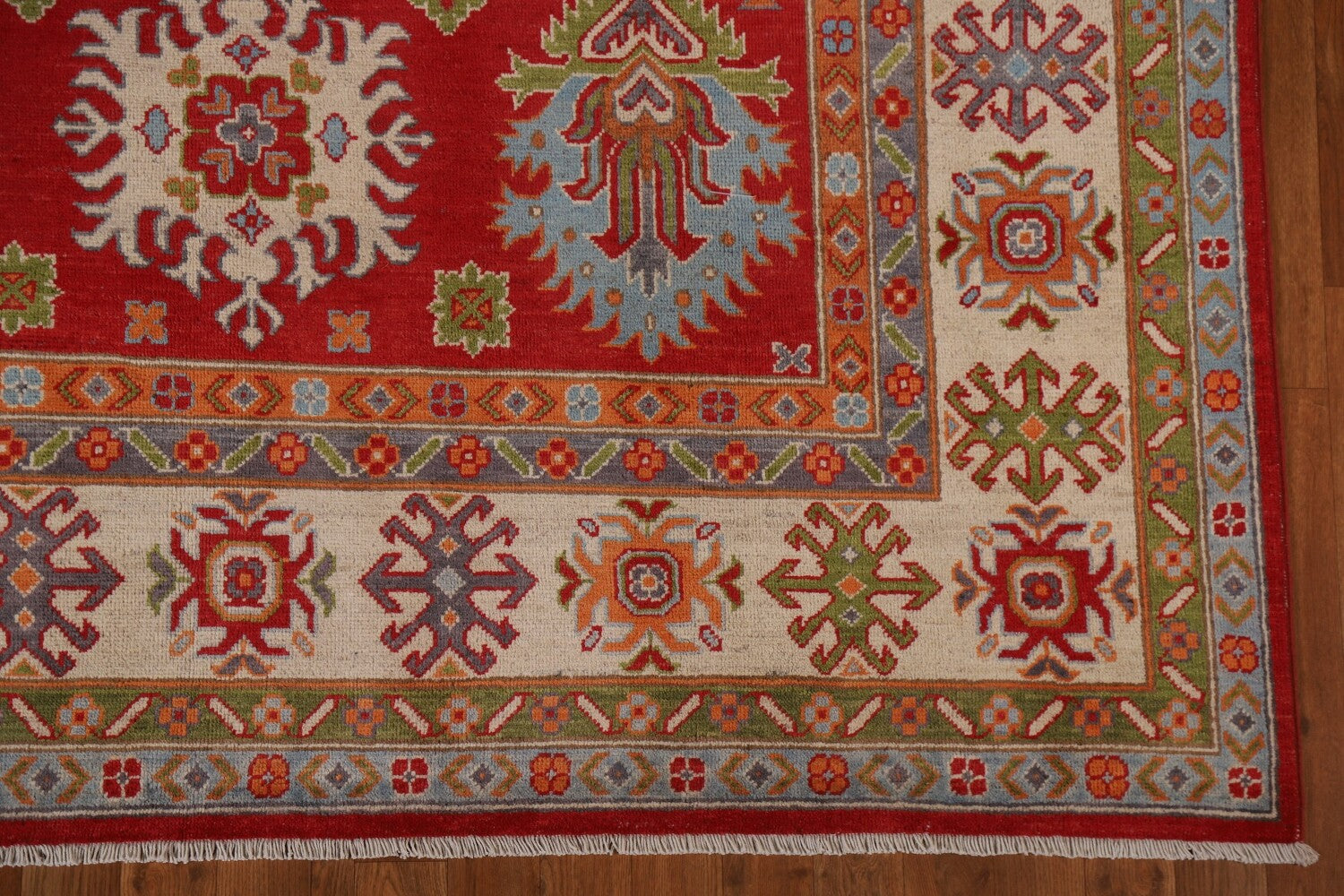 A Beautiful Genuine Pakistan Kazak rug is Hand Knotted by skillful weavers in Pakistan with 100% Wool Material. This rug is in New, First Quality condition. dimensions are 9' 10'' X 6' 7'' in foot and 300 X 201 in centimeter. the primary color is Red.