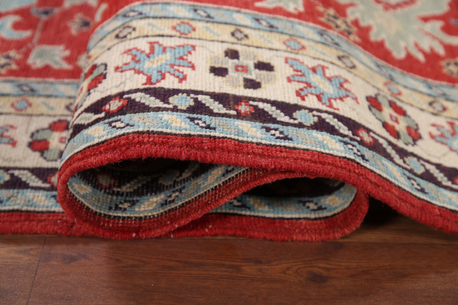 A Beautiful Genuine Pakistan Kazak rug is Hand Knotted by skillful weavers in Pakistan with 100% Wool Material. This rug is in New, First Quality condition. dimensions are 9' 8'' X 2' 10'' in foot and 295 X 86 in centimeter. the primary color is Red.