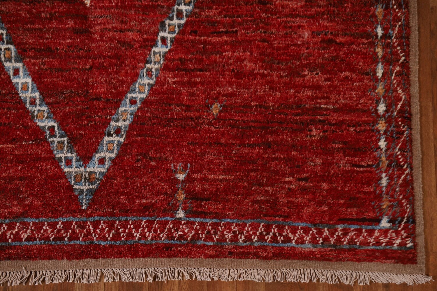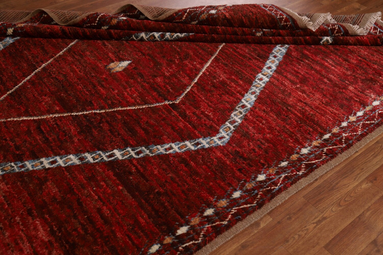 A Beautiful Genuine Pakistan Moroccan rug is Hand Knotted by skillful weavers in Pakistan with 100% Wool Material. This rug is in condition. dimensions are 10' 0'' X 6' 5'' in foot and 305 X 196 in centimeter. the primary color is Red.