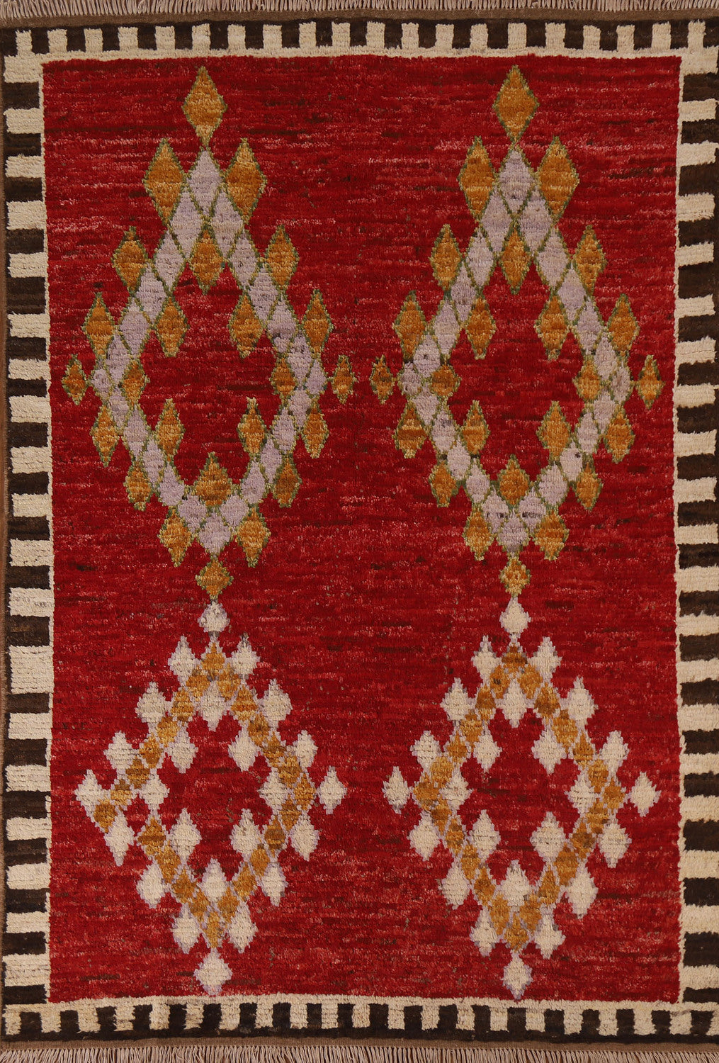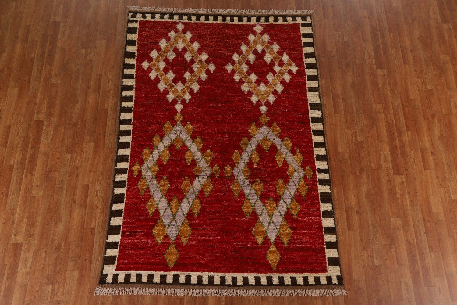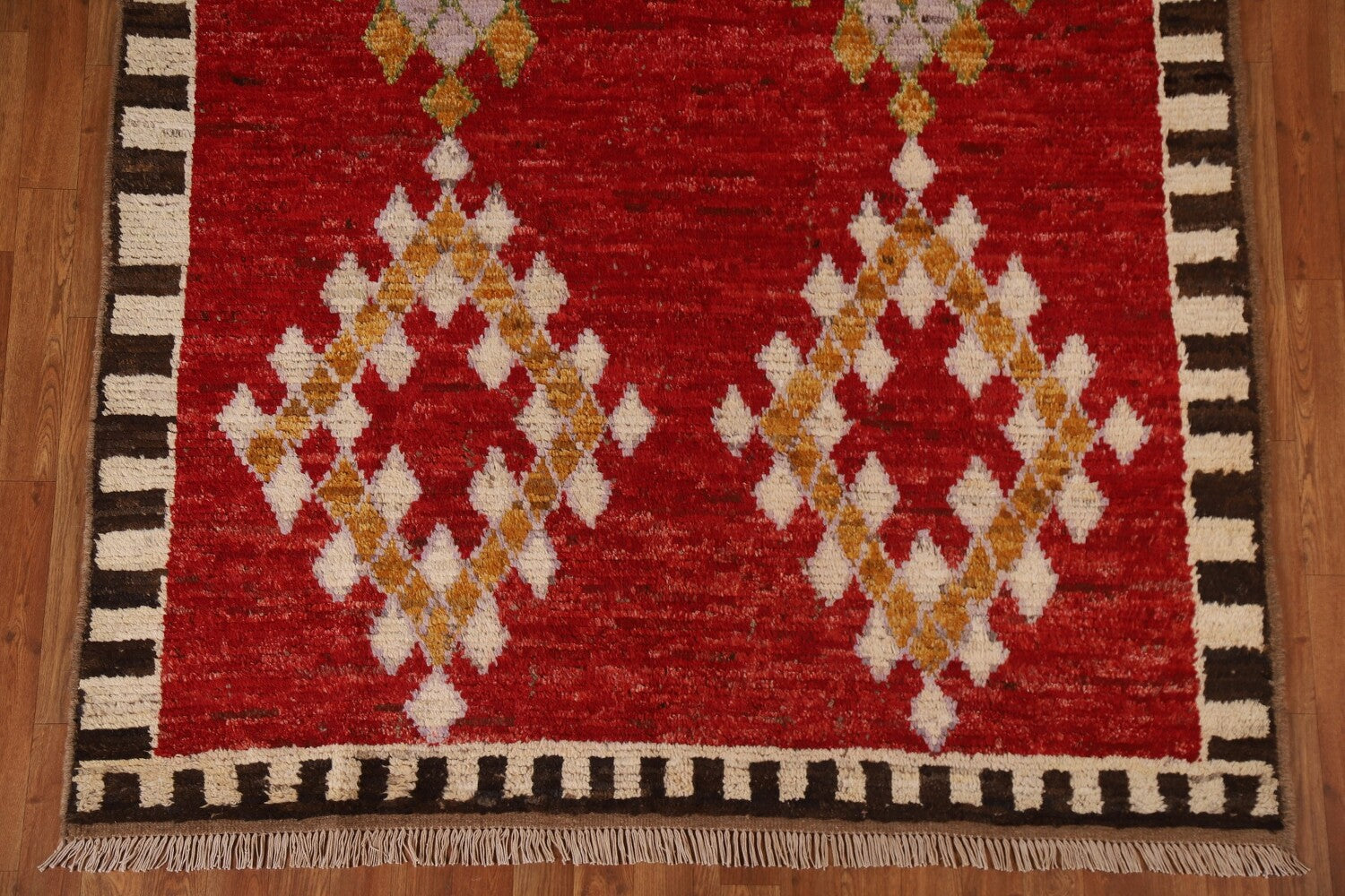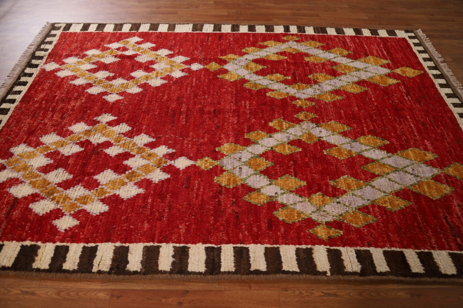 A Beautiful Genuine Pakistan Moroccan rug is Hand Knotted by skillful weavers in Pakistan with 100% Wool Material. This rug is in condition. dimensions are 8' 1'' X 5' 7'' in foot and 246 X 170 in centimeter. the primary color is Red.
