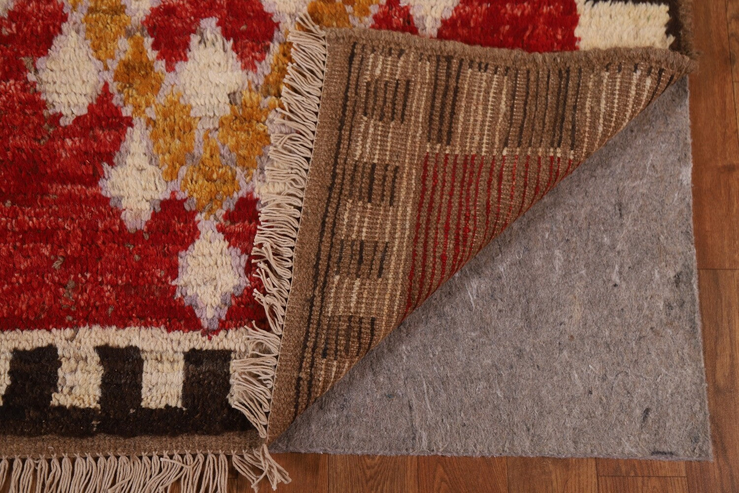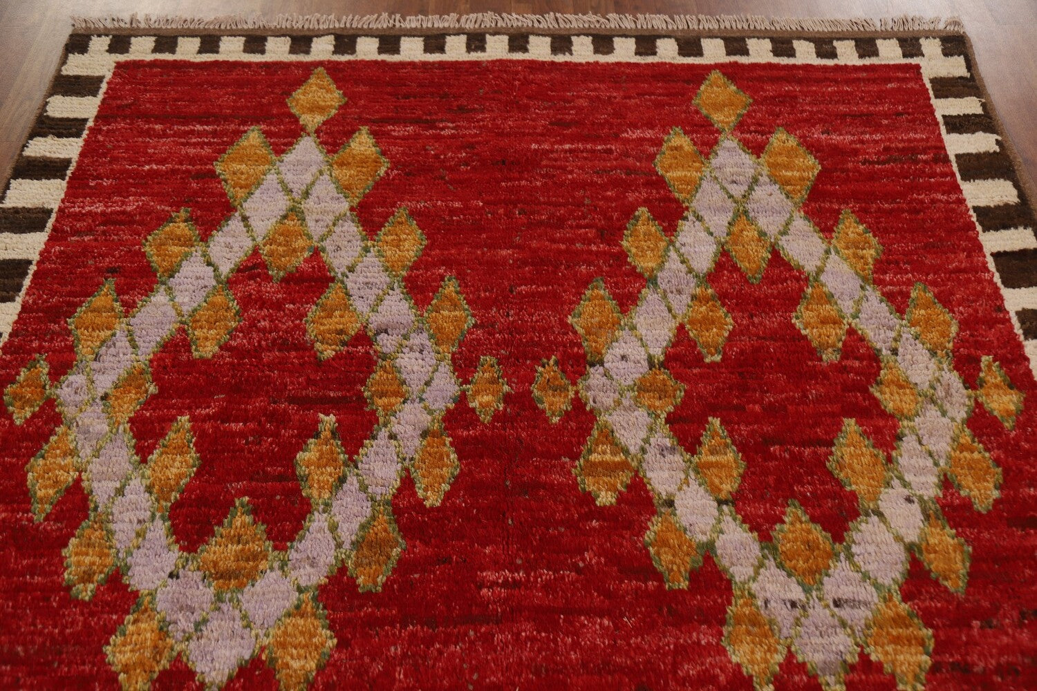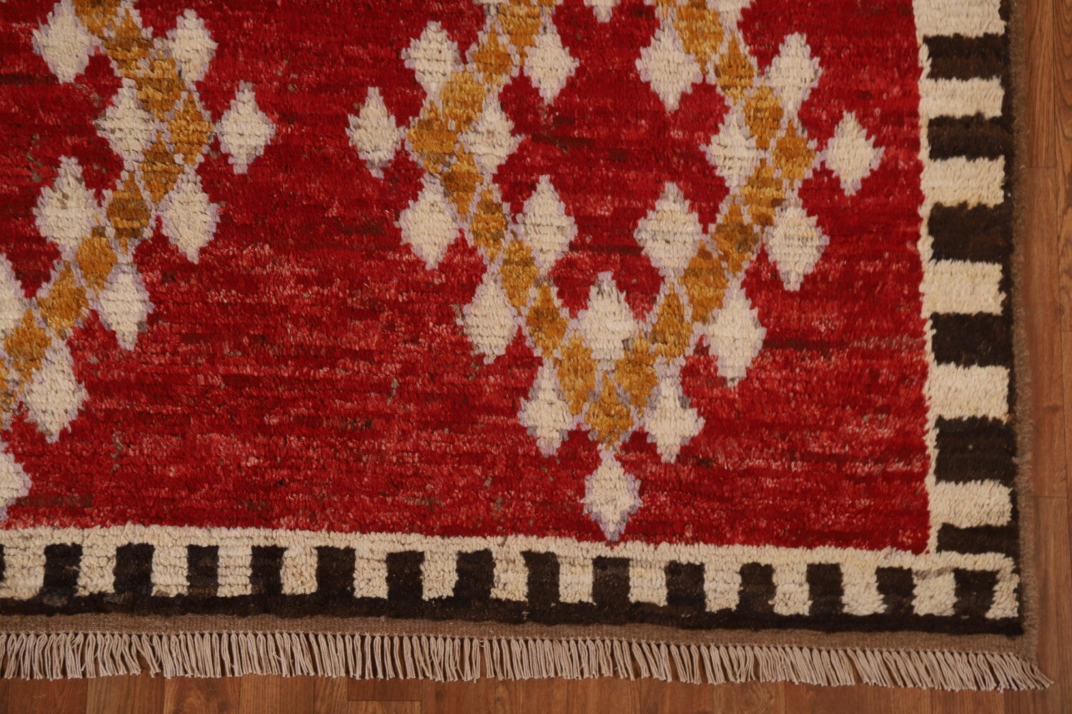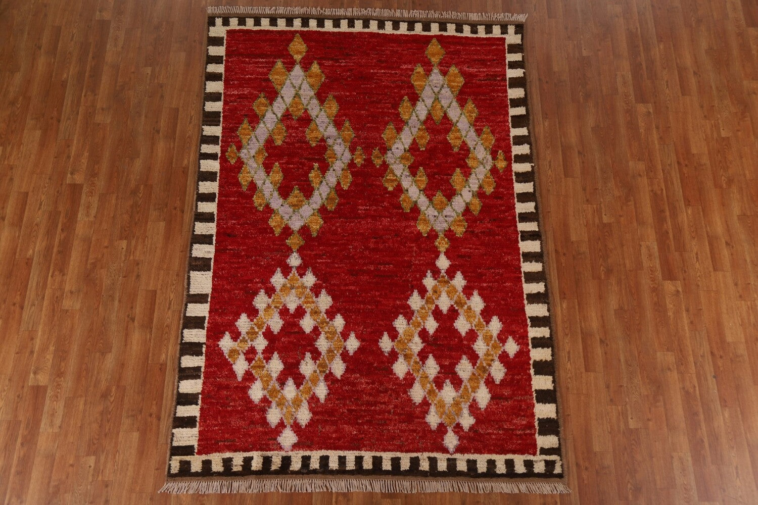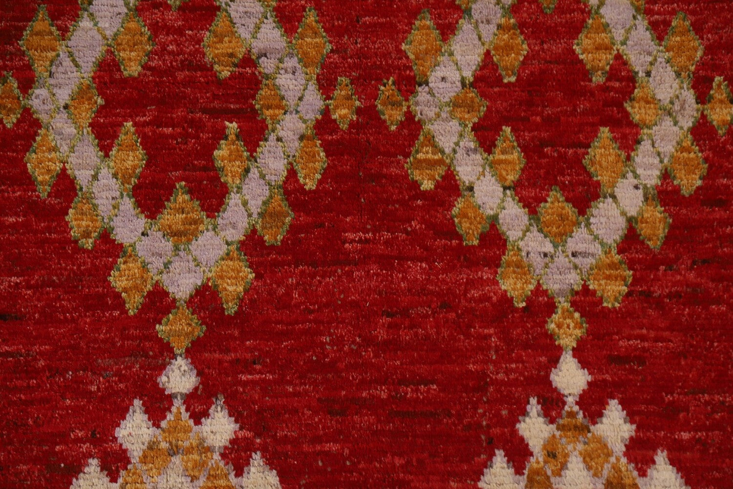 A Beautiful Genuine Pakistan Moroccan rug is Hand Knotted by skillful weavers in Pakistan with 100% Wool Material. This rug is in condition. dimensions are 8' 1'' X 5' 7'' in foot and 246 X 170 in centimeter. the primary color is Red.