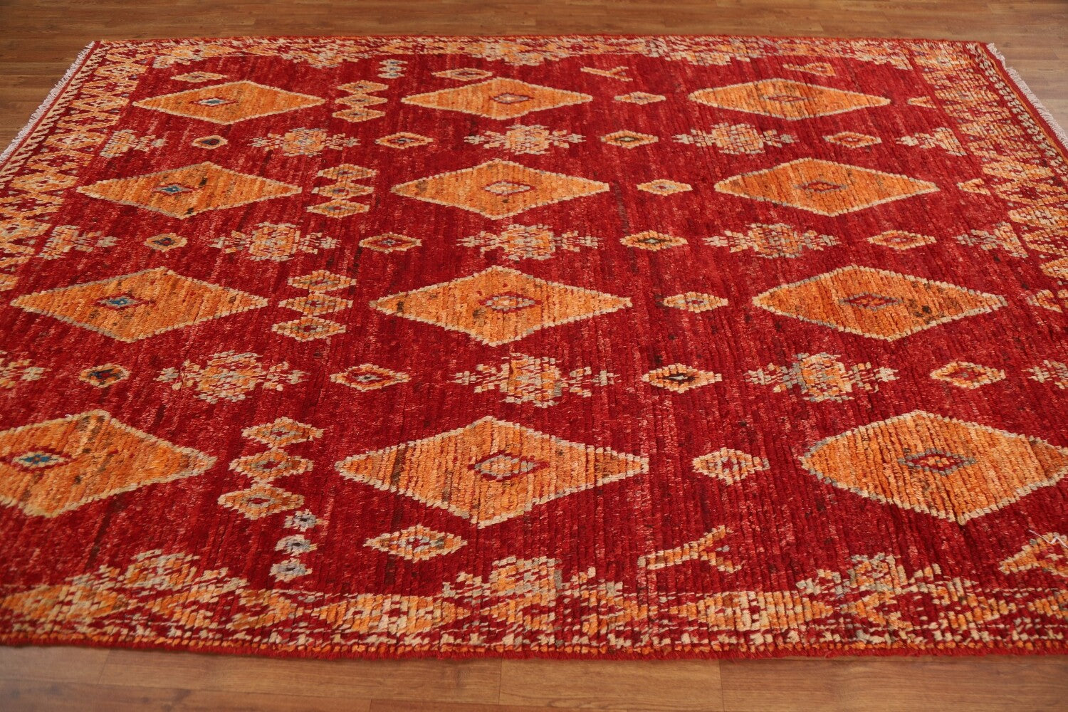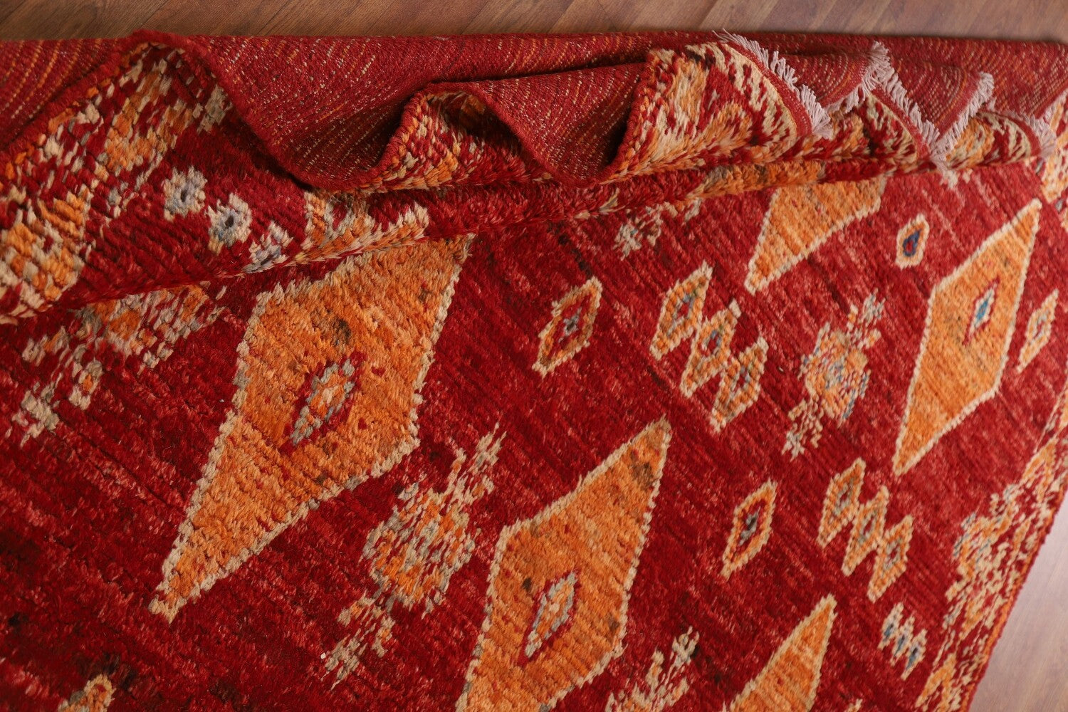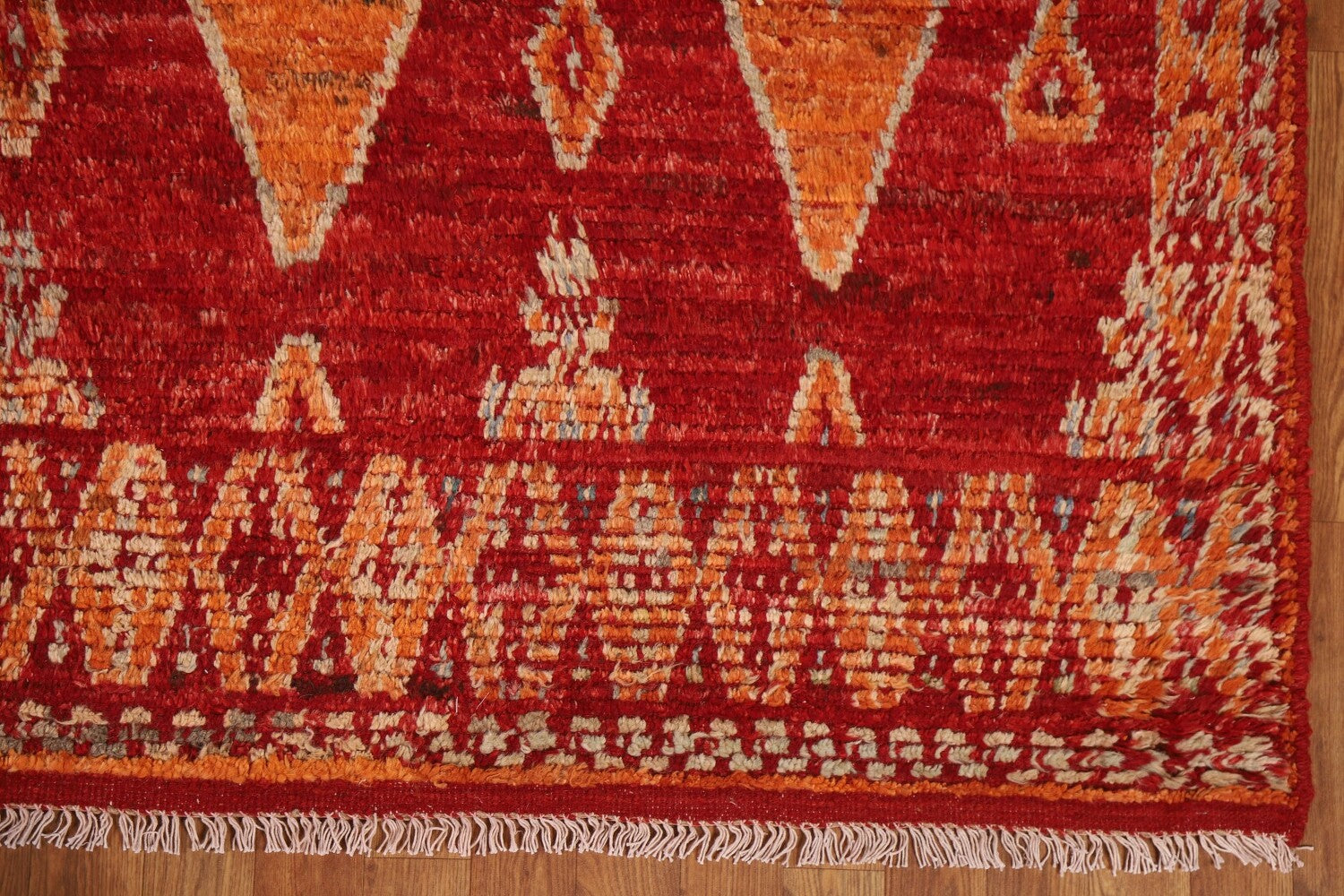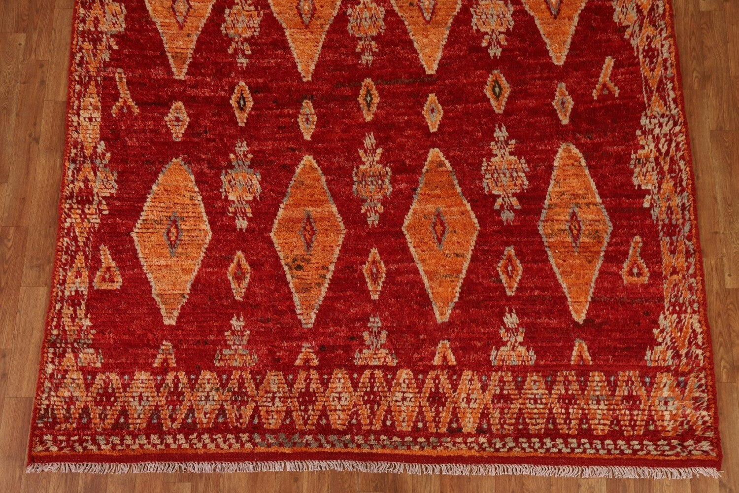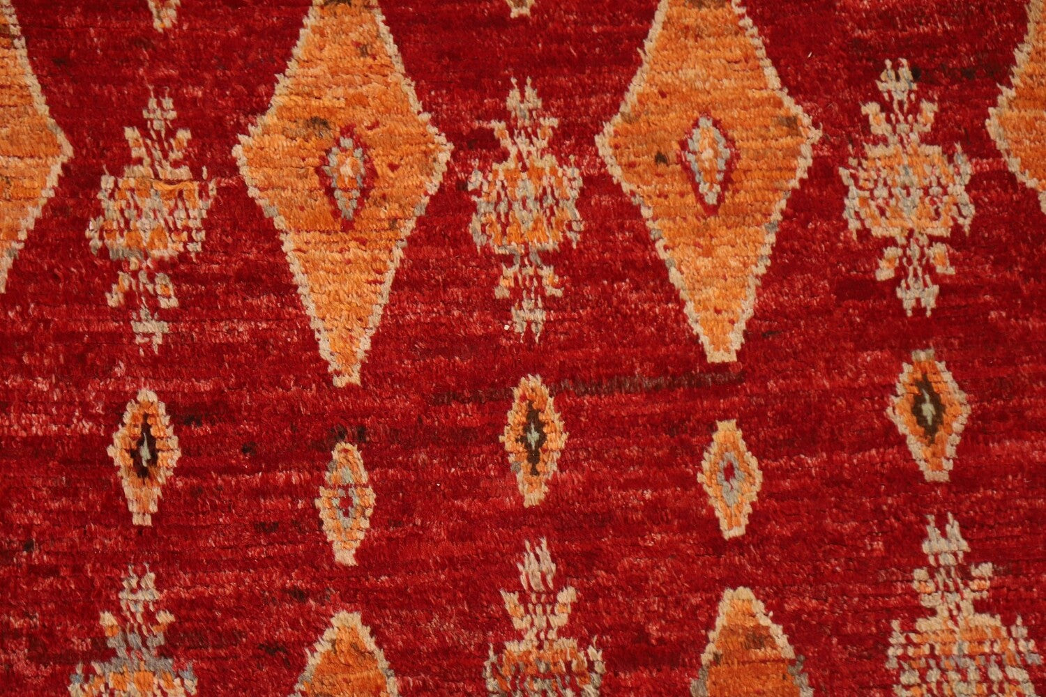 A Beautiful Genuine Pakistan Moroccan rug is Hand Knotted by skillful weavers in Pakistan with 100% Wool Material. This rug is in condition. dimensions are 9' 11'' X 6' 10'' in foot and 302 X 208 in centimeter. the primary color is Red.