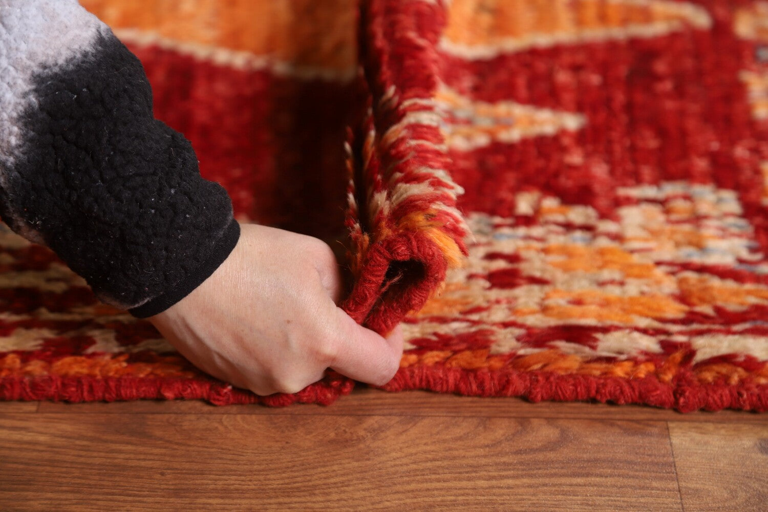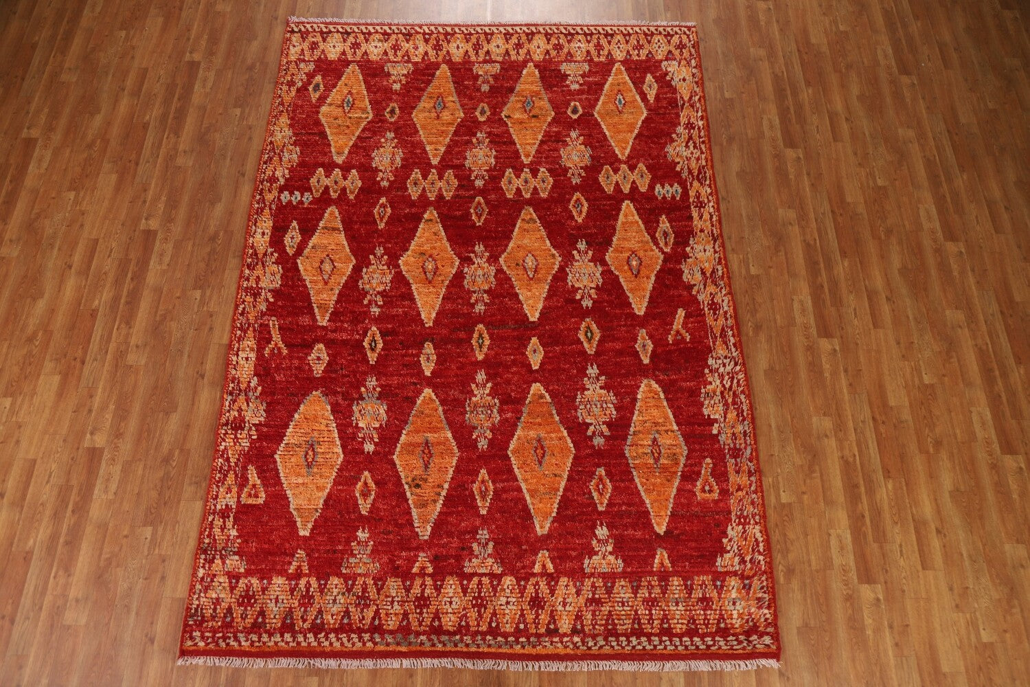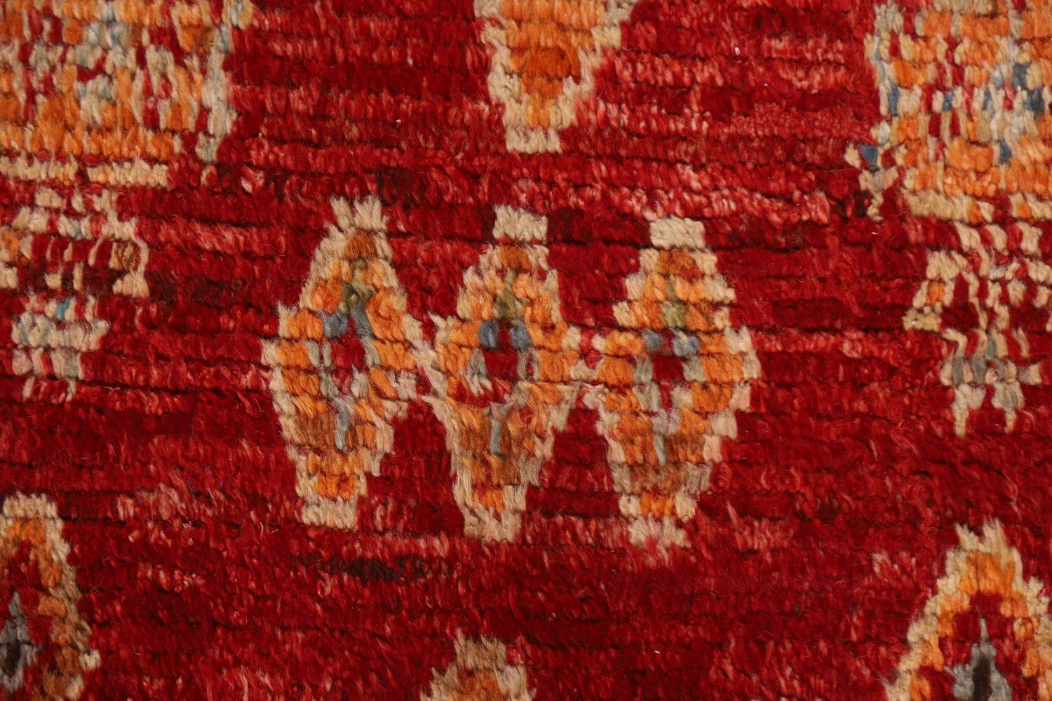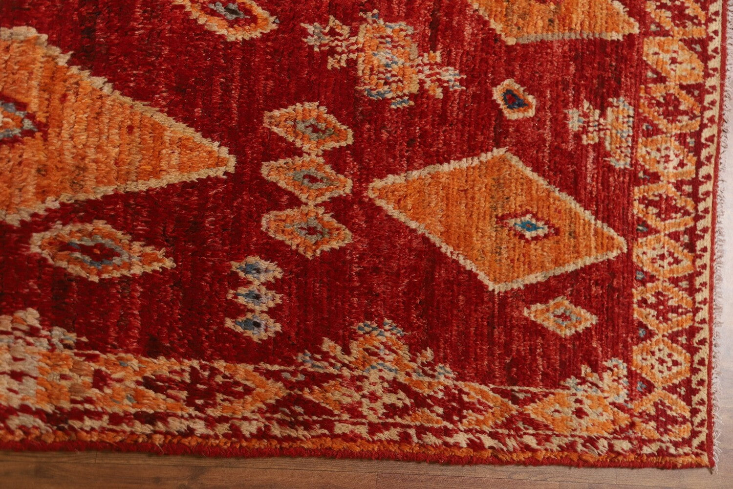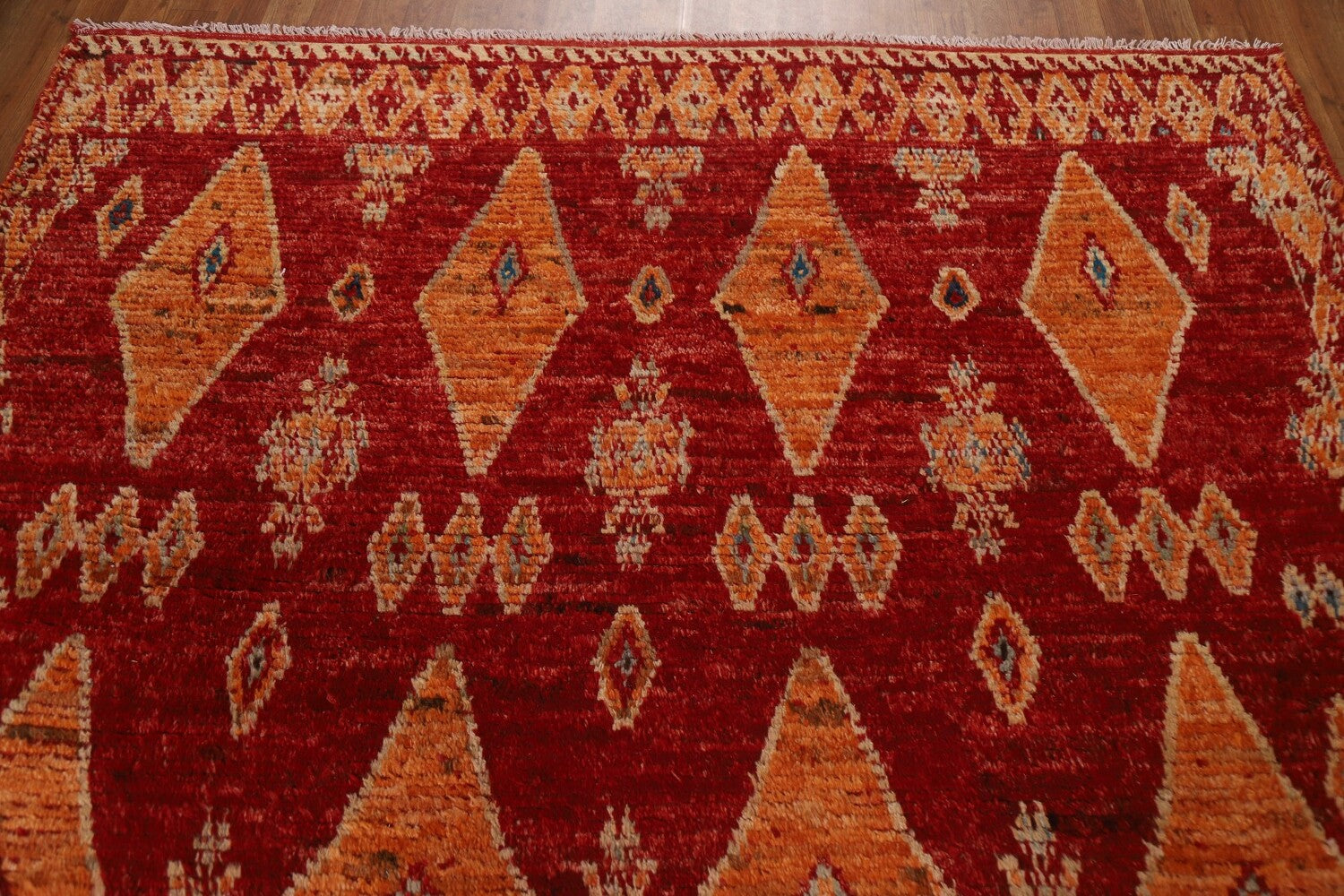 A Beautiful Genuine Pakistan Moroccan rug is Hand Knotted by skillful weavers in Pakistan with 100% Wool Material. This rug is in condition. dimensions are 9' 11'' X 6' 10'' in foot and 302 X 208 in centimeter. the primary color is Red.