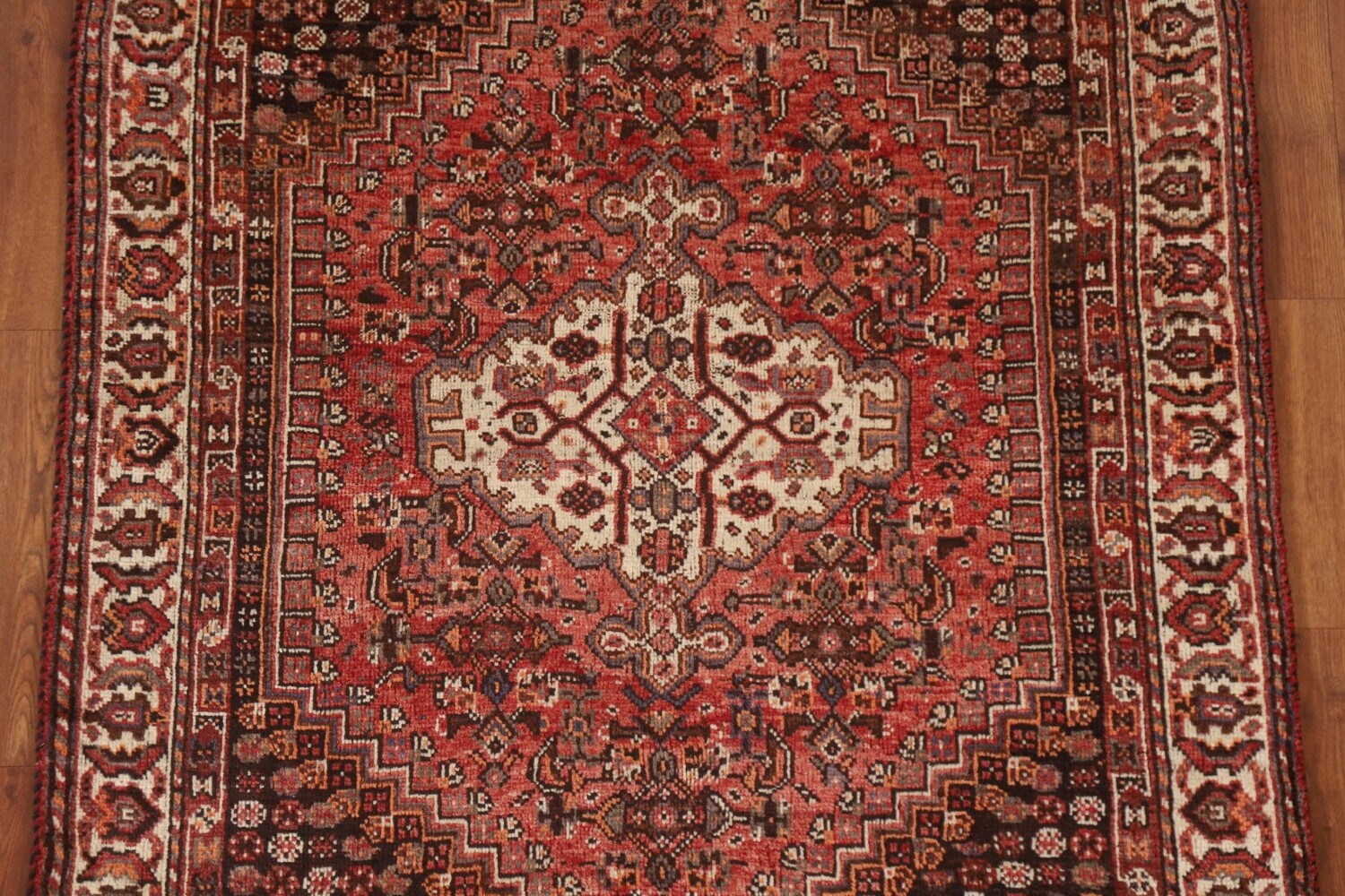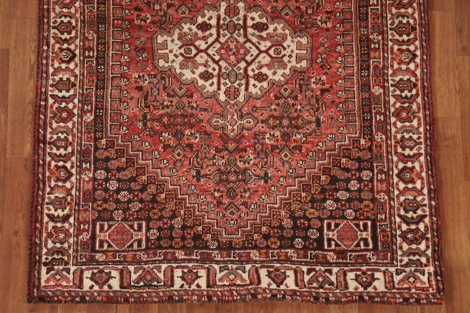 A Beautiful Genuine Persia ( Persia ) Shiraz rug is Hand Knotted by skillful weavers in Persia ( Persia ) with 100% Wool Material. This rug is in Very Good condition. dimensions are 5' 3'' X 3' 11'' in foot and 160 X 119 in centimeter. the primary color is Red.
