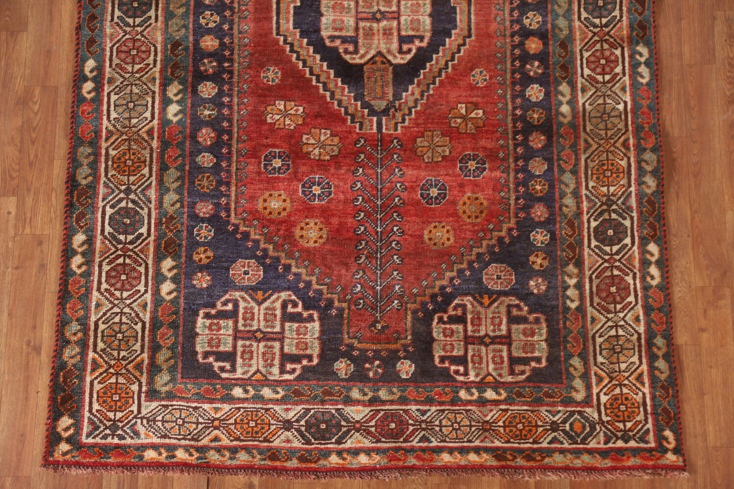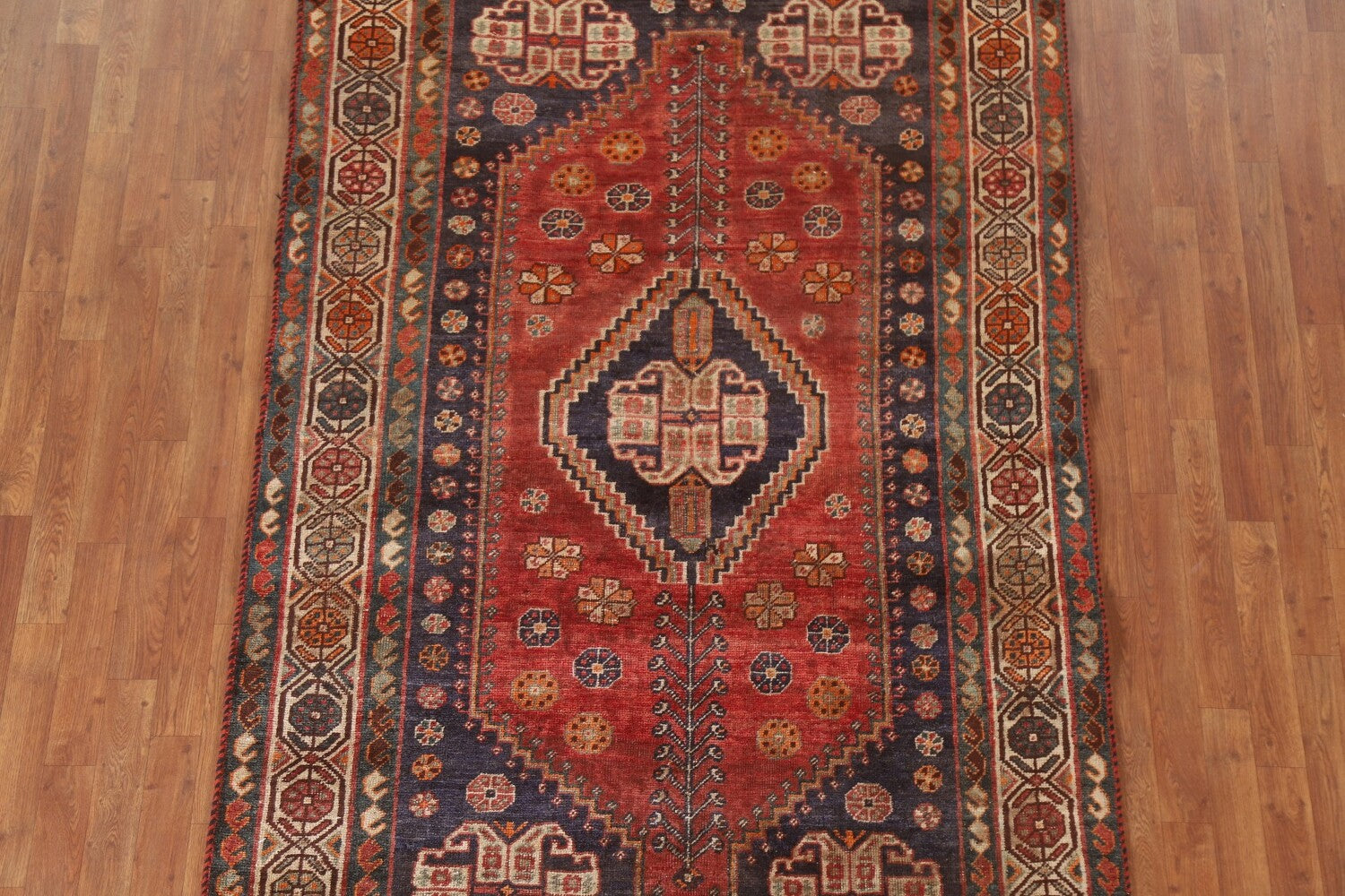A Beautiful Genuine Persia ( Persia ) Shiraz rug is Hand Knotted by skillful weavers in Persia ( Persia ) with 100% Wool Material. This rug is in Very Good (Evenly Low Pile) condition. dimensions are 7' 8'' X 4' 11'' in foot and 234 X 150 in centimeter. the primary color is Red.