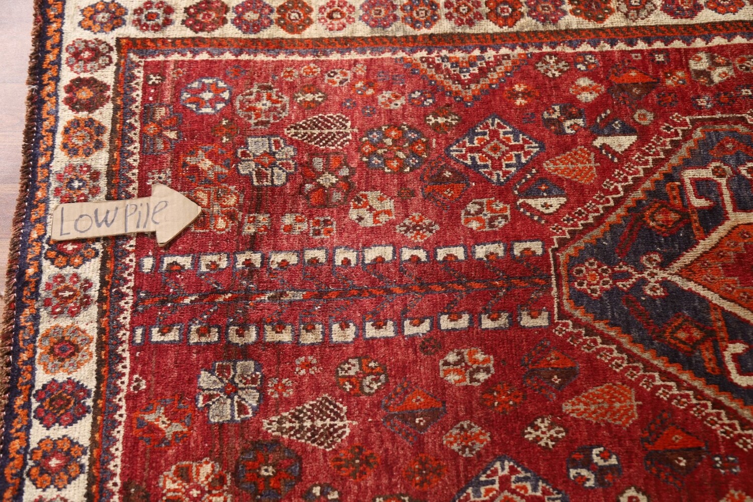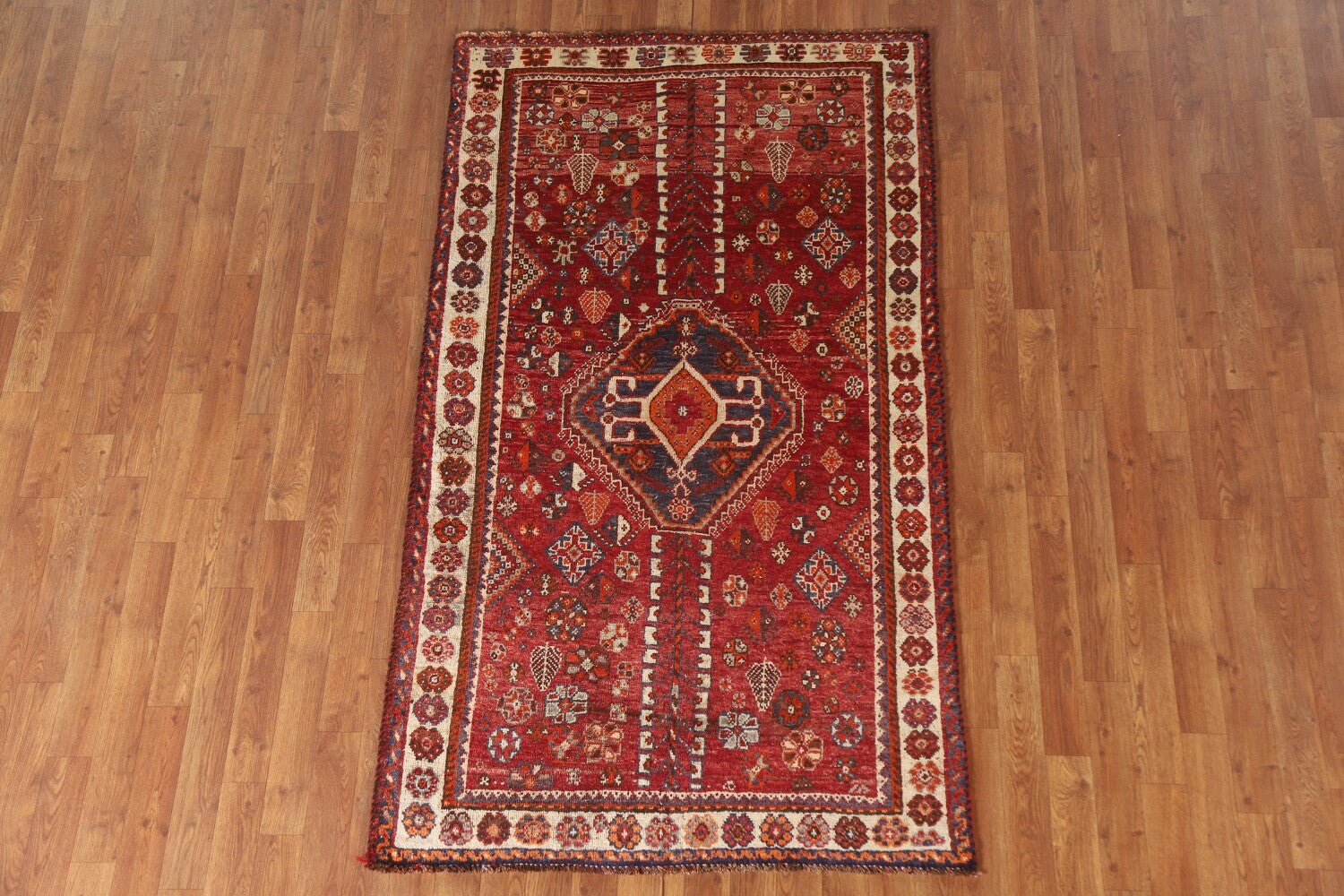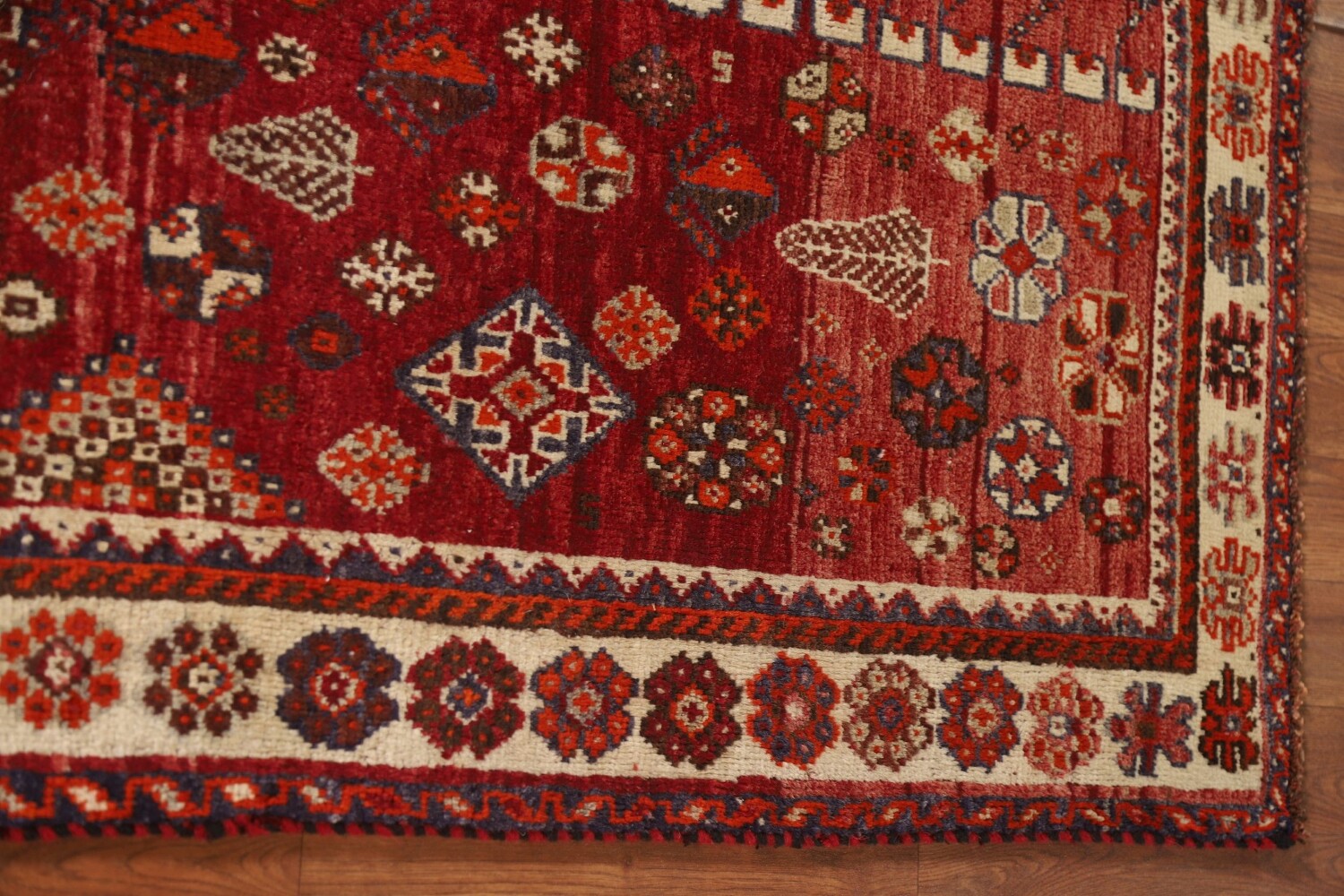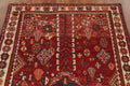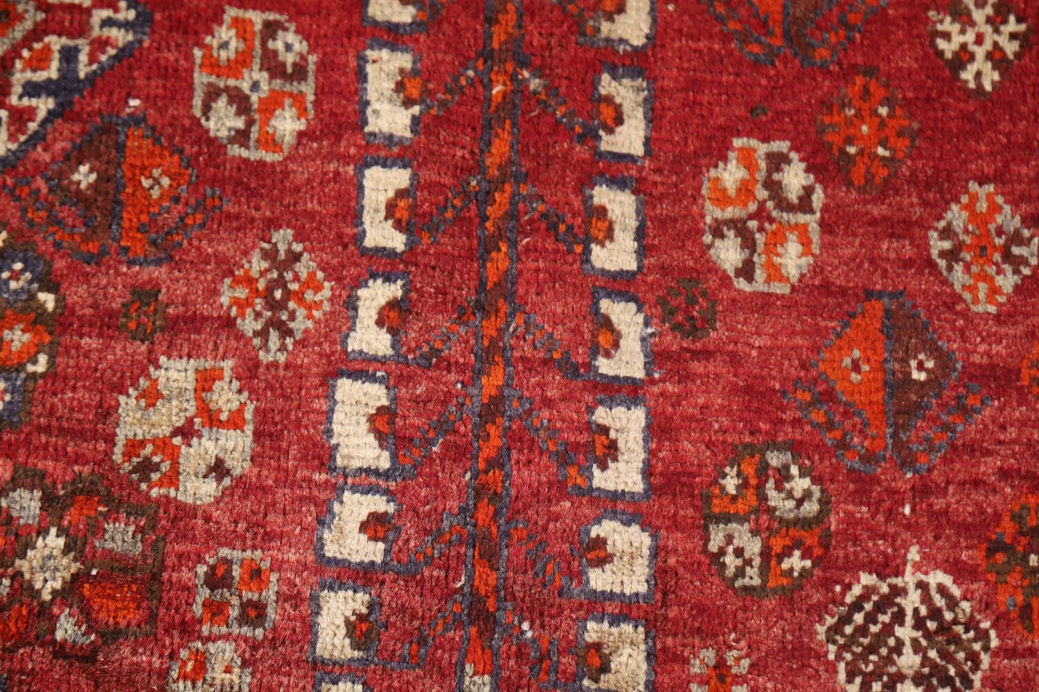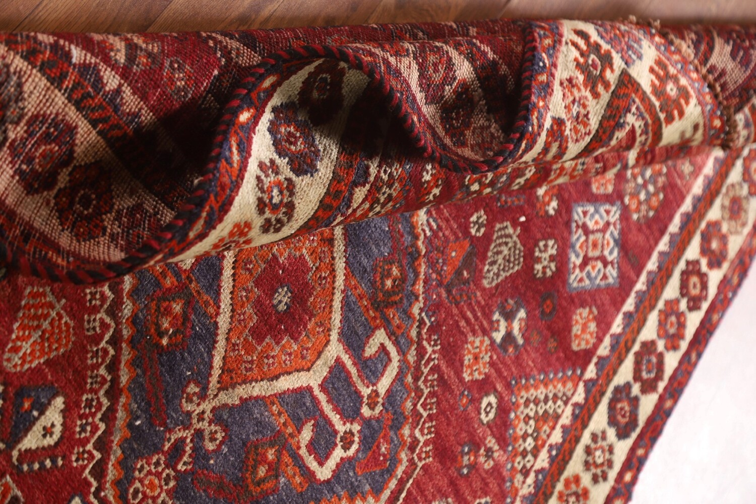 A Beautiful Genuine Persia ( Persia ) Shiraz rug is Hand Knotted by skillful weavers in Persia ( Persia ) with 100% Wool Material. This rug is in Very Good (Abrash-Low Pile) condition. dimensions are 6' 6'' X 3' 7'' in foot and 198 X 109 in centimeter. the primary color is Red.