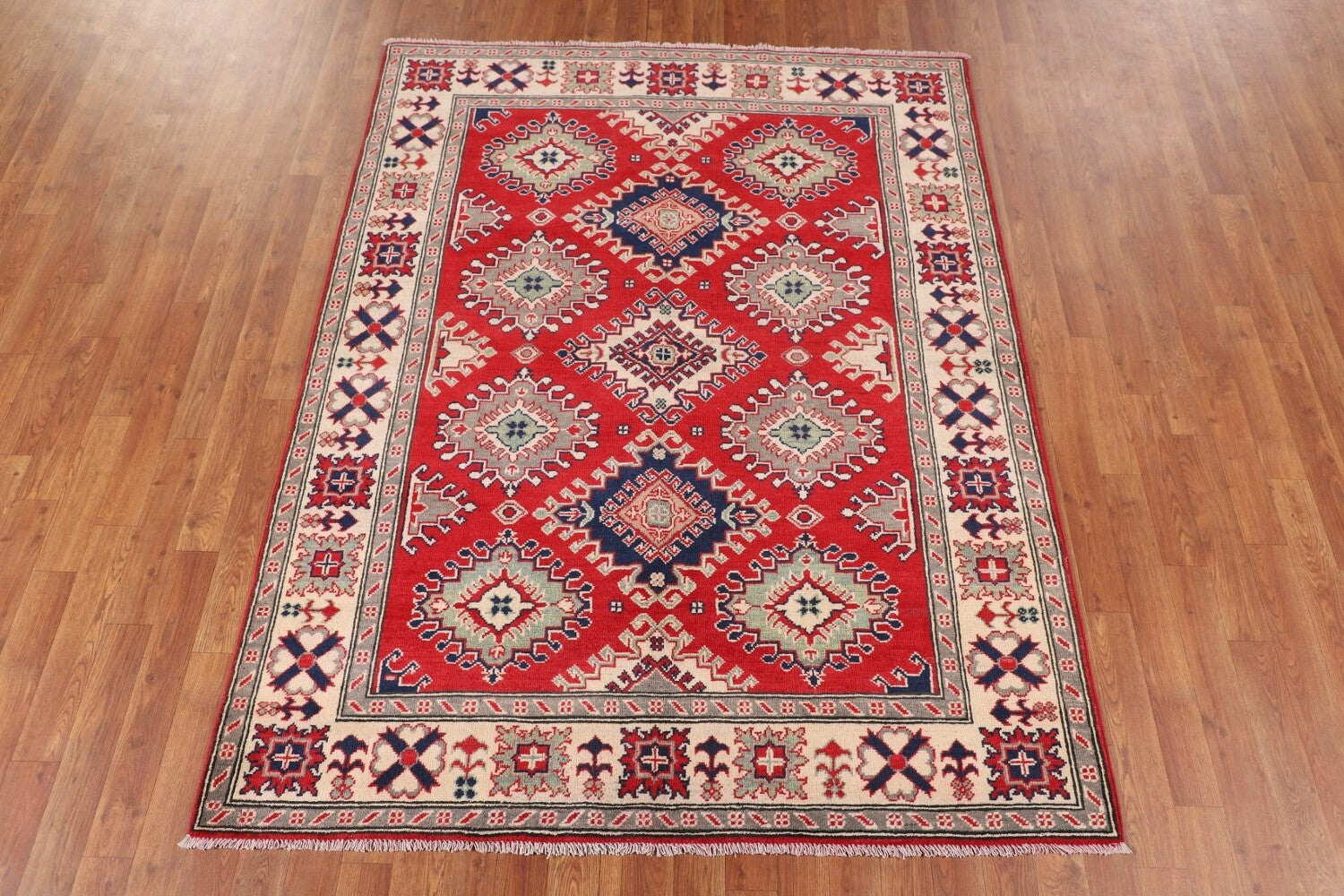 A Beautiful Genuine Pakistan Kazak rug is Hand Knotted by skillful weavers in Pakistan with 100% Wool Material. This rug is in New, First Quality condition. dimensions are 6' 7'' X 5' 0'' in foot and 201 X 152 in centimeter. the primary color is Red.