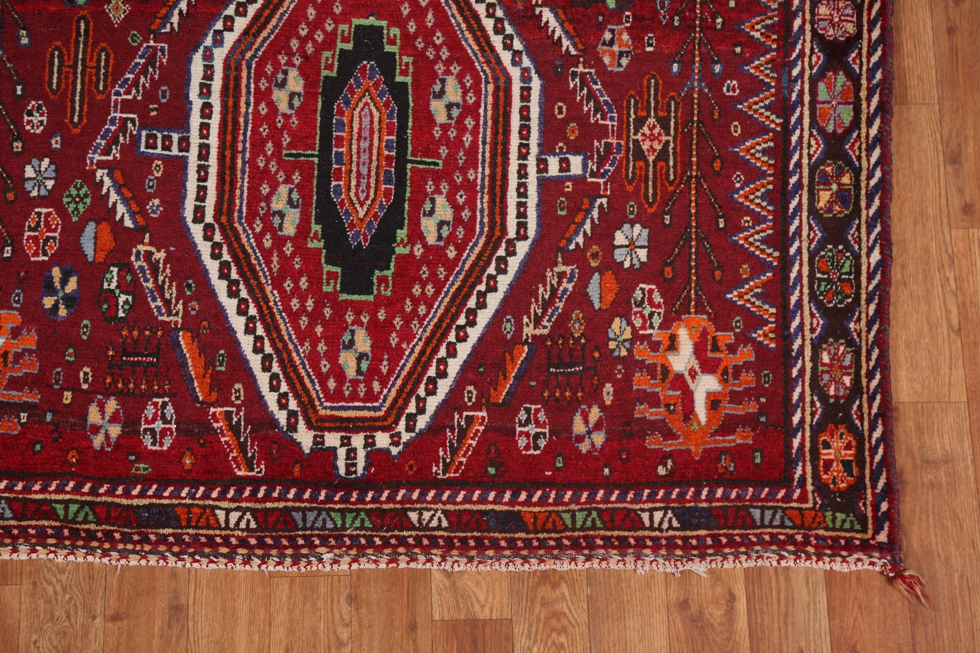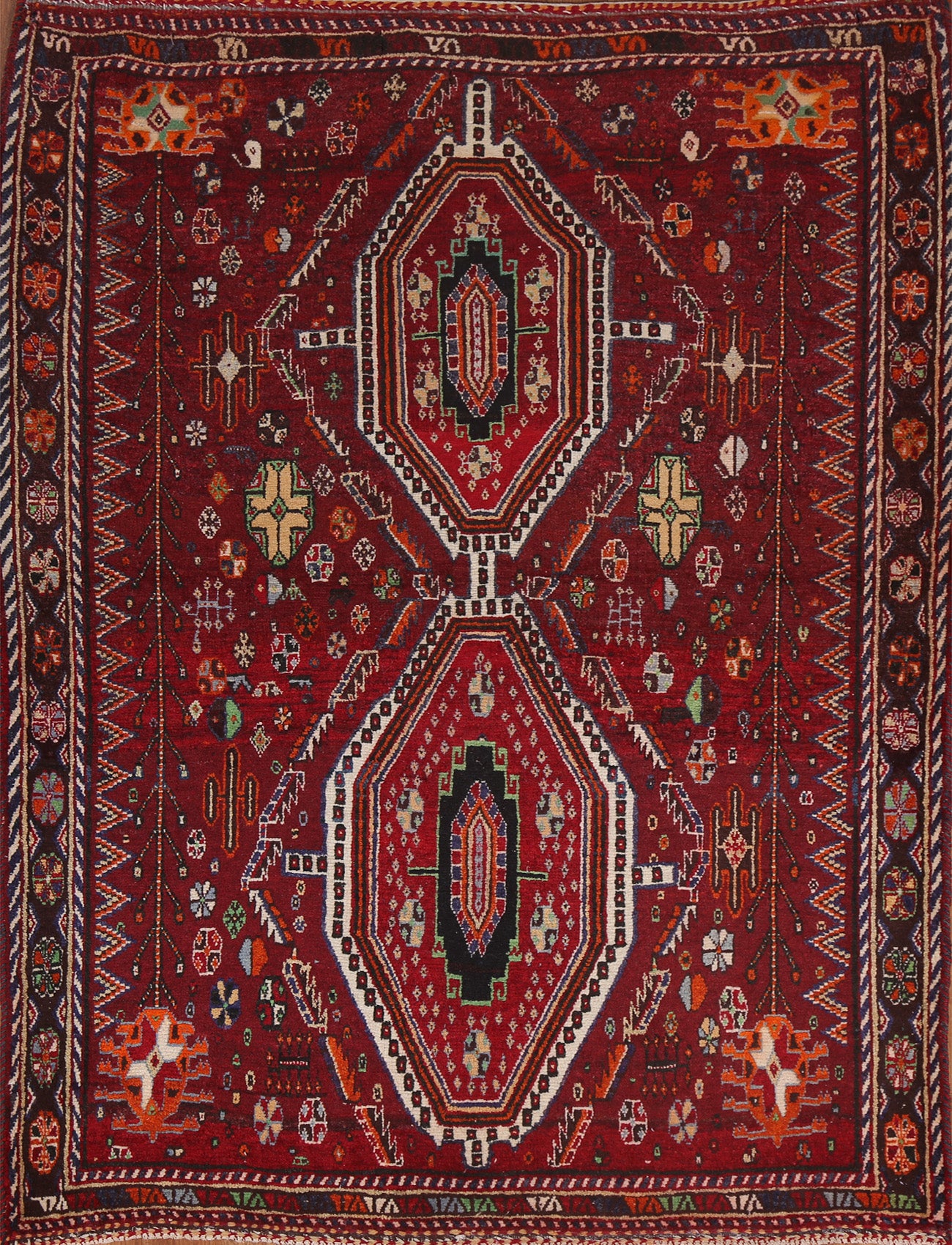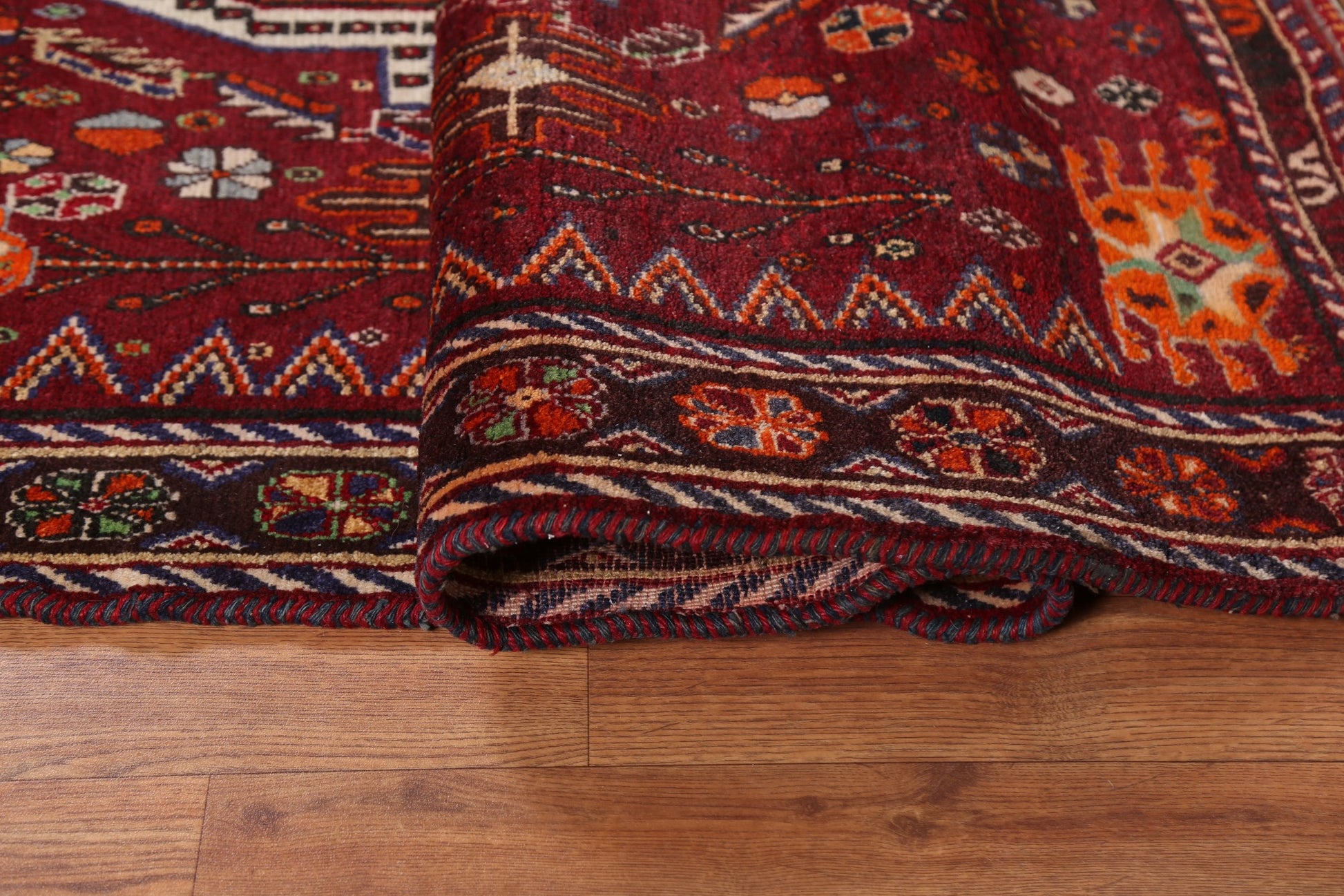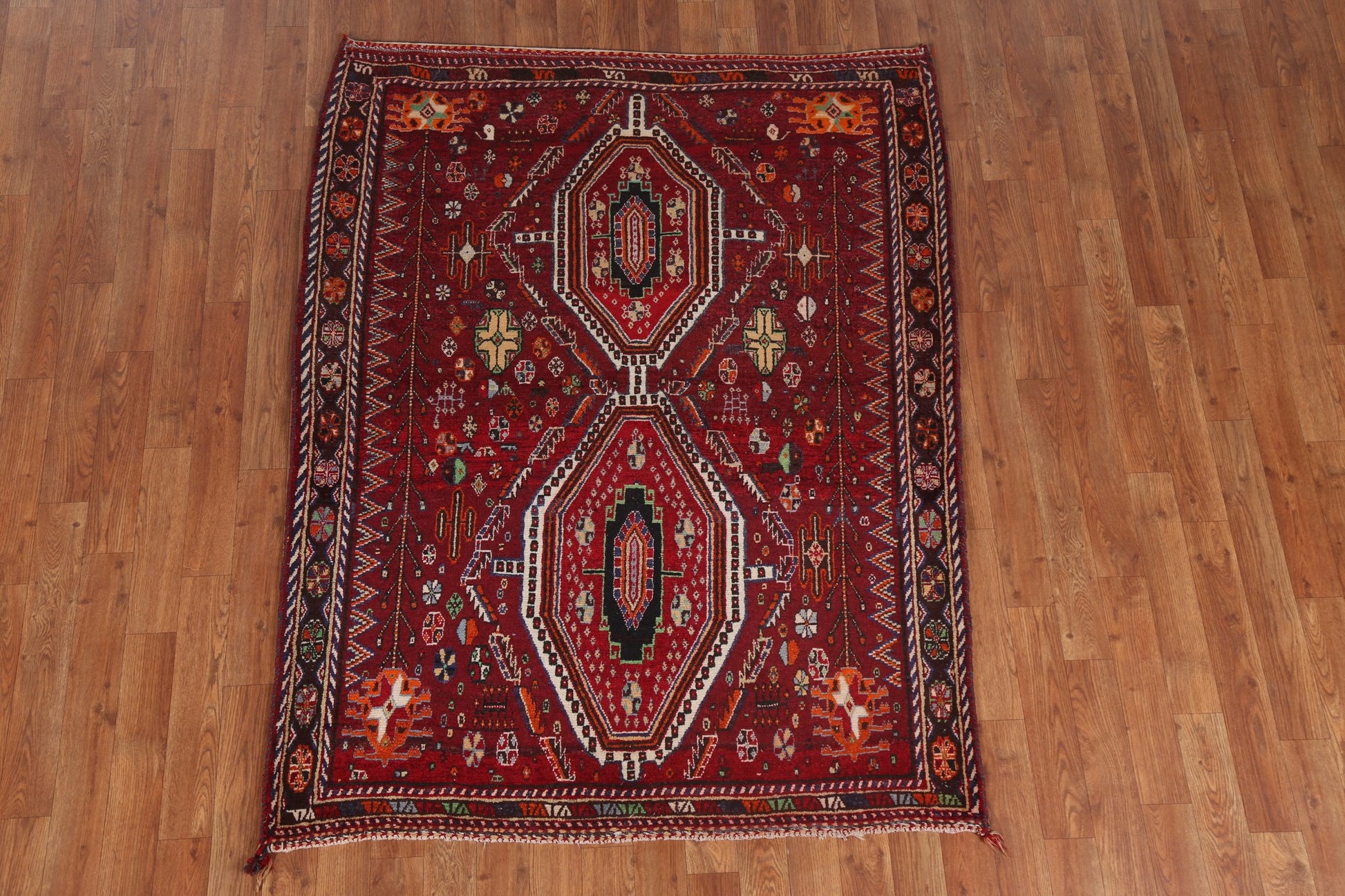 A Beautiful Genuine Persia ( Persia ) Shiraz (Kashkoli) rug is Hand Knotted by skillful weavers in Persia ( Persia ) with 100% Wool Material. This rug is in Very Good (Small Missing Pile) condition. dimensions are 5' 3'' X 4' 0'' in foot and 160 X 122 in centimeter. the primary color is Red.