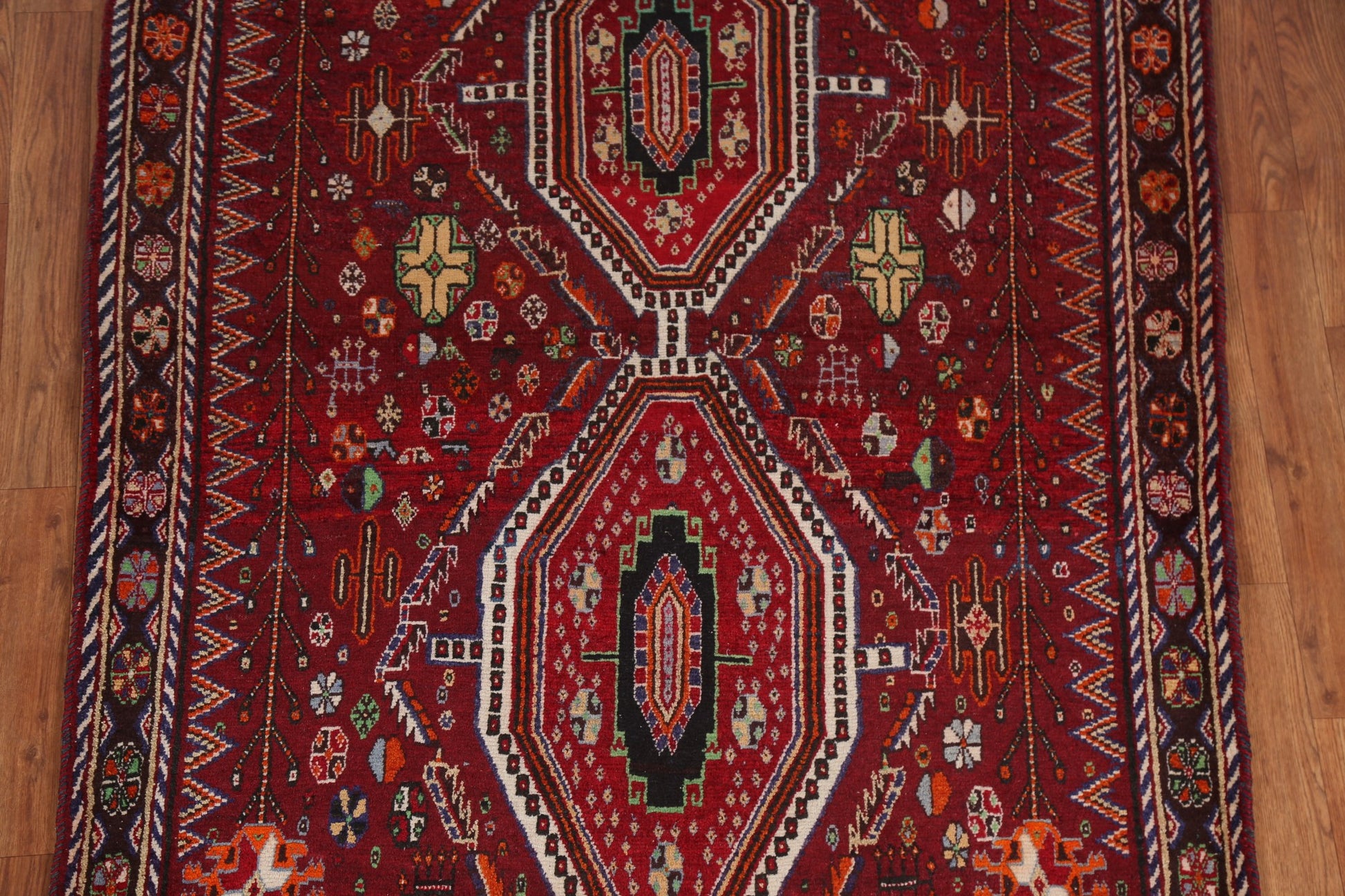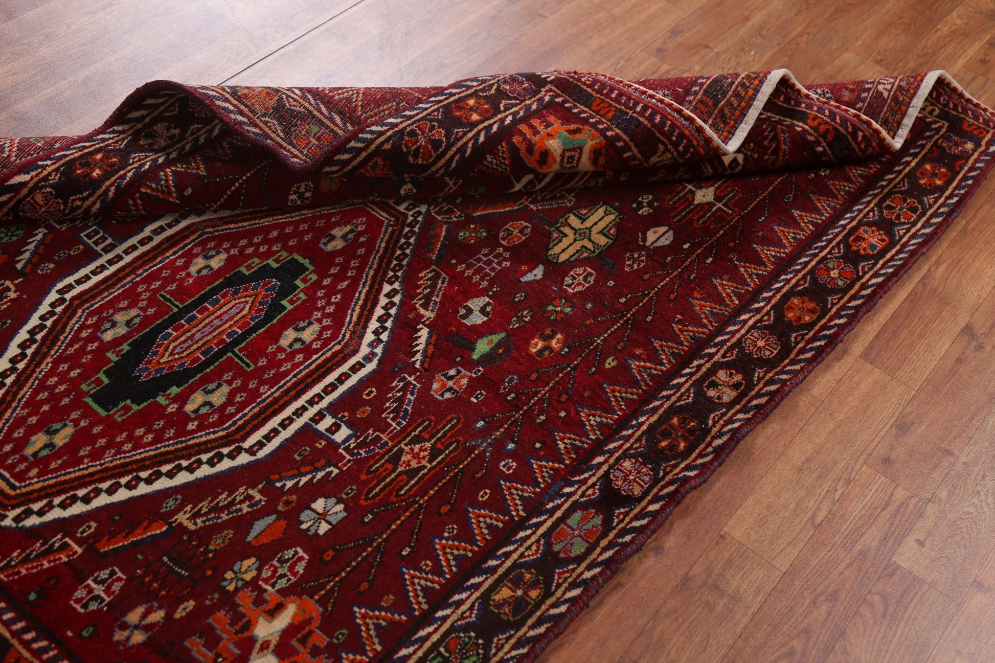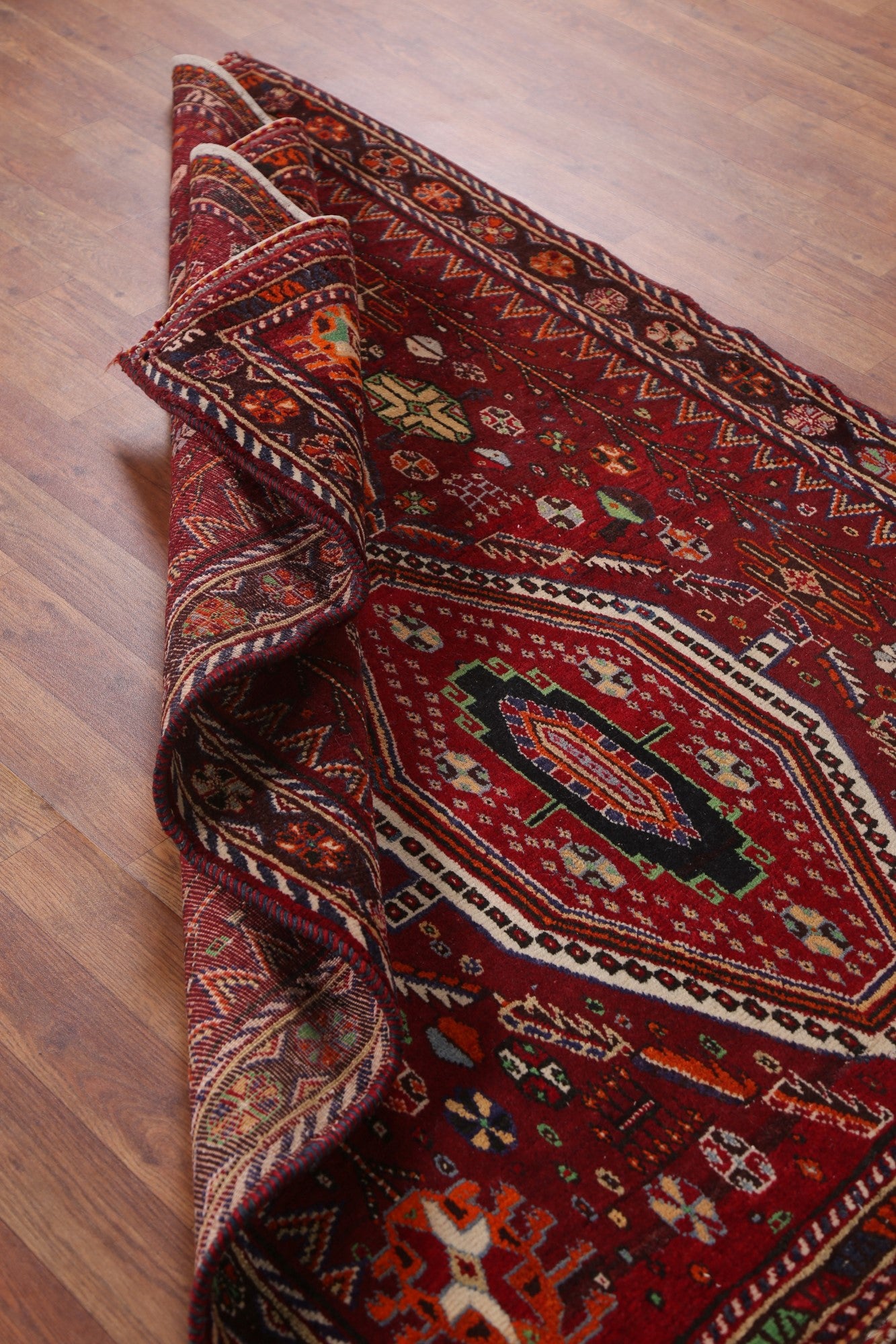 A Beautiful Genuine Persia ( Persia ) Shiraz (Kashkoli) rug is Hand Knotted by skillful weavers in Persia ( Persia ) with 100% Wool Material. This rug is in Very Good (Small Missing Pile) condition. dimensions are 5' 3'' X 4' 0'' in foot and 160 X 122 in centimeter. the primary color is Red.