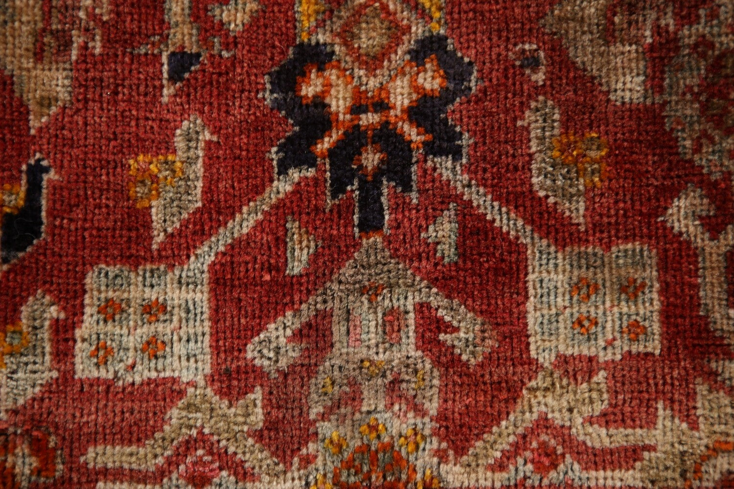 A Beautiful Genuine Persia ( Persia ) Shiraz rug is Hand Knotted by skillful weavers in Persia ( Persia ) with 100% Wool Material. This rug is in Very Good(Evenly Low Pile) condition. dimensions are 8' 3'' X 4' 10'' in foot and 251 X 147 in centimeter. the primary color is Red.