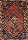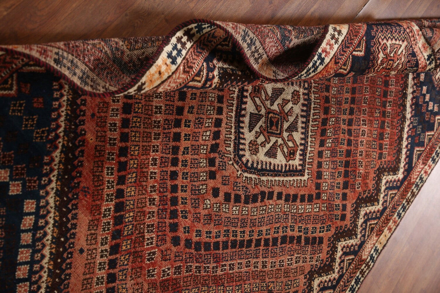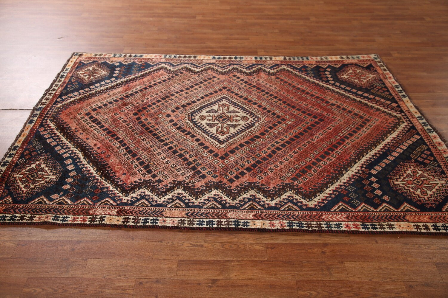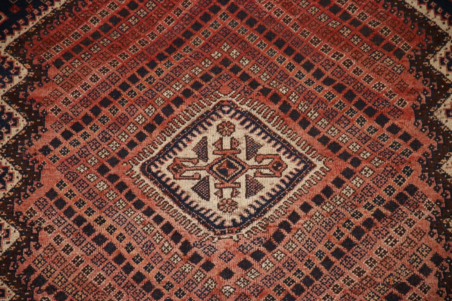 A Beautiful Genuine Persia ( Persia ) Shiraz rug is Hand Knotted by skillful weavers in Persia ( Persia ) with 100% Wool Material. This rug is in Very Good ( Low Pile ) condition. dimensions are 7' 5'' X 5' 2'' in foot and 226 X 157 in centimeter. the primary color is Red.