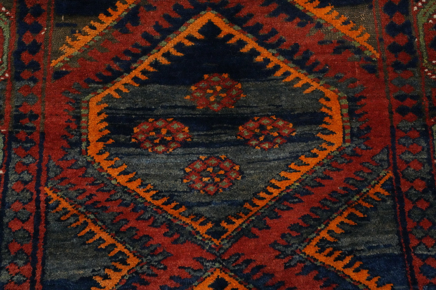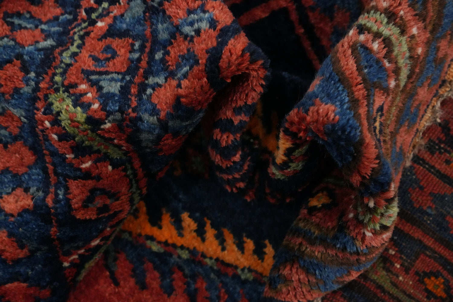 A Beautiful Genuine Persia ( Persia ) Sirjan rug is Hand Knotted by skillful weavers in Persia ( Persia ) with 100% Wool Material. This rug is in Very Good (Low Pile-Abrash) condition. dimensions are 7' 2'' X 3' 11'' in foot and 218 X 119 in centimeter. the primary color is Navy Blue & Blues.