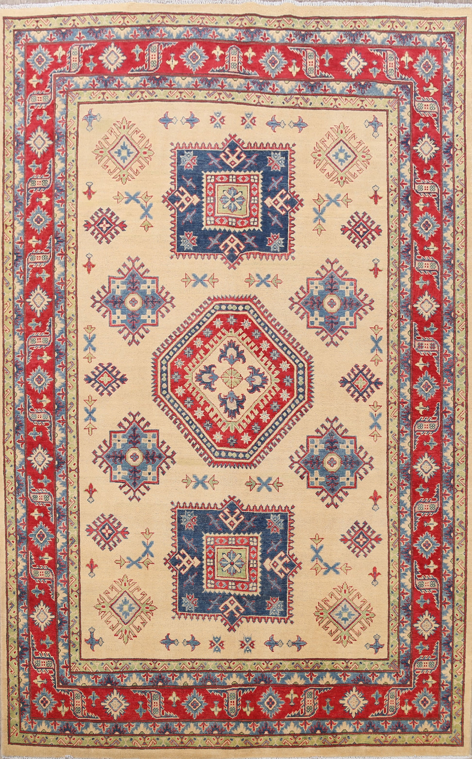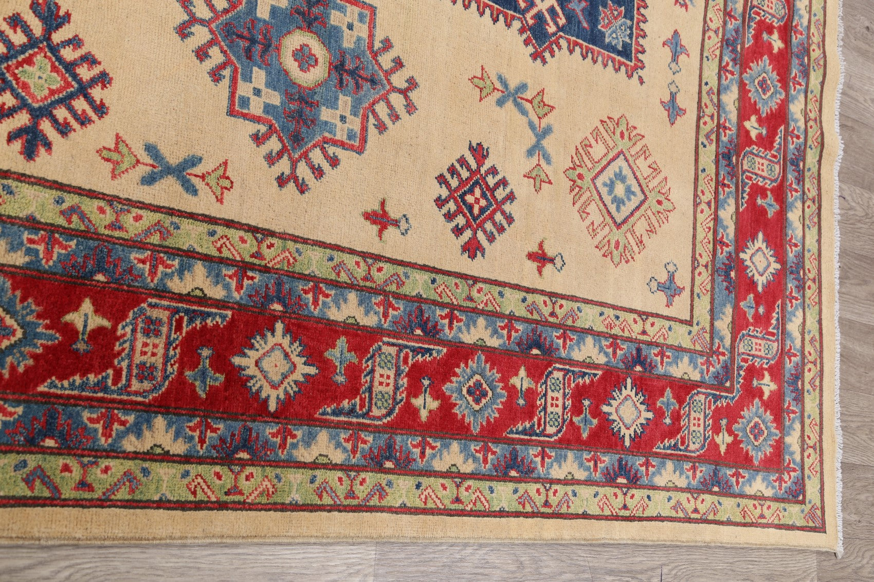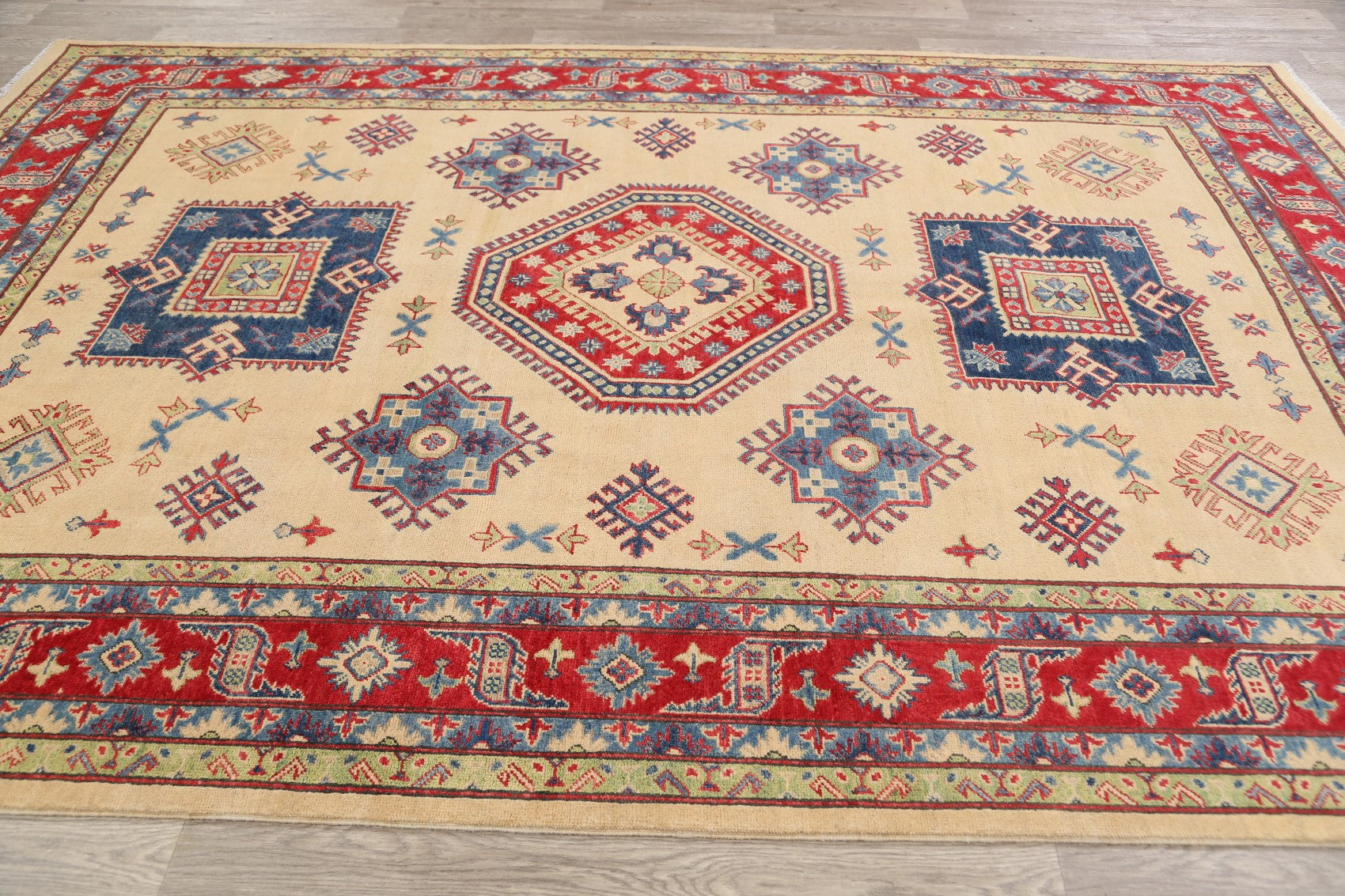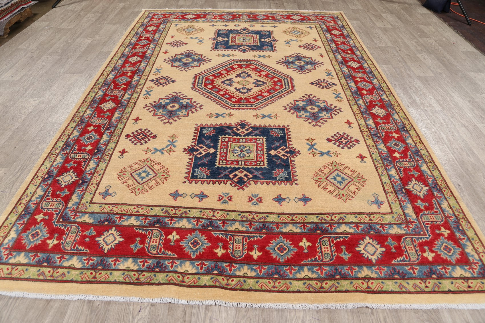 A Beautiful Genuine Pakistan Kazak rug is Hand Knotted by skillful weavers in Pakistan with 100% Wool Material. This rug is in New, First Quality condition. dimensions are 10' 2'' X 6' 9'' in foot and 310 X 206 in centimeter. the primary color is Beige & Ivories.