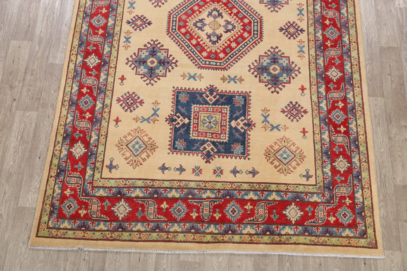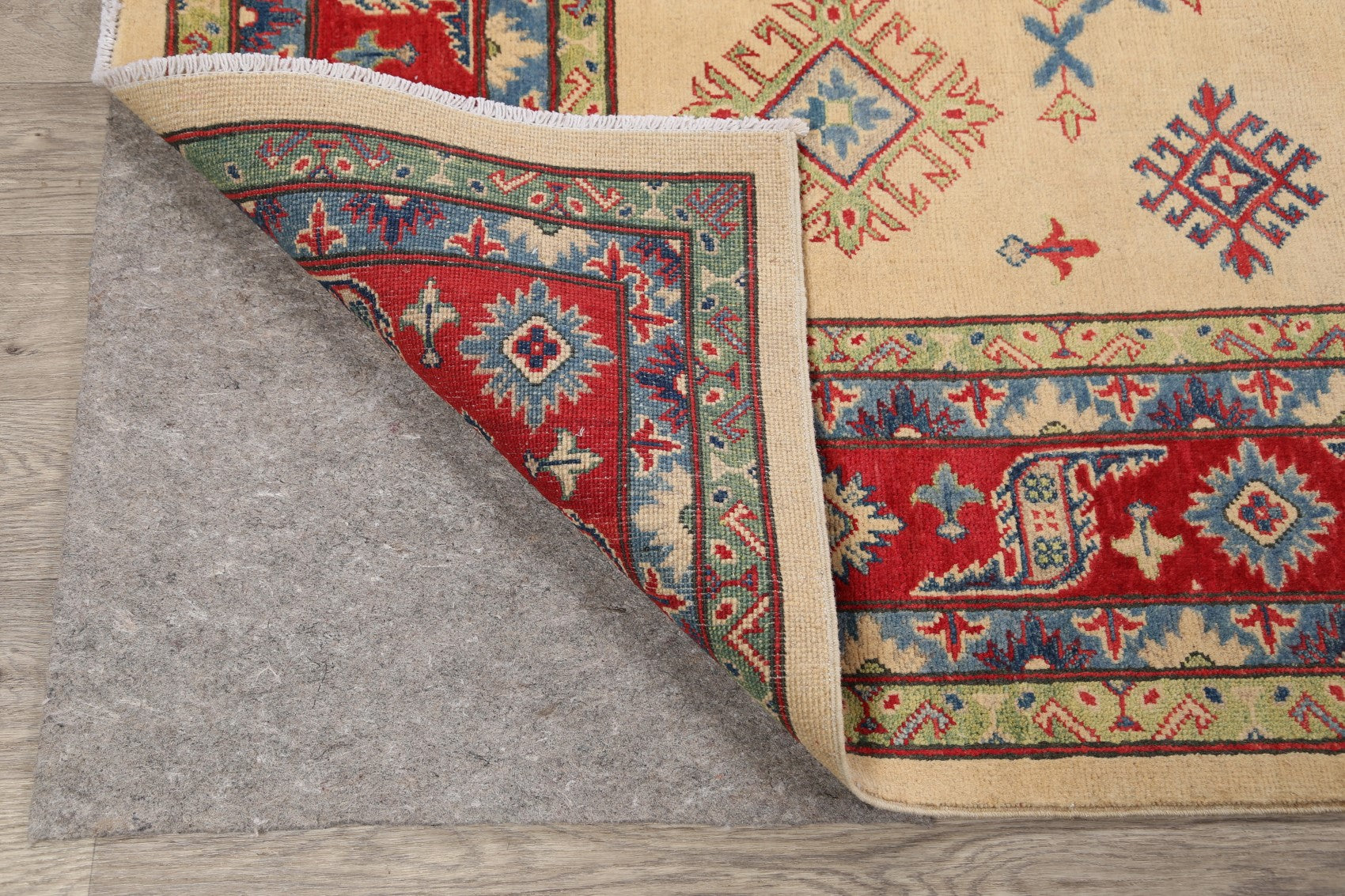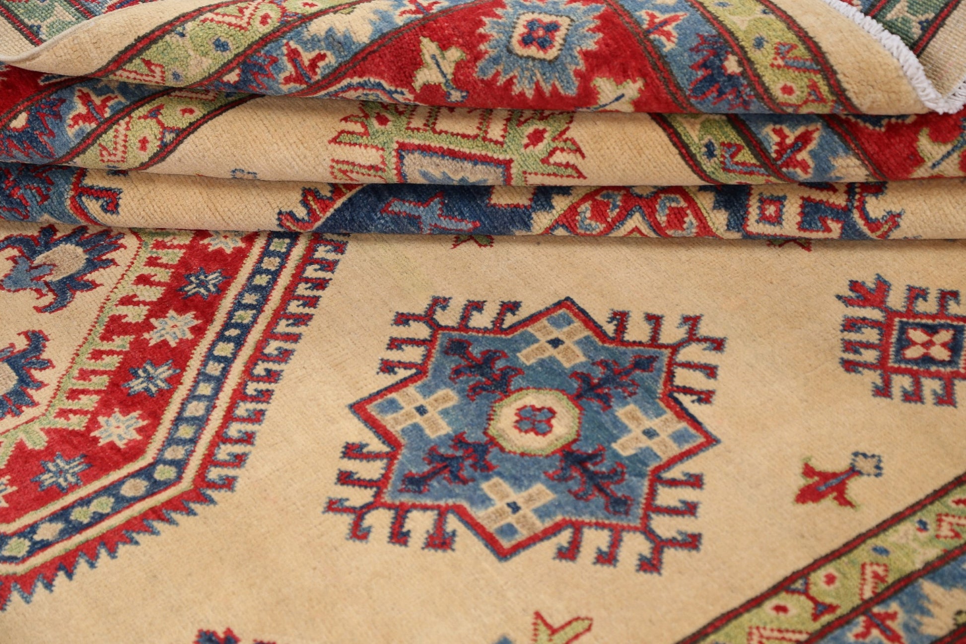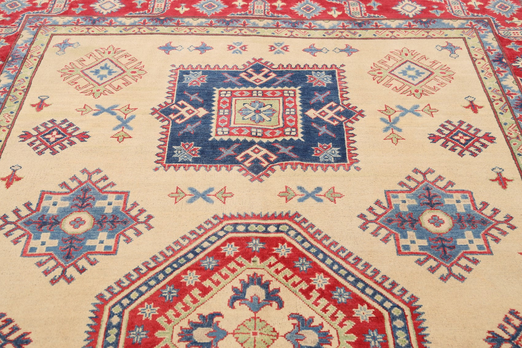 A Beautiful Genuine Pakistan Kazak rug is Hand Knotted by skillful weavers in Pakistan with 100% Wool Material. This rug is in New, First Quality condition. dimensions are 10' 2'' X 6' 9'' in foot and 310 X 206 in centimeter. the primary color is Beige & Ivories.