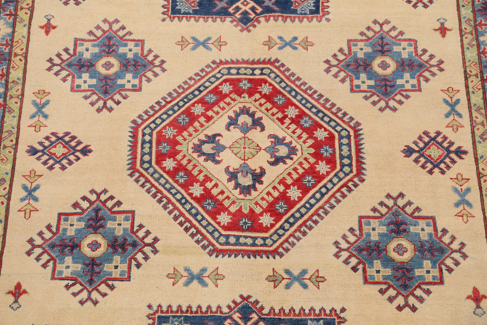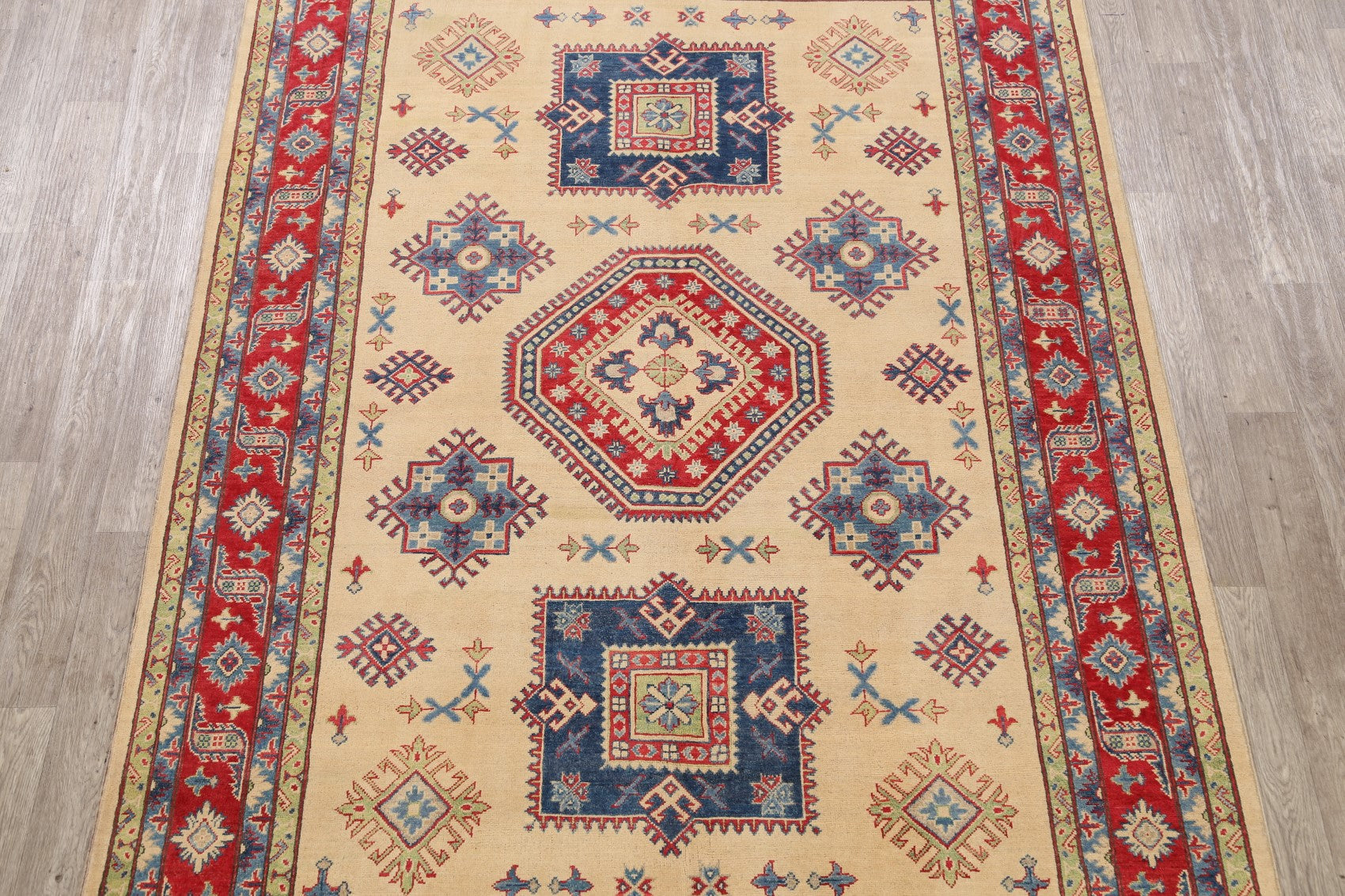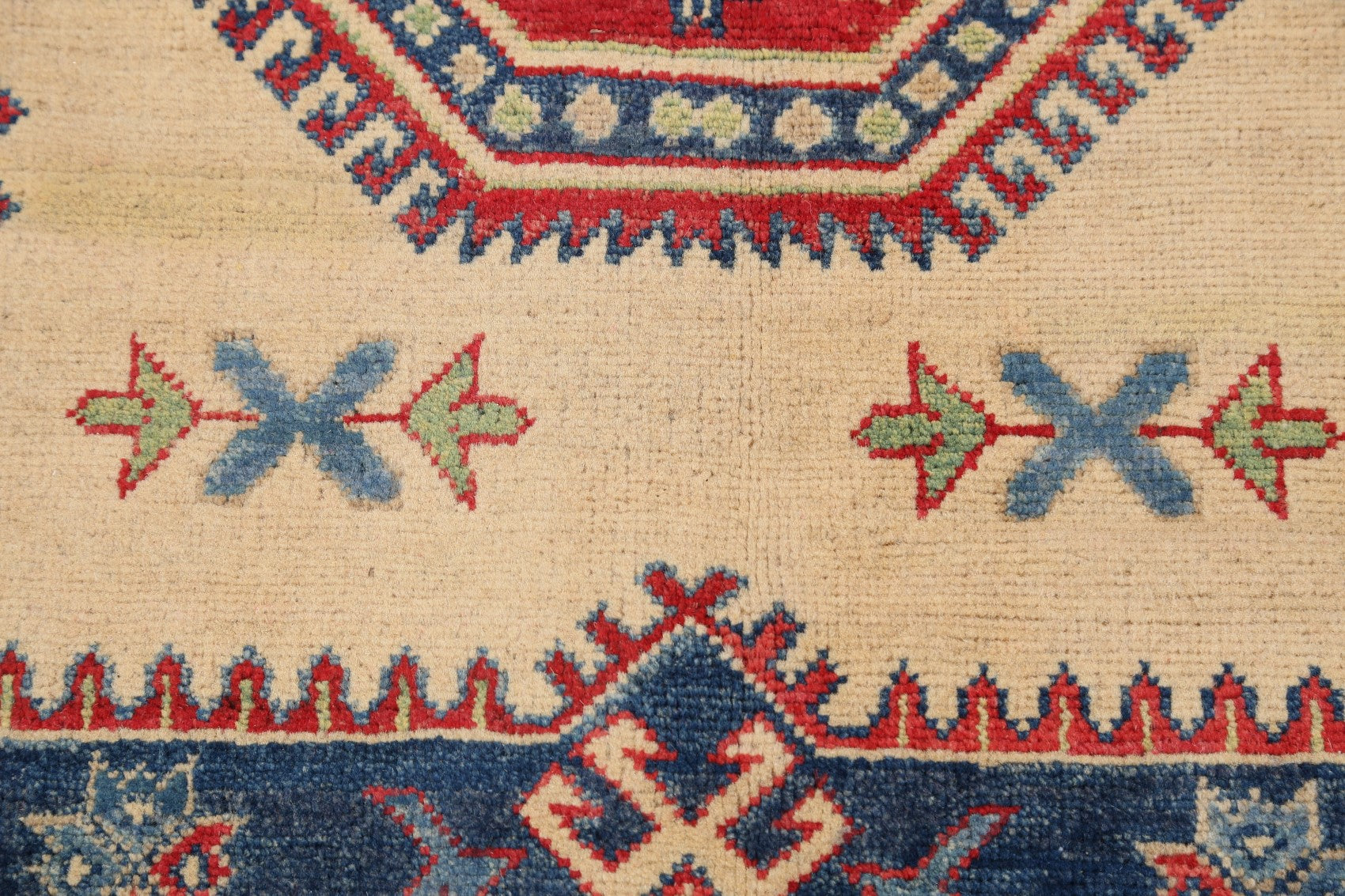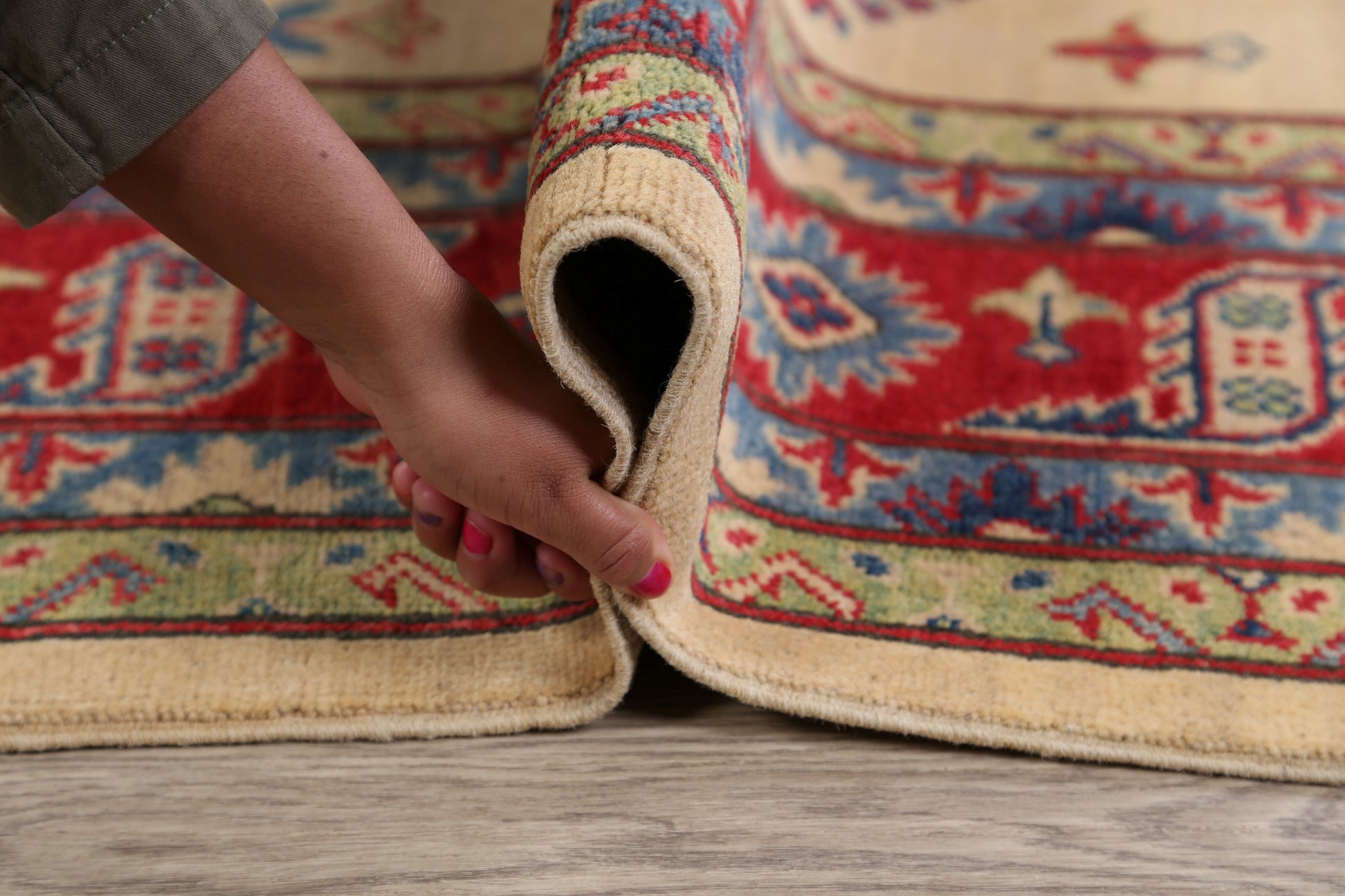 A Beautiful Genuine Pakistan Kazak rug is Hand Knotted by skillful weavers in Pakistan with 100% Wool Material. This rug is in New, First Quality condition. dimensions are 10' 2'' X 6' 9'' in foot and 310 X 206 in centimeter. the primary color is Beige & Ivories.