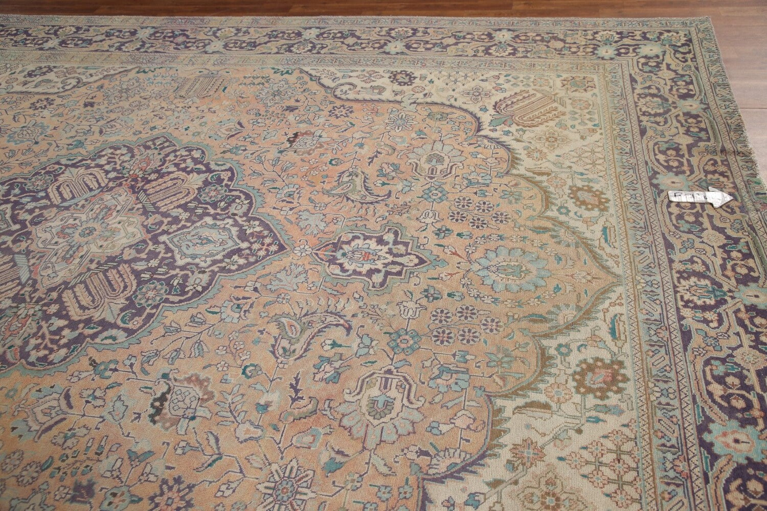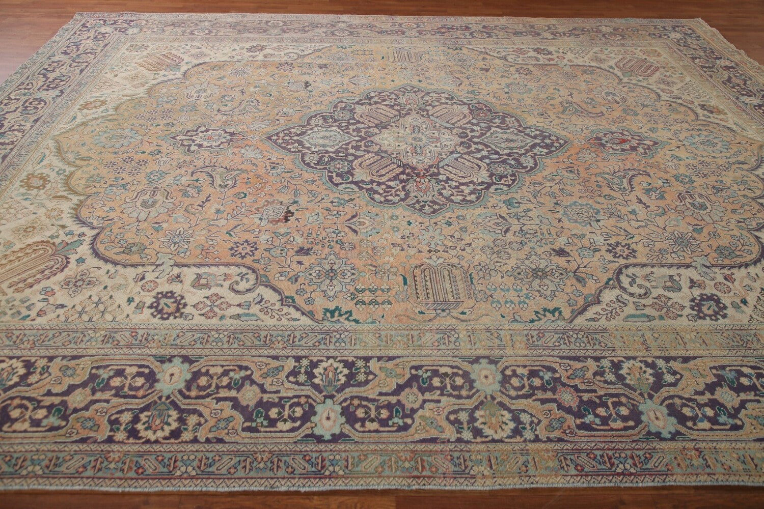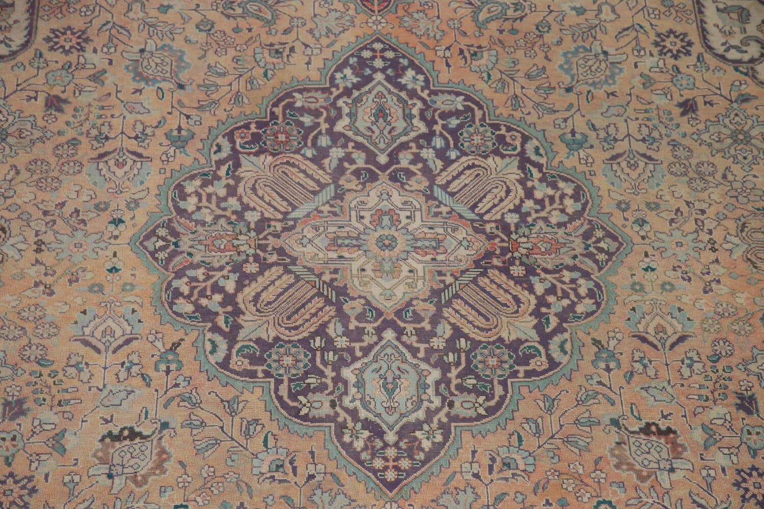 A Beautiful Genuine Persia ( Persia ) Tabriz rug is Hand Knotted by skillful weavers in Persia ( Persia ) with 100% Wool Material. This rug is in Very Good (Evenly Low Pile-Repair) condition. dimensions are 12' 6'' X 9' 9'' in foot and 381 X 297 in centimeter. the primary color is Coral.