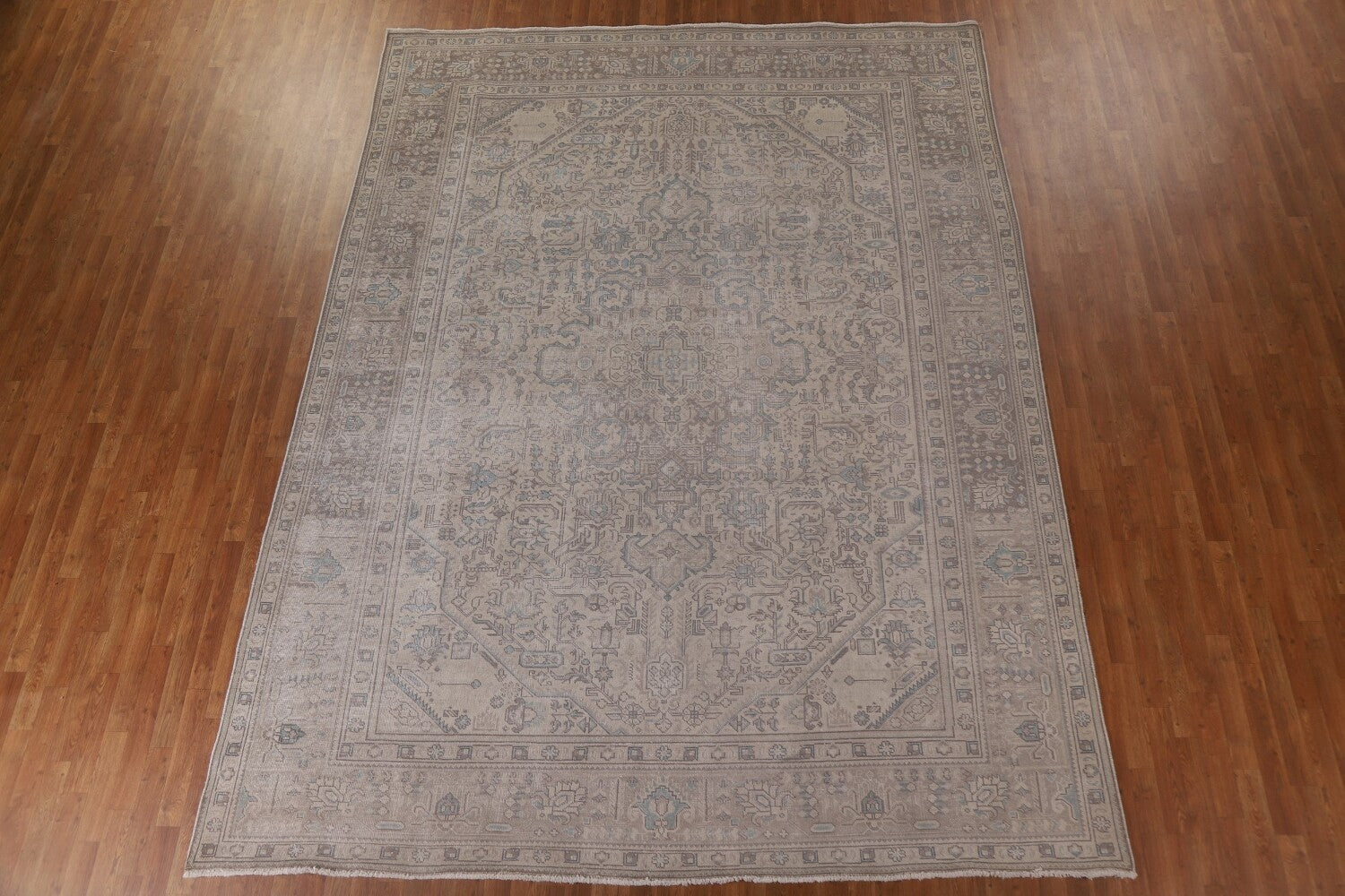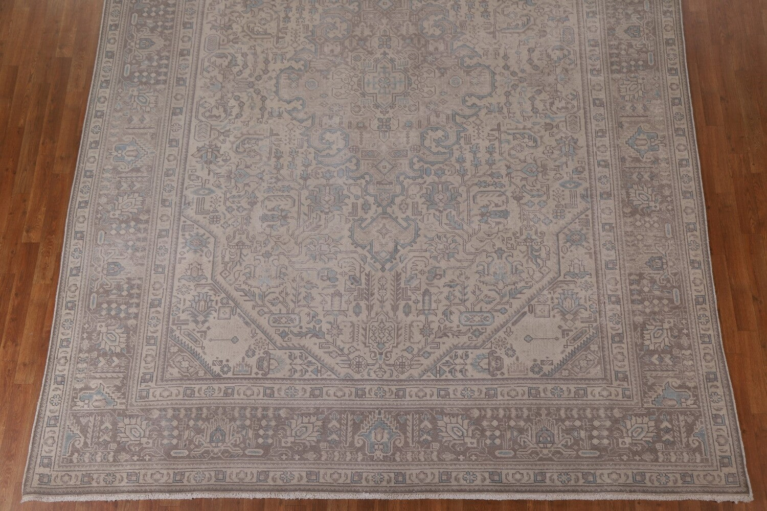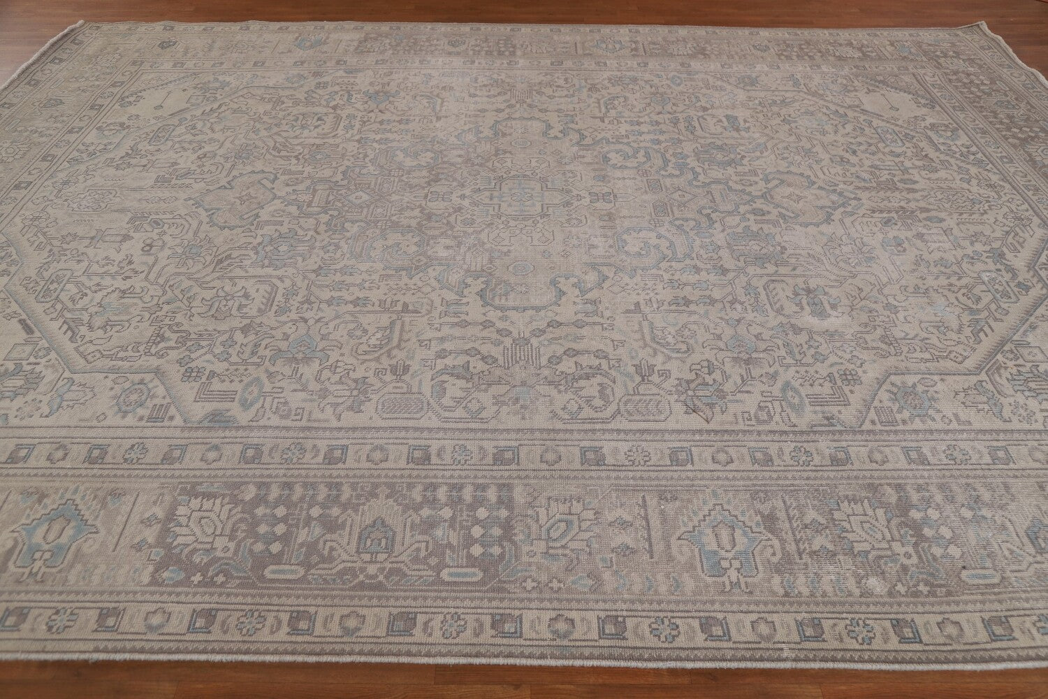 A Beautiful Genuine Persia ( Persia ) Tabriz rug is Hand Knotted by skillful weavers in Persia ( Persia ) with 100% Wool Material. This rug is in Very Good (Evenly Low Pile) condition. dimensions are 12' 8'' X 9' 6'' in foot and 386 X 290 in centimeter. the primary color is Beige & Ivories.