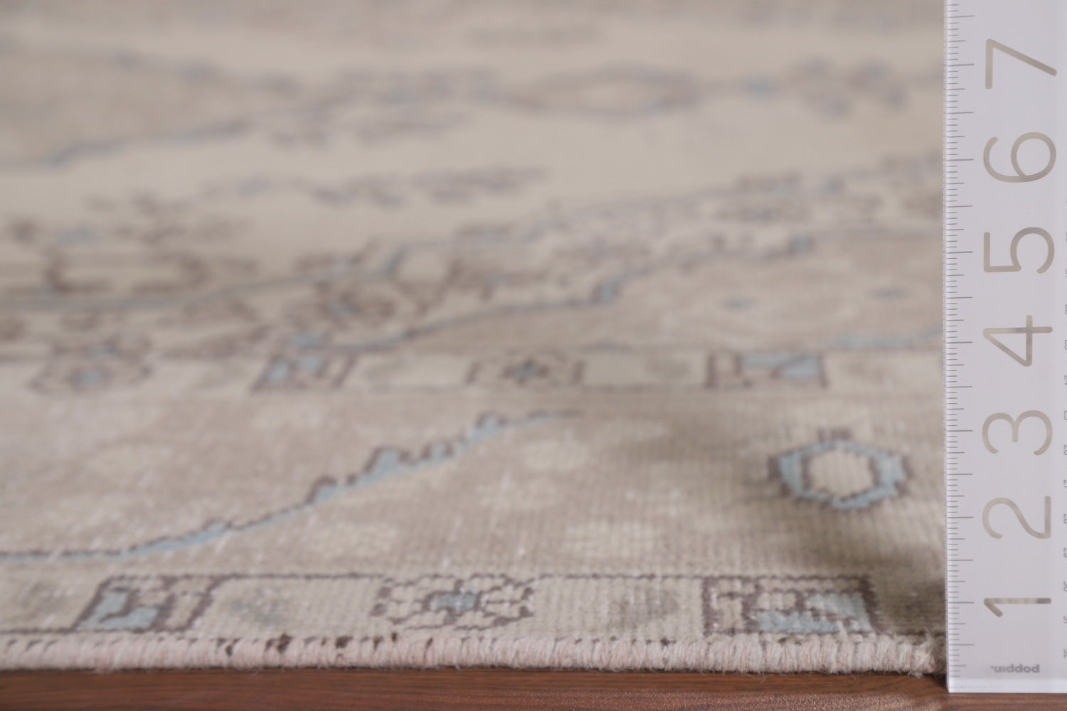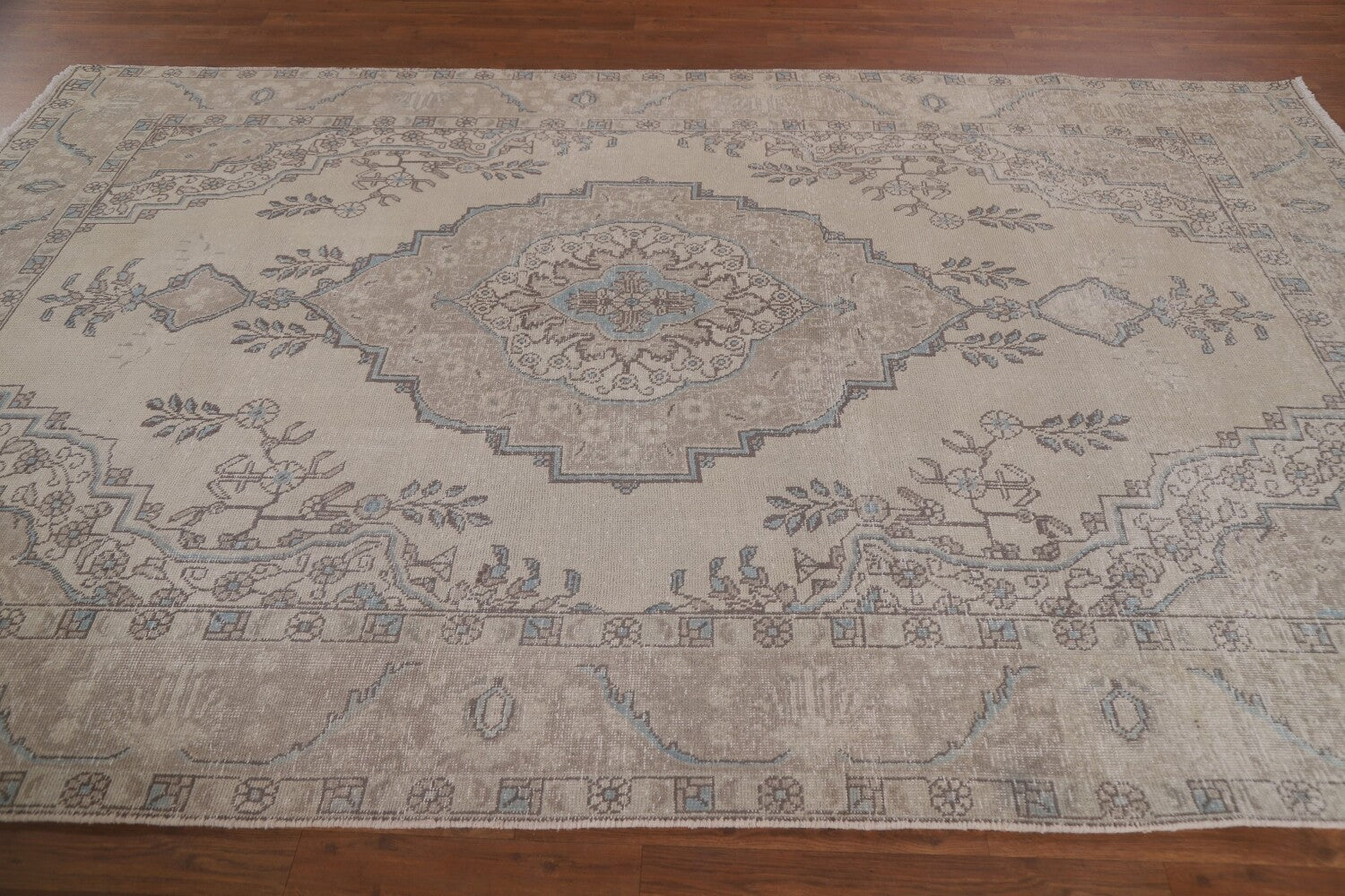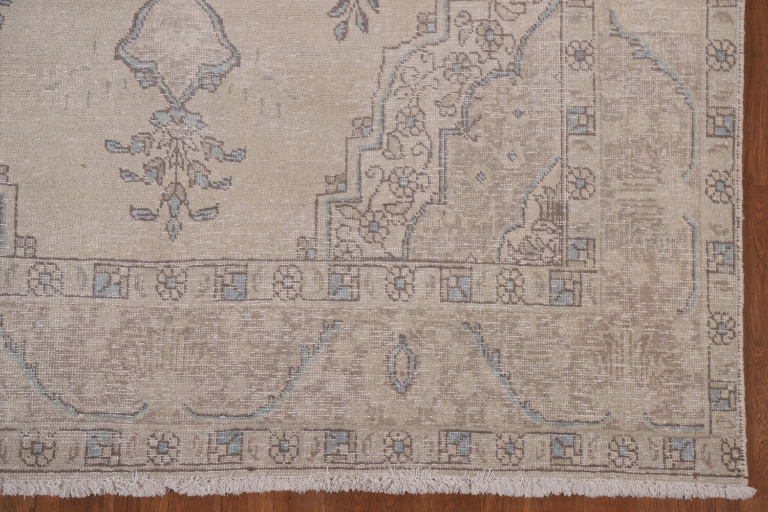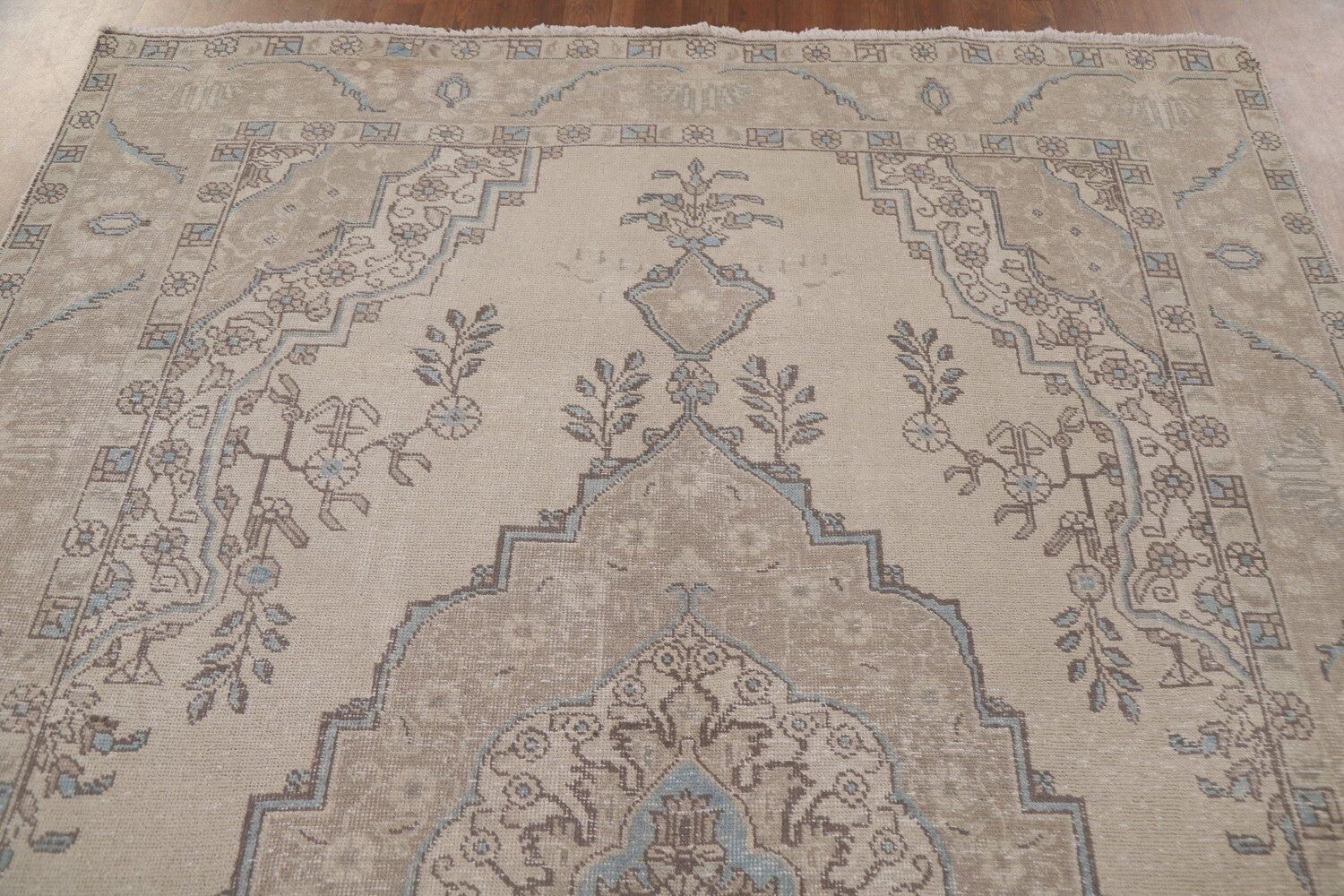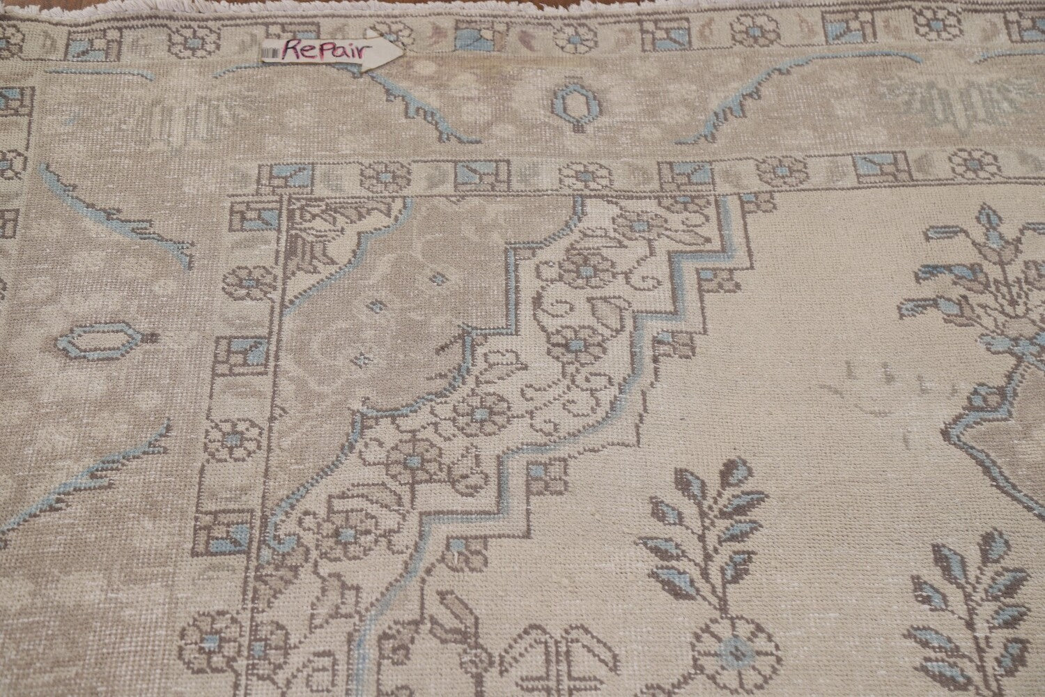 A Beautiful Genuine Persia ( Persia ) Tabriz rug is Hand Knotted by skillful weavers in Persia ( Persia ) with 100% Wool Material. This rug is in Very Good (Evenly Low Pile-Repair) condition. dimensions are 9' 10'' X 6' 5'' in foot and 300 X 196 in centimeter. the primary color is Beige & Ivories.