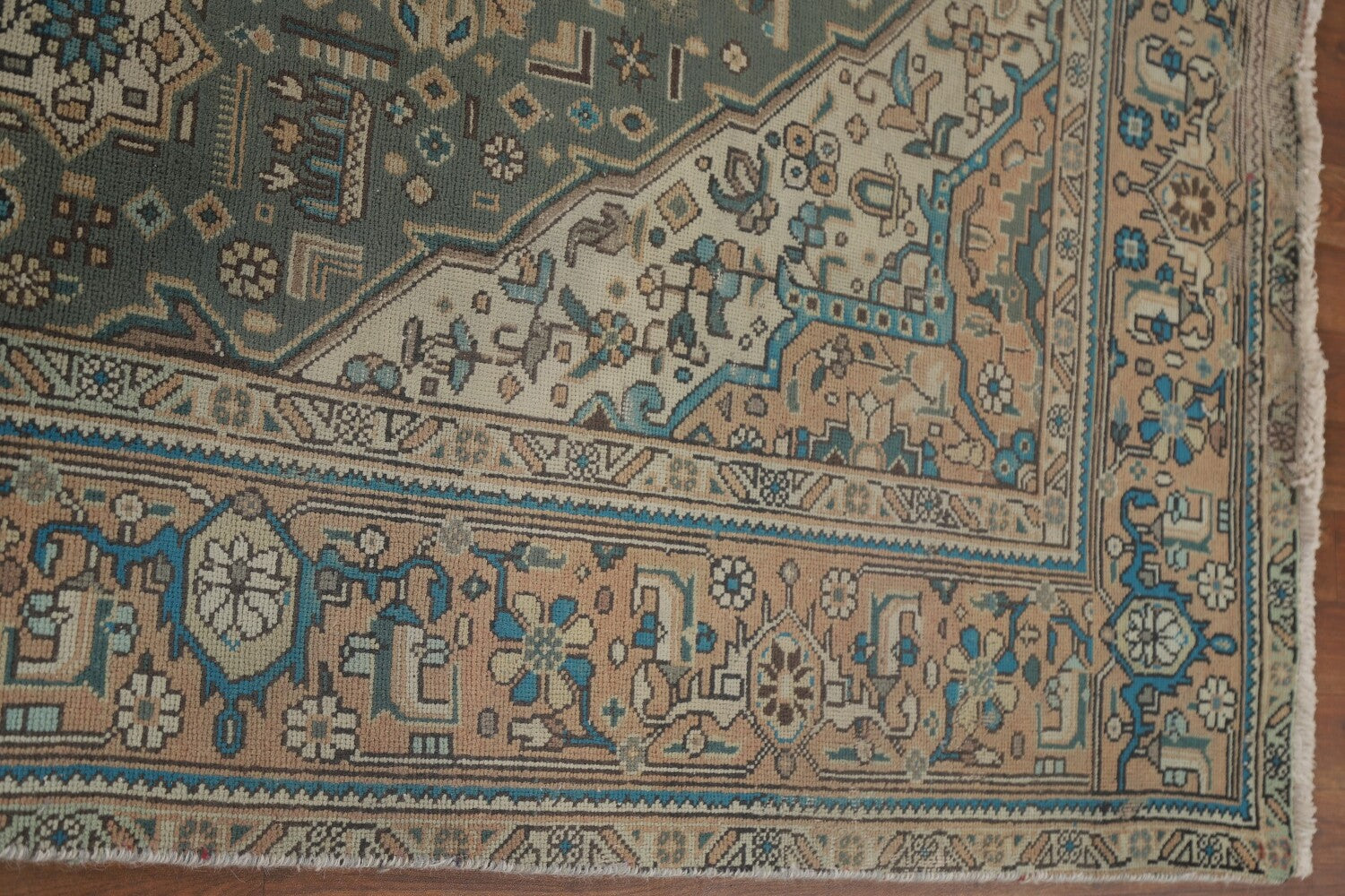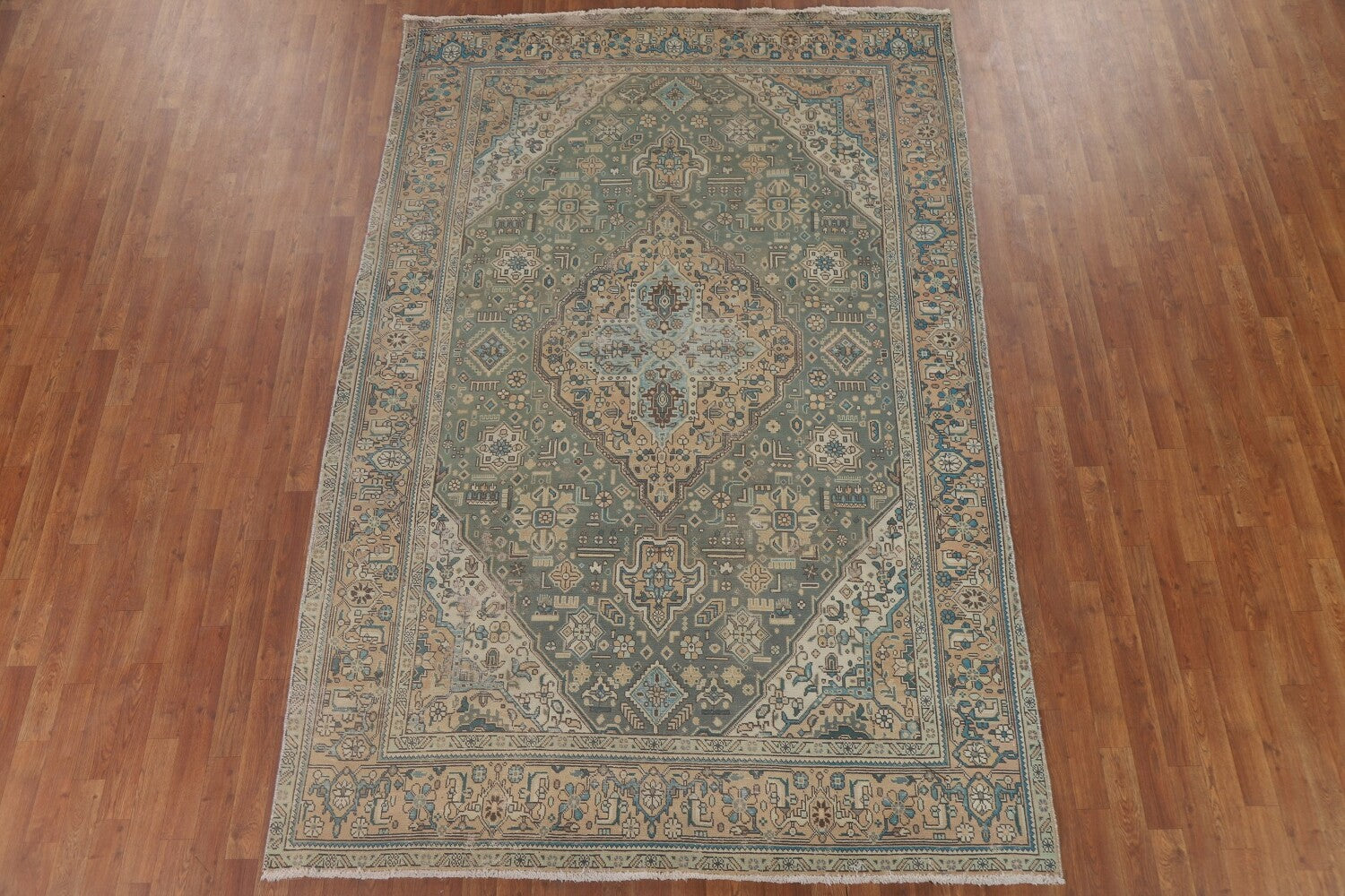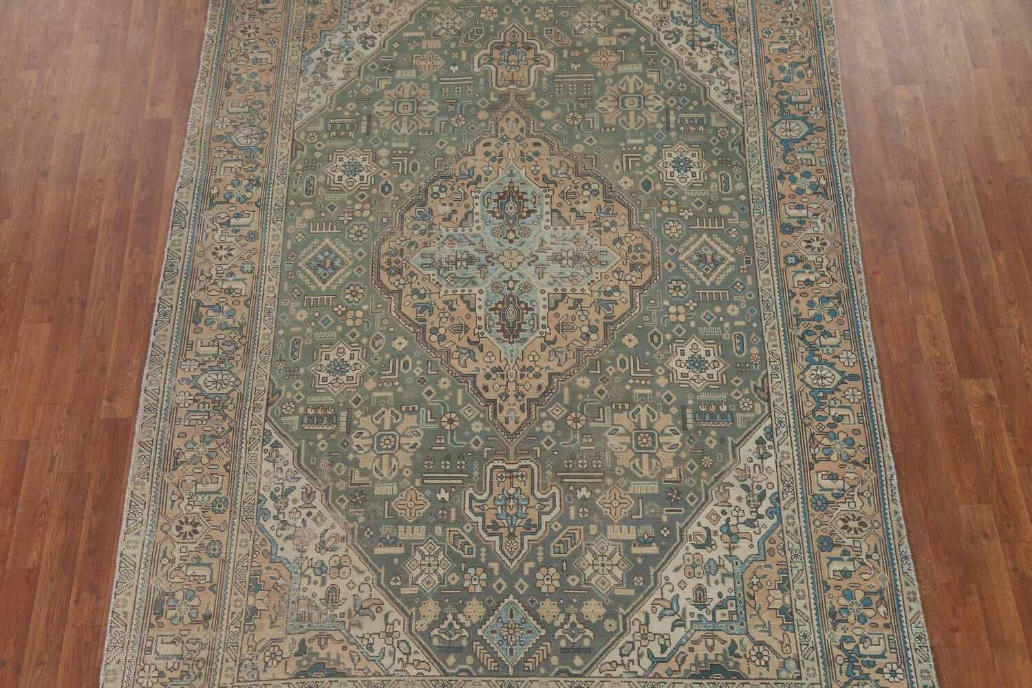A Beautiful Genuine Persia ( Persia ) Tabriz rug is Hand Knotted by skillful weavers in Persia ( Persia ) with 100% Wool Material. This rug is in Very Good (Evenly Low Pile-small Repair) condition. dimensions are 9' 8'' X 6' 5'' in foot and 295 X 196 in centimeter. the primary color is Green.